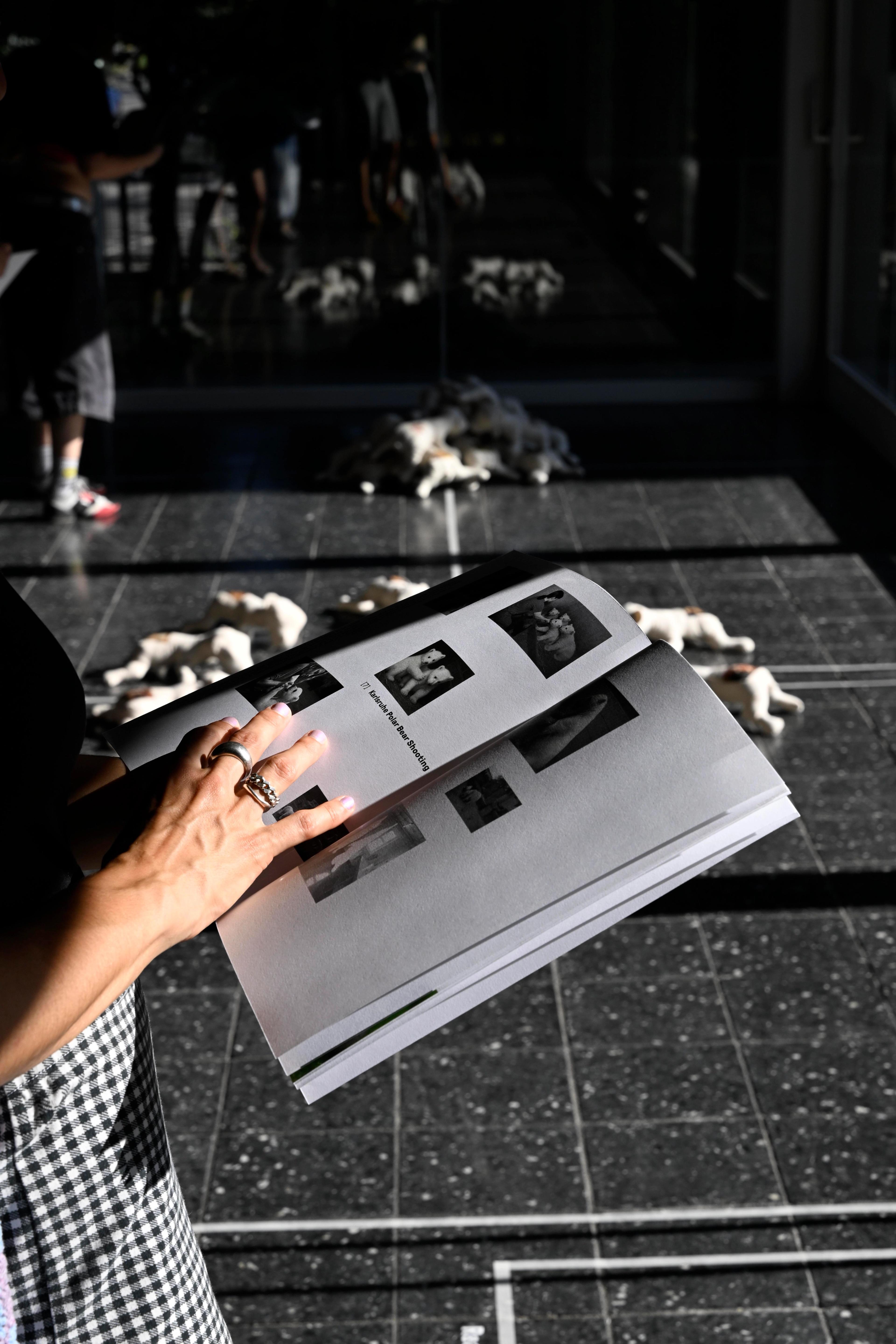Eingerahmt wird das Ganze von Überschriften der 12 Geschichten, die nach dem medialen Peak geordnet in chronologischer Reihenfolge um das Zentrum der Installation verlaufen und wiederum mit Kreppbändern, die über dem Boden verlaufen, miteinander verbunden sind. So entsteht ein Gitter, das Schnittstellen, Verknüpfungen und Parallelen zwischen den Geschichten aufzeigt und die Anordnung der Stofftiere bedingt.