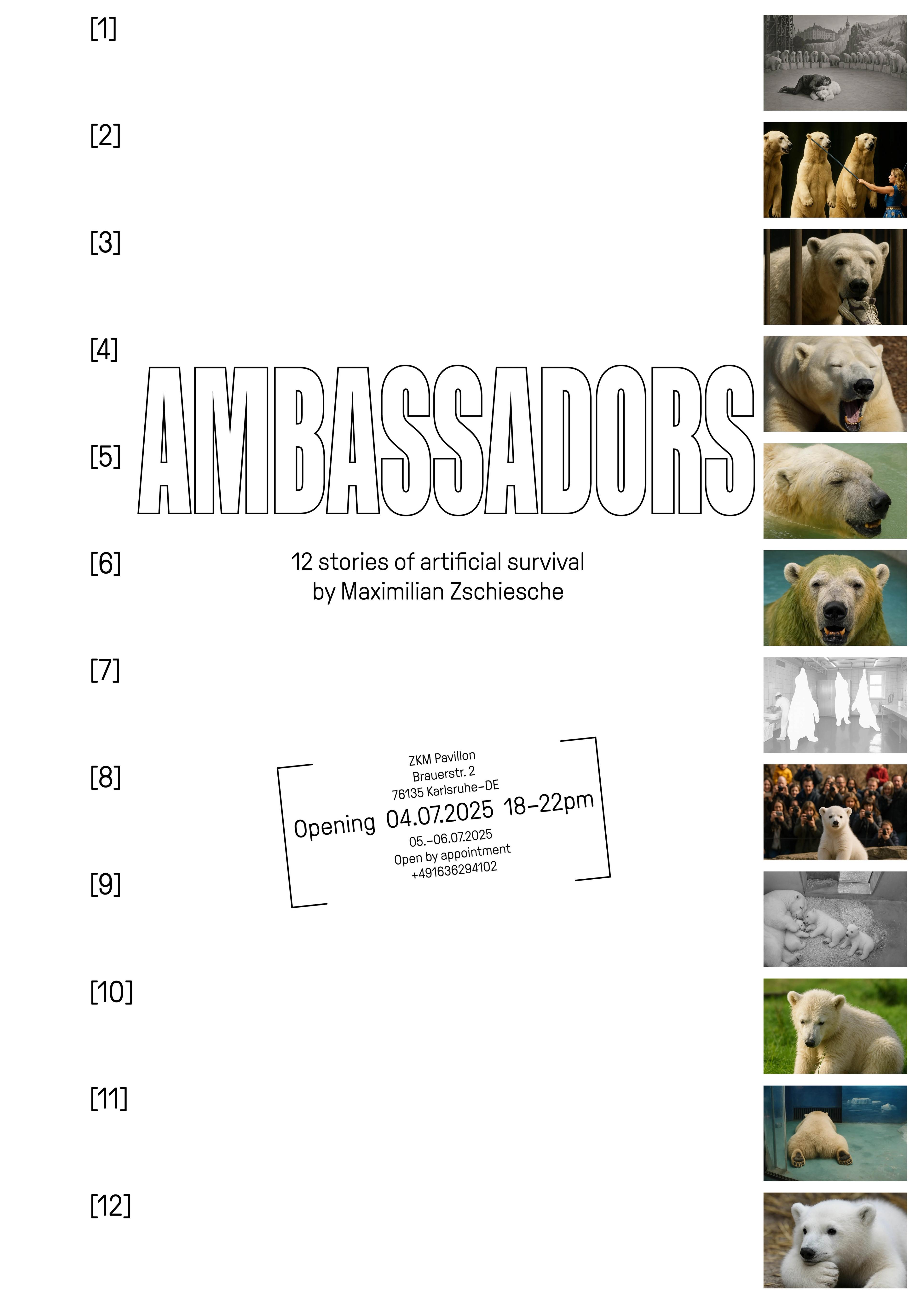 Die installative Sammlung zeigt visuell anhand der 12 medial größten Erzählungen von Eisbären in Gefangenschaft jedoch, dass im Laufe der Geschichte eine Population entstanden ist, die dem Menschen und damit dem Künstlichen bedingungslos ausgesetzt war und ist.