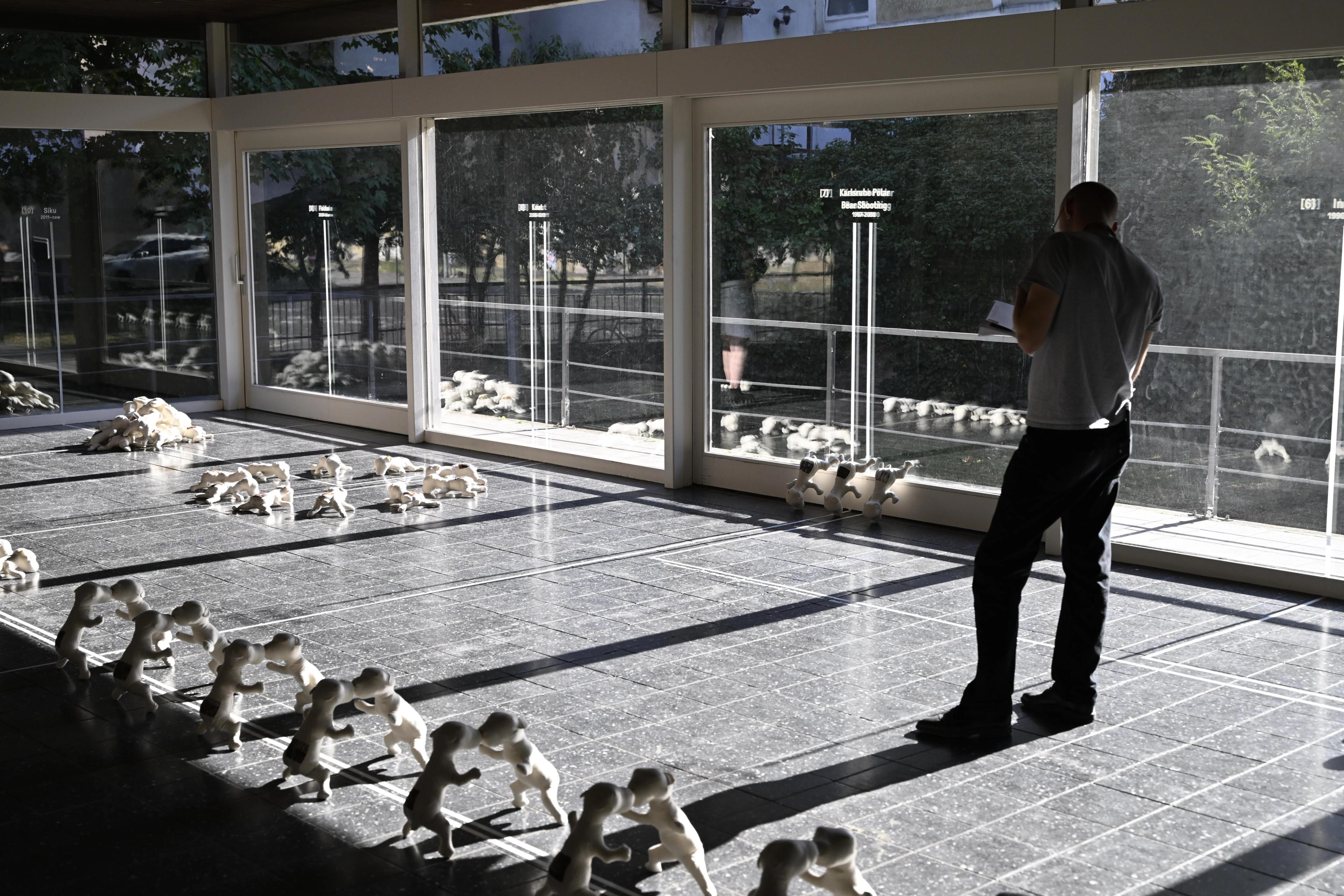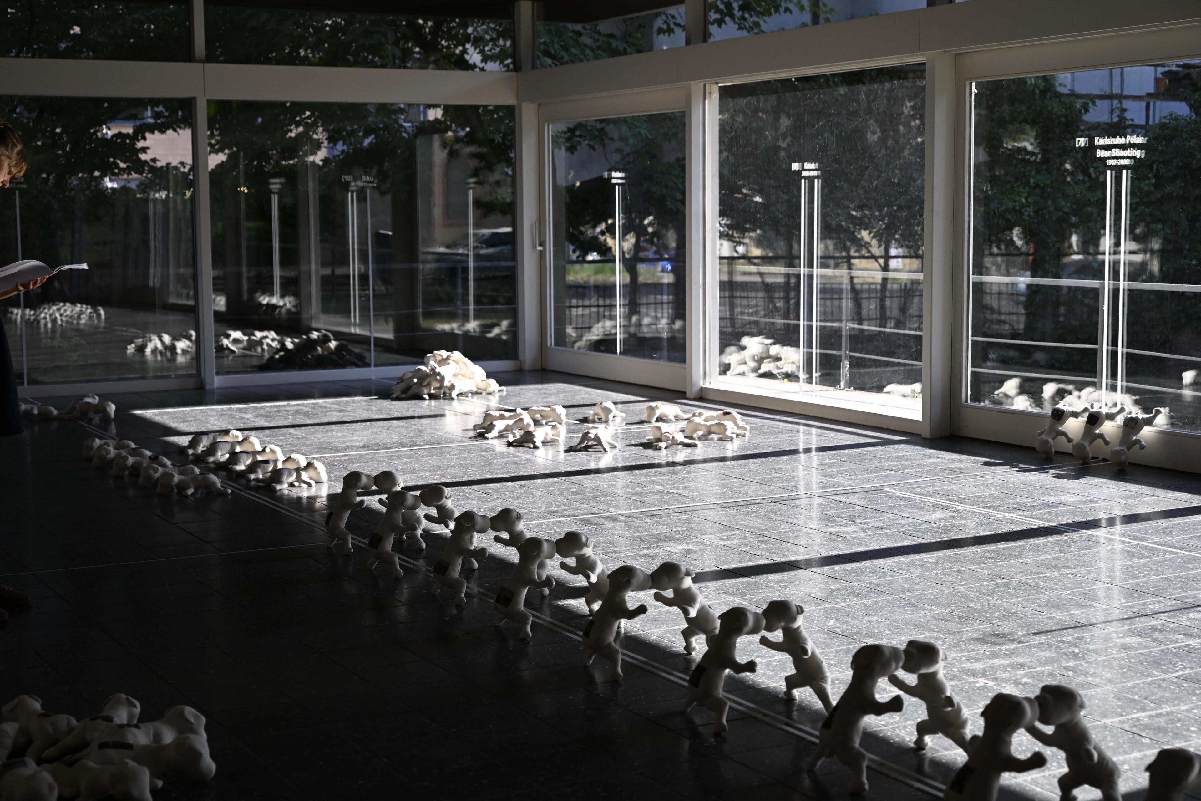So werden die Stofftiere in der Installation zu Botschaftern einer künstlichen Population und verlängern damit, ohne Lebewesen Leid zuzufügen, die Ketten an Abbildungen von Abbildungen von etwas, das mal natürlich war.