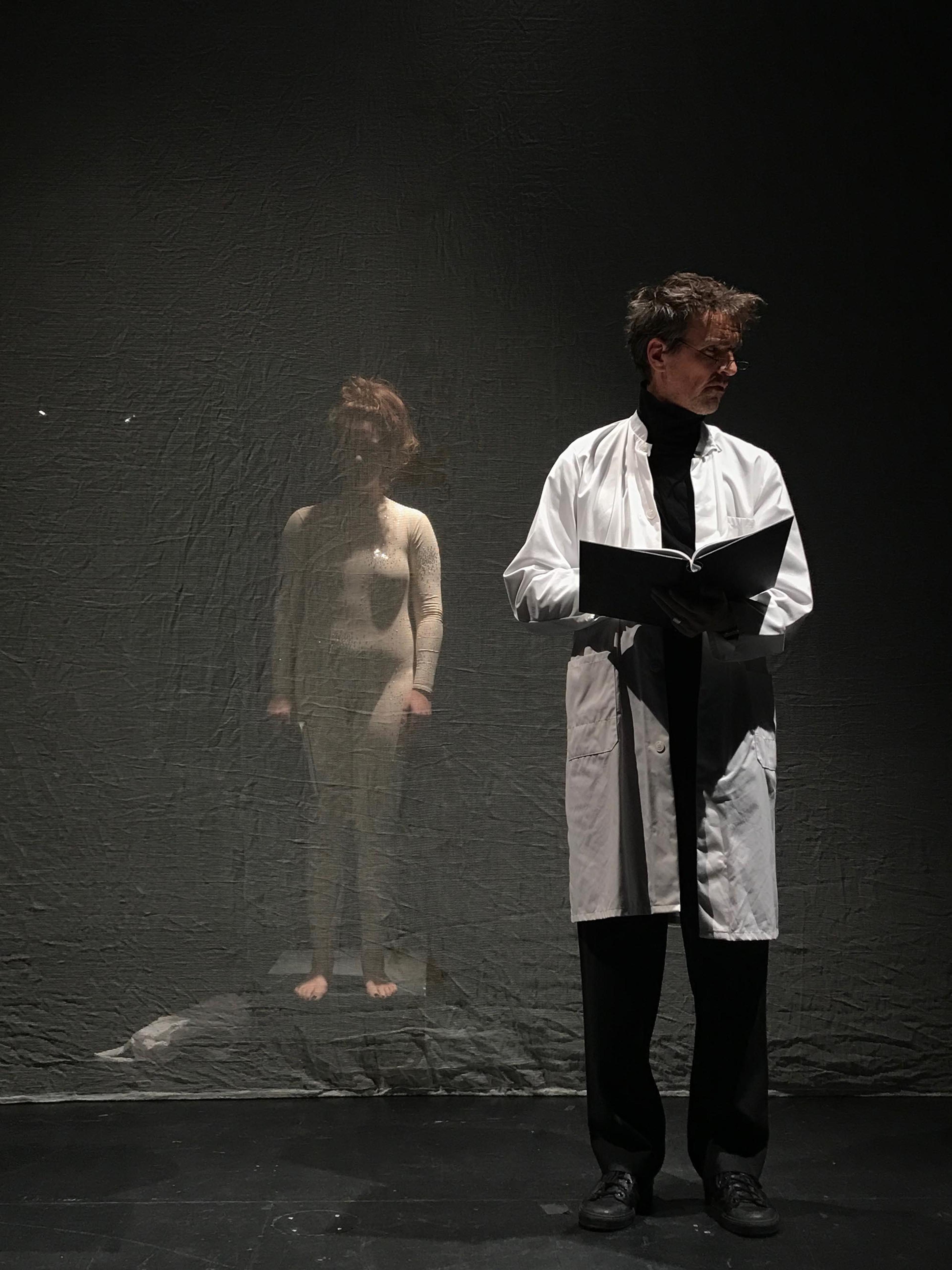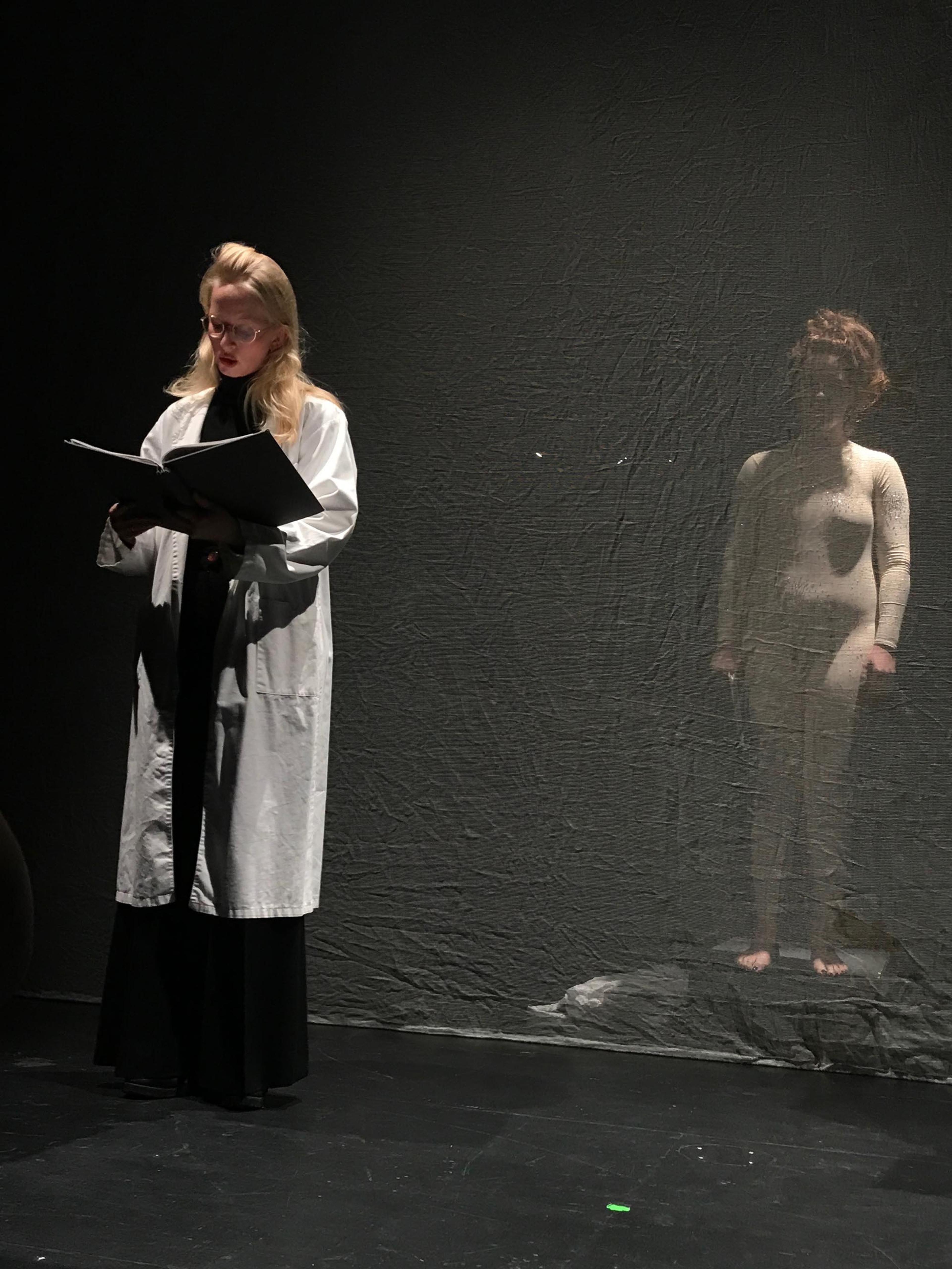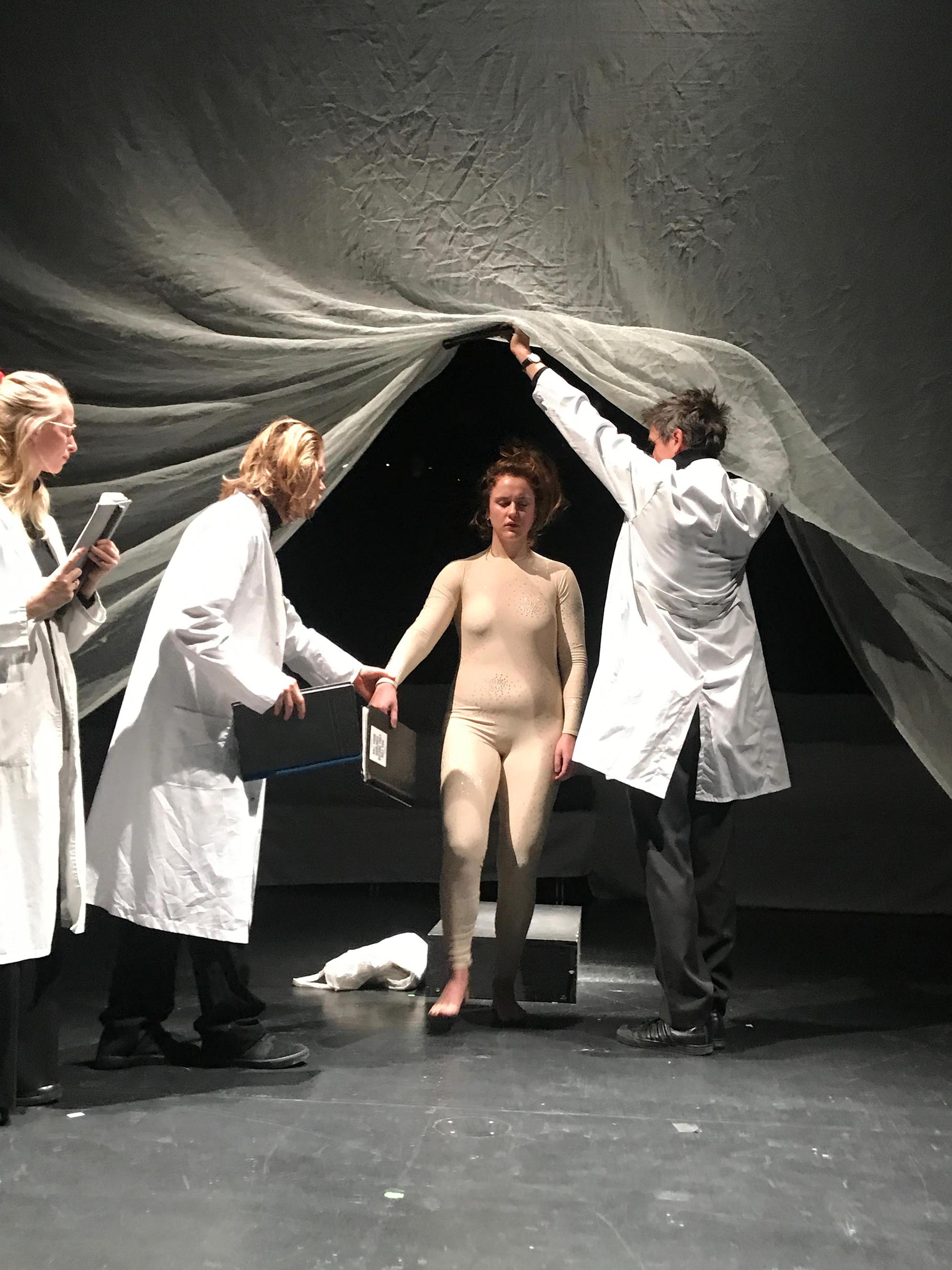 Im zweiten, sehr realistisch anmutenden Teil, bei dem sich die Zuschauer auf der anderen Seite des Vorhangs befinden, stehen die drei Schauspieler nun auf der Publikumsseite des Vorhangs in den Rollen dreier Wissenschaftler. Ada, jetzt als Roboter, steht leicht beleuchtet hinter dem Vorhang und scheint wie eine Traumvorstellung trüb durch den Stoff. In dem Moment, als sie zu eigenständigem Leben erwacht, wechselt sie die Seite des Vorhangs, tritt aus dem Traum und übernimmt die Realität.