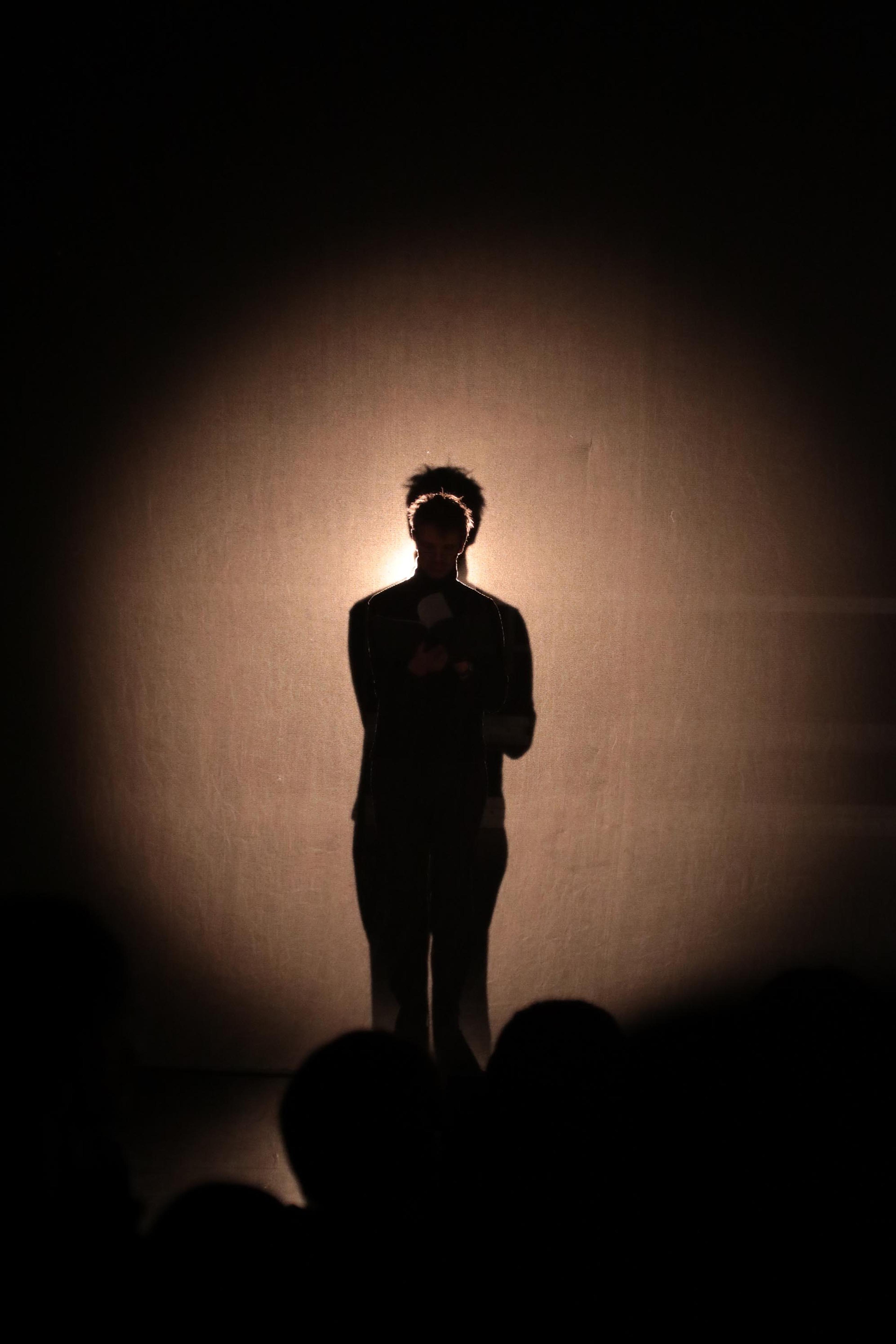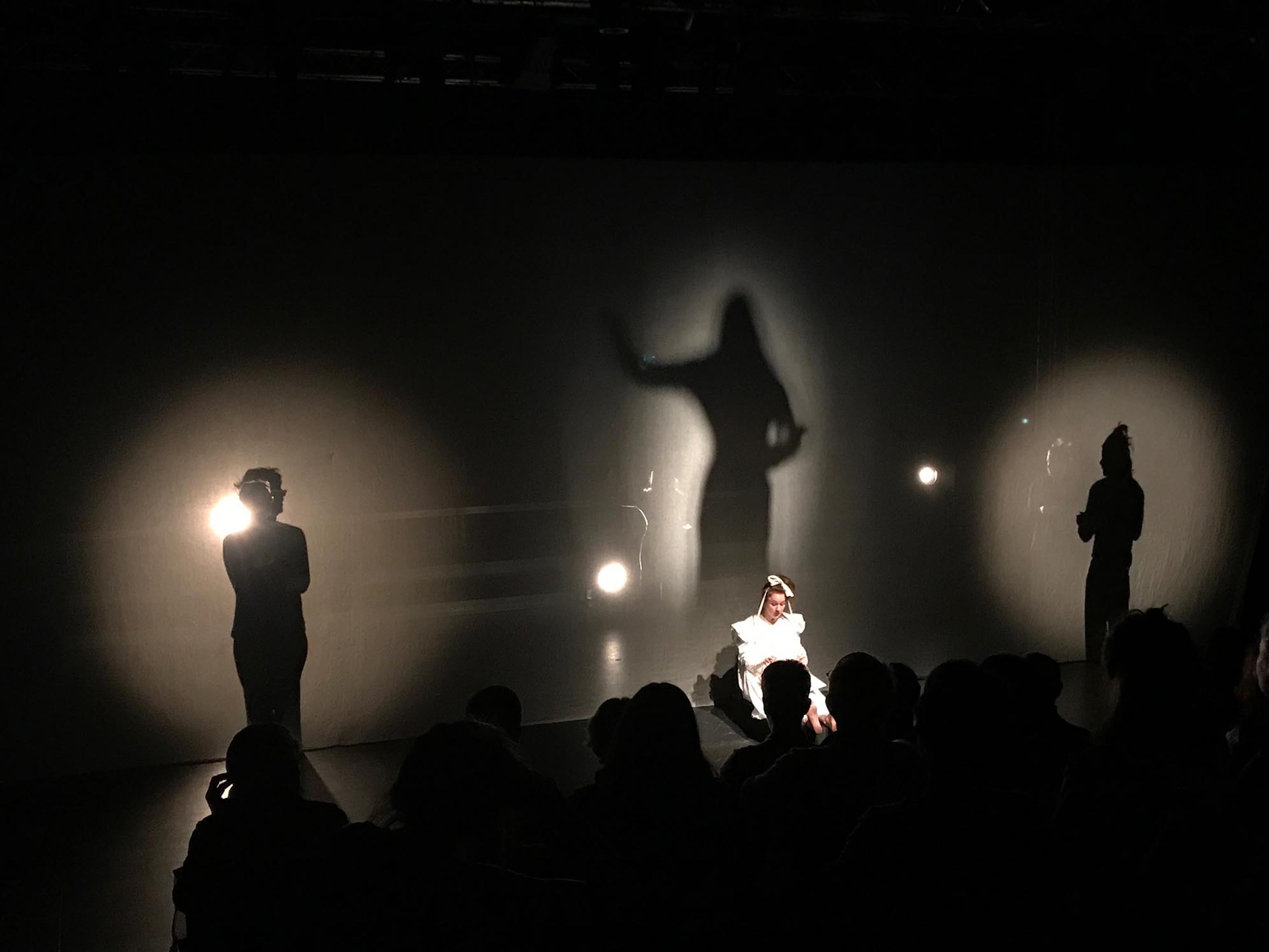 Unsere Kulisse bestand aus einem leicht durchscheinenden Vorhang, der die Bühne in der Mitte teilt. Im ersten Teil des Stücks saßen die Zuschauer auf der Tribüne, für den zweiten Teil wechselten sie die Seite des Vorhangs und saßen dann auf niedrigen Podesten auf der Rückseite der Bühne.