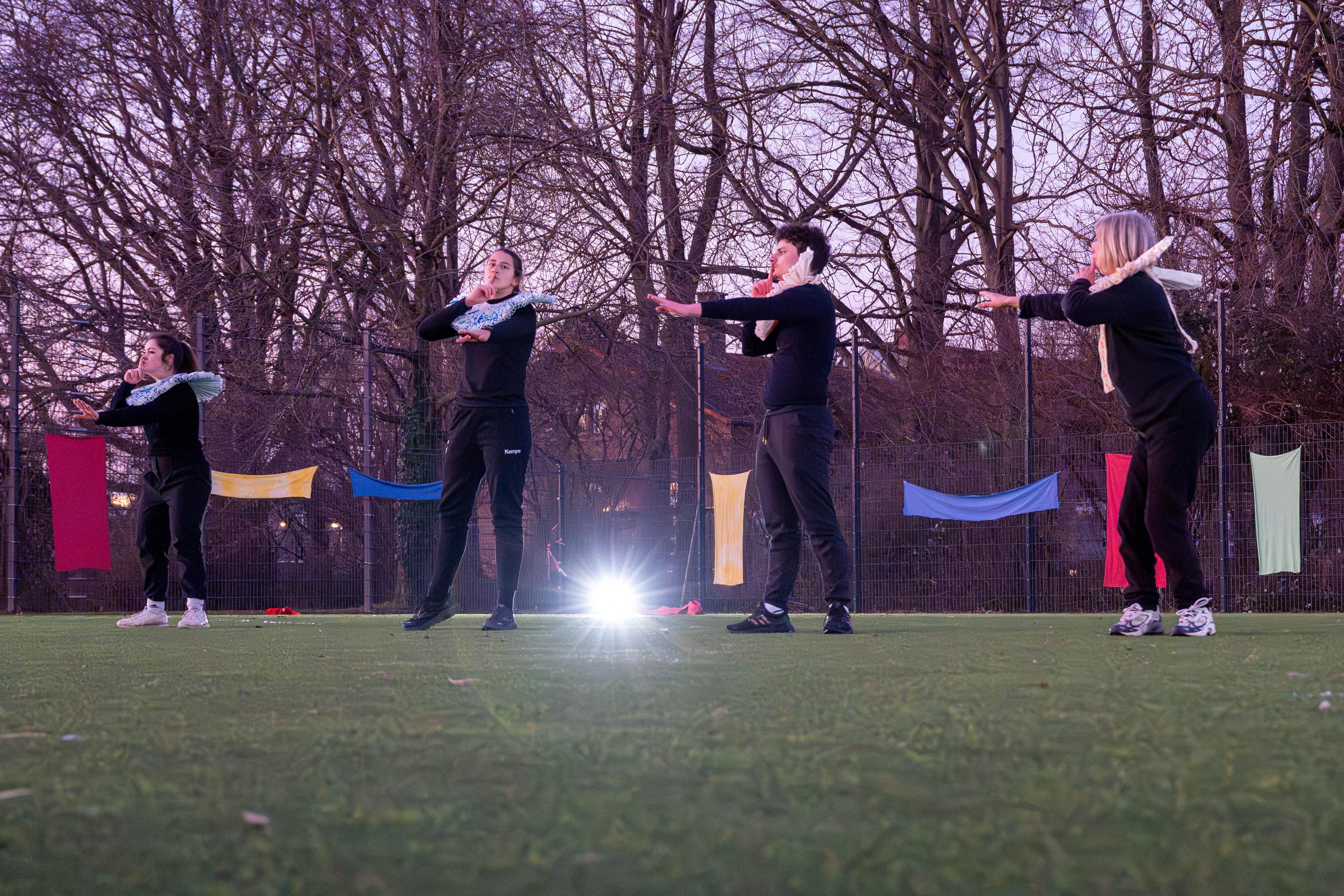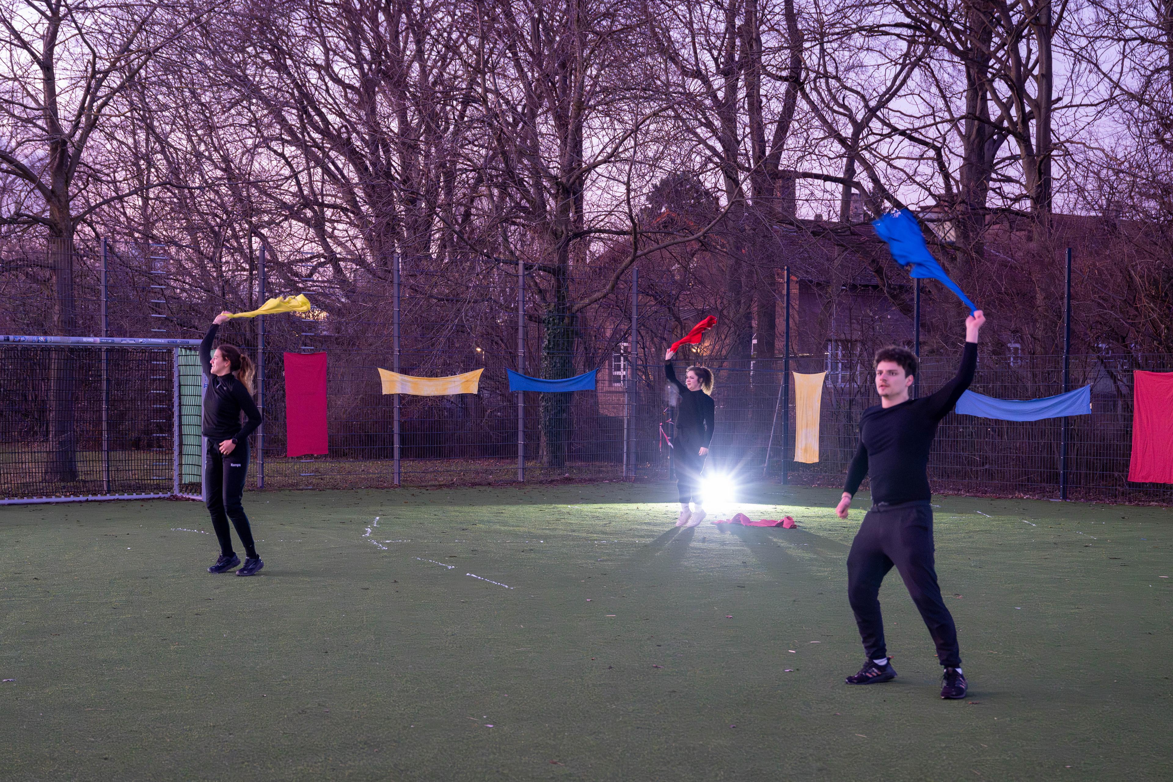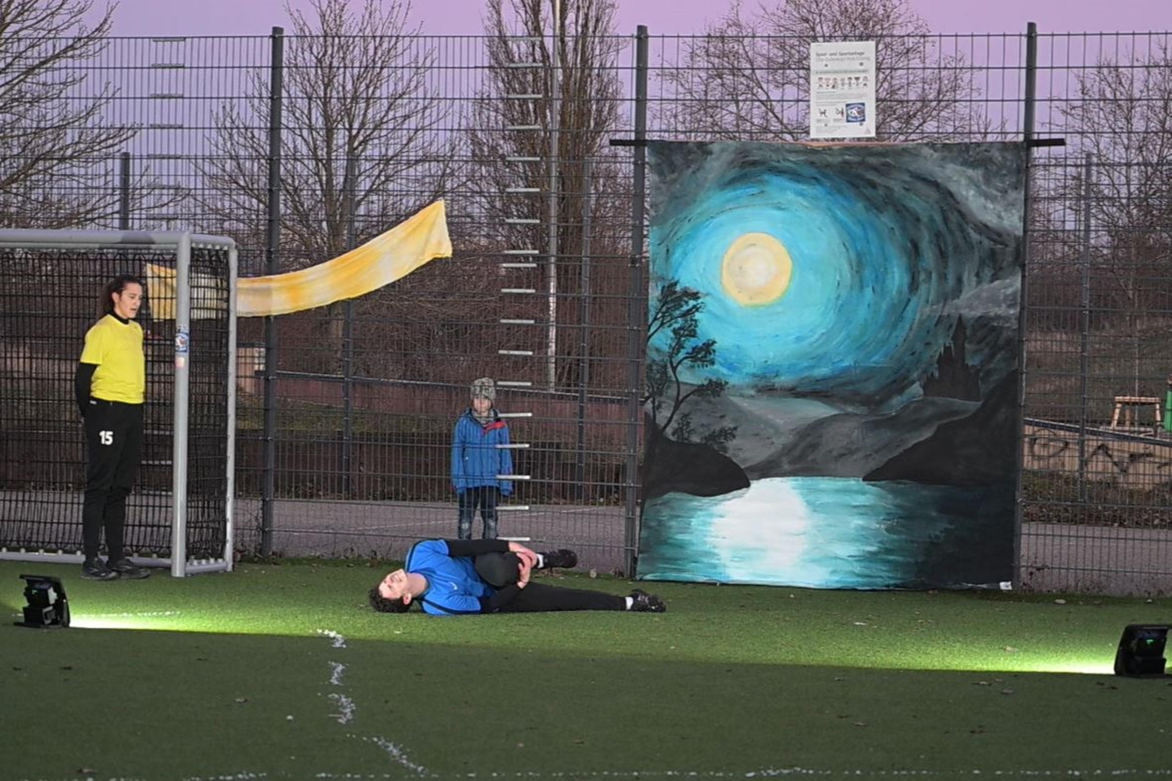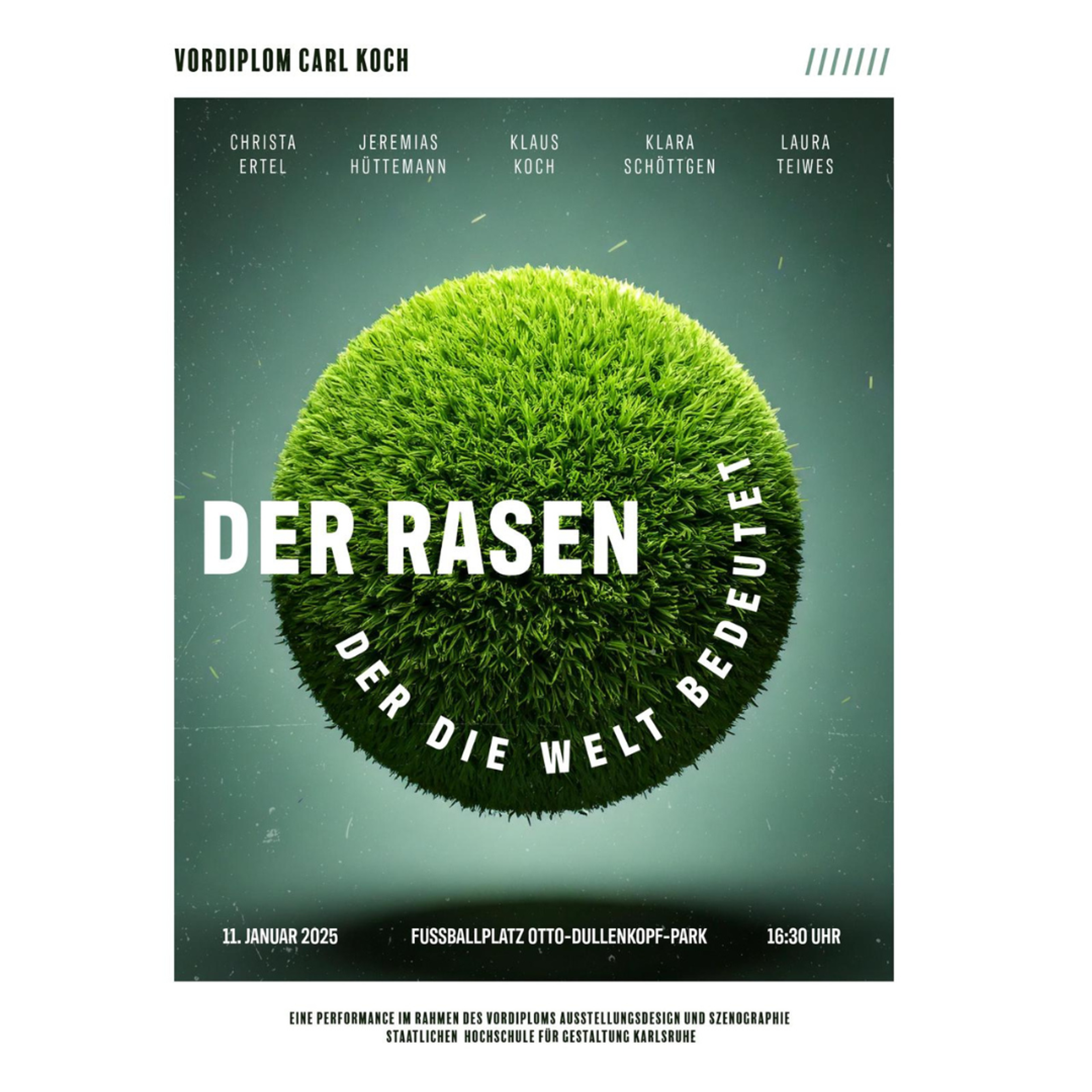 Inwiefern verbergen sich inszenatorische Strukturen und theatrale Elemente im Fußball? Die Arbeit „DER RASEN, DER DIE WELT BEDEUTET“ ist eine performative Auseinandersetzung mit den inszenatorischen und theatralischen Aspekten im Fußball, aus dem Blickwinkel des Theaters beleuchtet. Die Performance bedient sich dabei klassischer Theatermittel und gibt Einblicke, wie Inszenierung, Choreografie und Darstellung eine Rolle im Fußball spielen. In sechs Szenen werden Bereiche aufgezeigt, in denen inszenatorische und theatrale Muster erkennbar sind, wie beispielsweise Taktikspiel, Schwalbe, Torjubel oder Fankultur. Anhand dieser sportlichen Momente nähert sich das Geschehen auf dem Fußballplatz mehr und mehr einer Dramaturgie. Verkörpert wird dies von einer Gruppe aus Performer*innen, die teils aus dem Bereich Fußball, teils aus dem Theaterwelt kommen. Die klassische Aufwärmsituation wird schrittweise zum Tanz, Spielzüge werden zu visuellen Grafiken, der Zweikampf vor dem Tor wird zum „Schwanensee des Rasens“ und der Torjubel steigert sich ins Absurde. In der Performance verbinden sich zunehmend theatralische und fußballerische Momente, bis sich schließlich pöbelnde Fußballfans in einer Szene aus Shakespeares Romeo und Julia wiederfinden. So wie die Szenen in sich zunehmend hybrider werden, wird es auch die Performance als Ganze. Ebenso werden die Zuschauer*innen Teil der Szenerie und die klassische Grenze zwischen Publikum und Performer*innen wird durchbrochen. Sie verlassen ihre passive Beobachterrolle, in dem sie aktiv den bespielten Raum des Fußballplatzes mitgestalten und finden sich sogar zum Schluss selbst in der Position der Spieler*innen auf dem Rasen wieder. Die teils satirische Collage hinterfragt und deckt die unterschiedlichen Formen von Kunst in typischen Handlungen im Fußballsport auf.