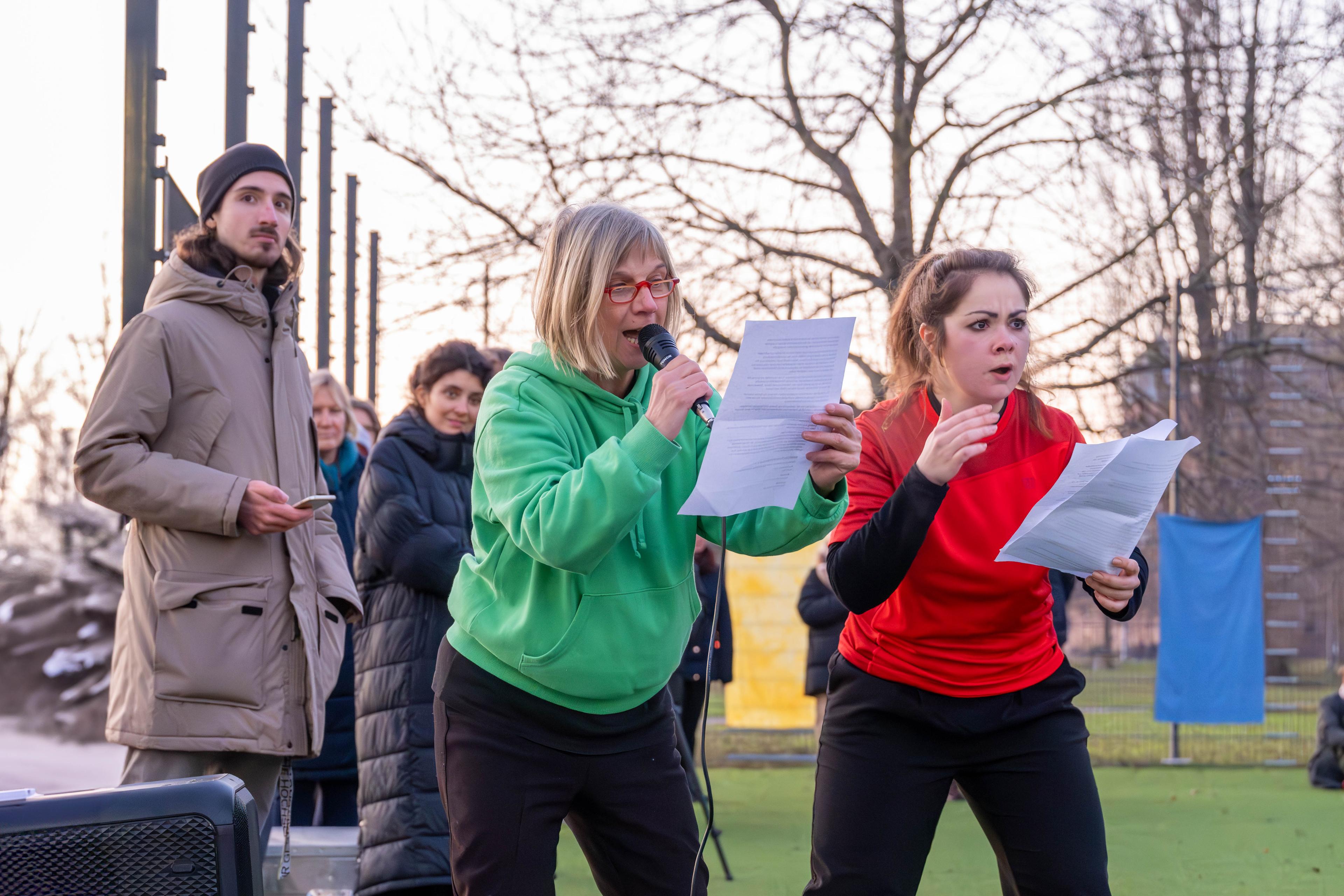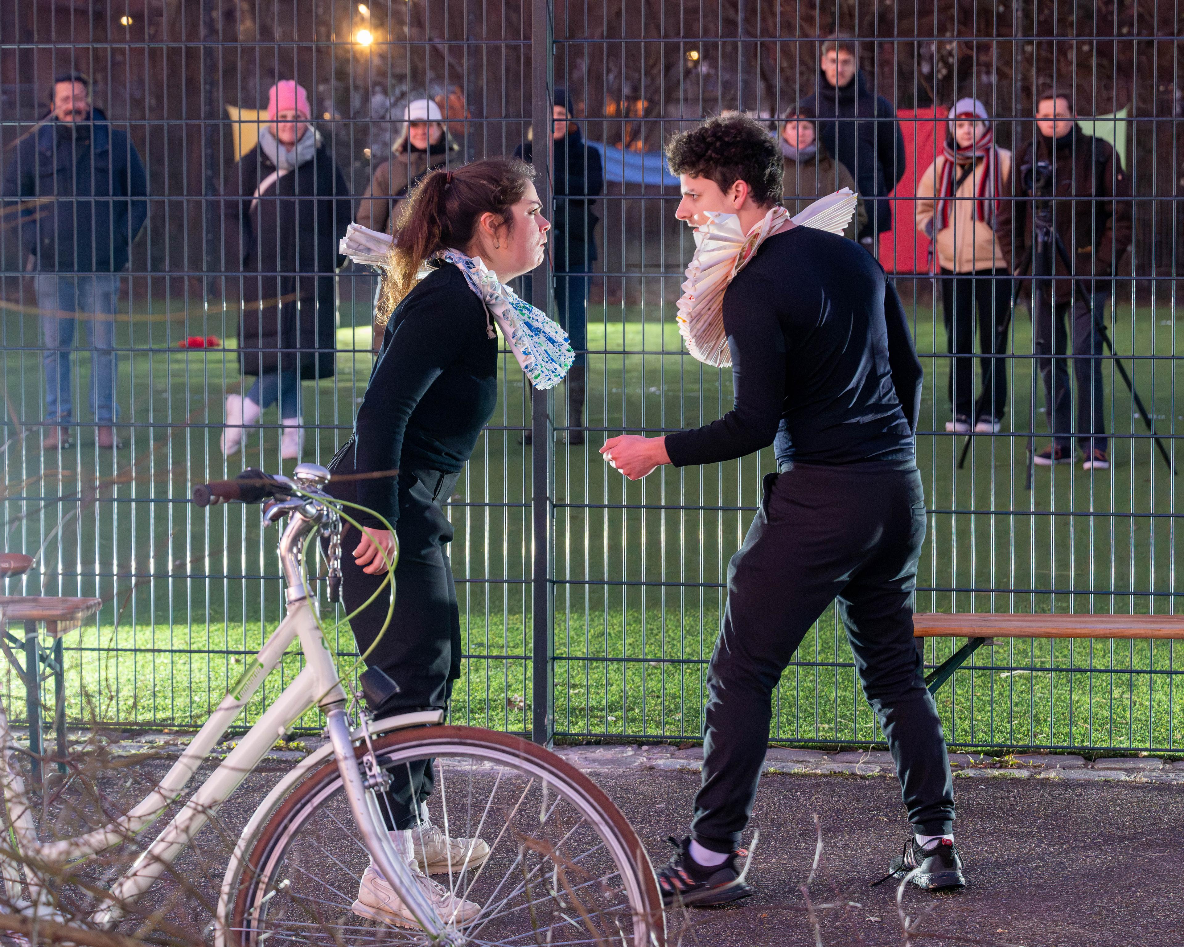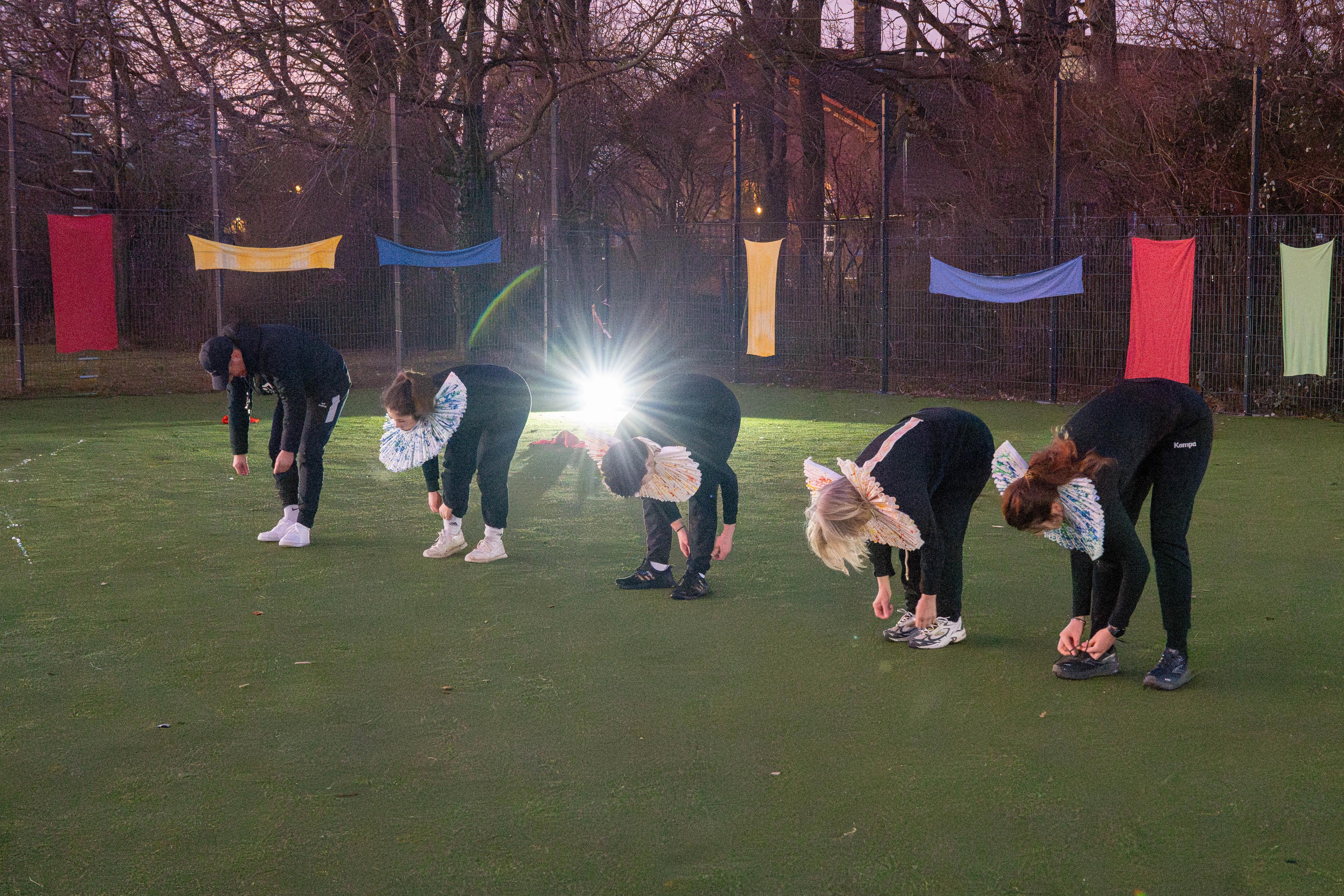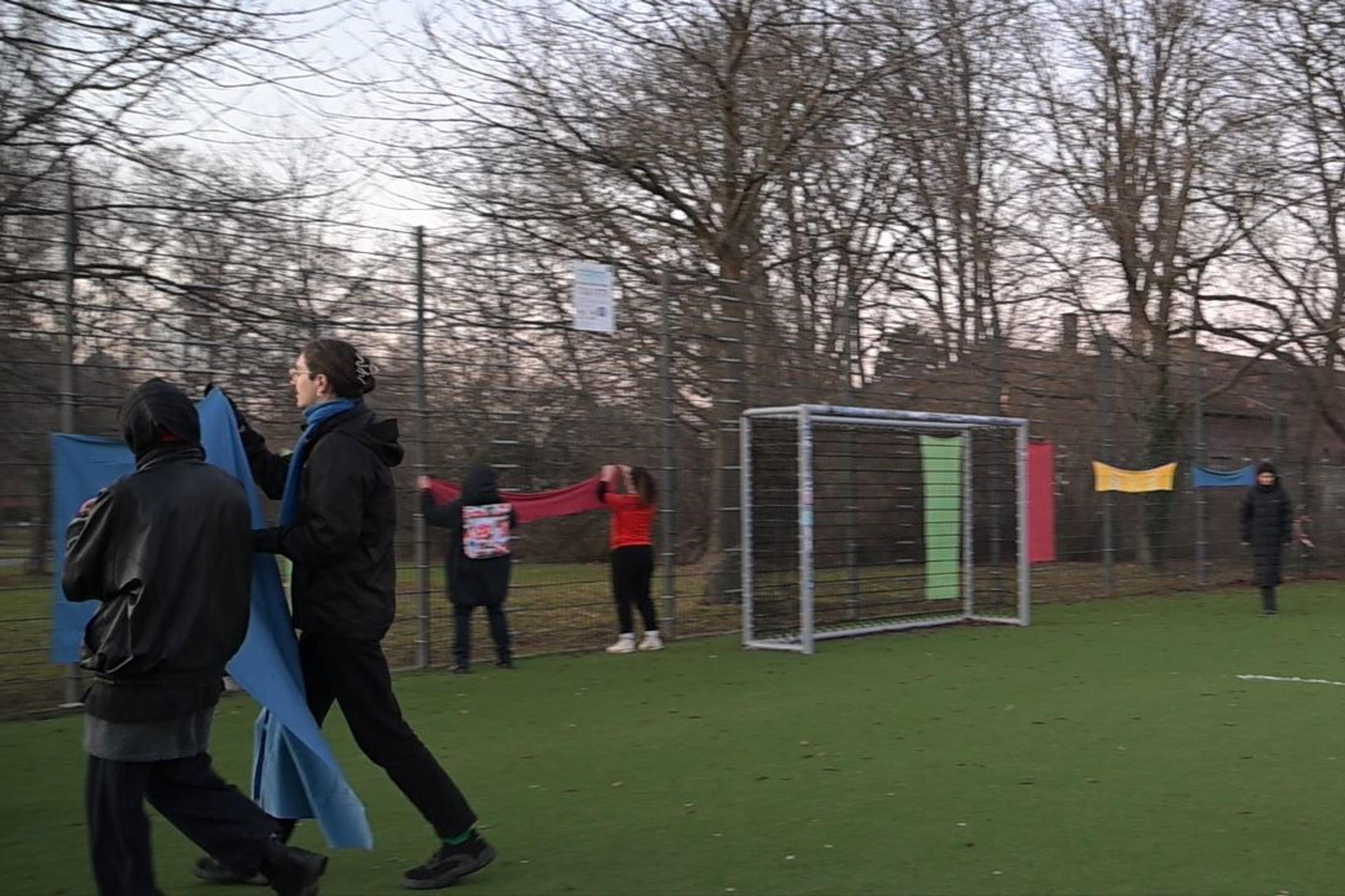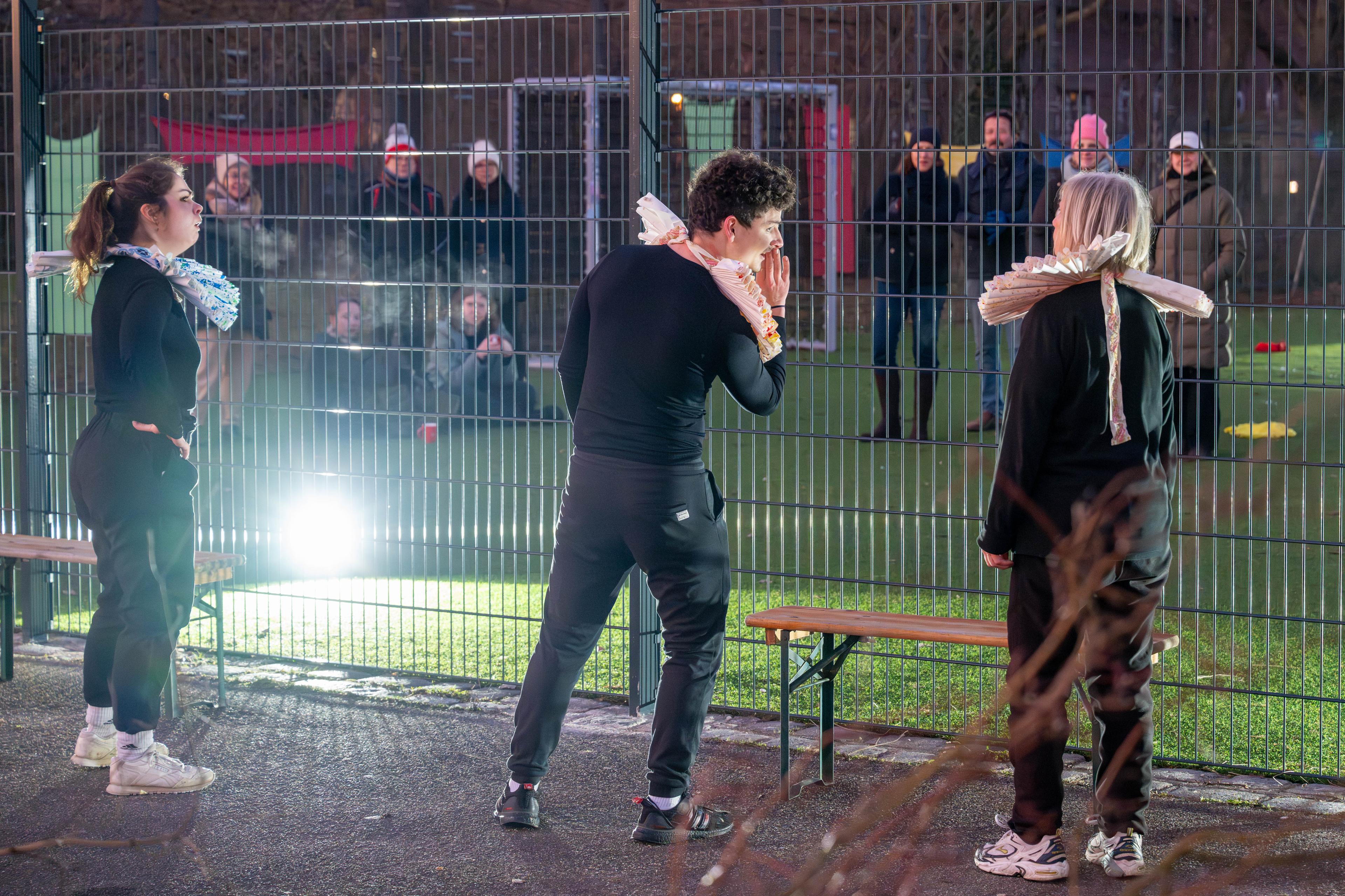 Inwiefern verbergen sich inszenatorische Strukturen und theatrale Elemente im Fußball? Die Arbeit „DER RASEN, DER DIE WELT BEDEUTET“ ist eine performative Auseinandersetzung mit den inszenatorischen und theatralischen Aspekten im Fußball, aus dem Blickwinkel des Theaters beleuchtet. Die Performance bedient sich dabei klassischer Theatermittel und gibt Einblicke, wie Inszenierung, Choreografie und Darstellung eine Rolle im Fußball spielen. In sechs Szenen werden Bereiche aufgezeigt, in denen inszenatorische und theatrale Muster erkennbar sind, wie beispielsweise Taktikspiel, Schwalbe, Torjubel oder Fankultur. Anhand dieser sportlichen Momente nähert sich das Geschehen auf dem Fußballplatz mehr und mehr einer Dramaturgie. Verkörpert wird dies von einer Gruppe aus Performer*innen, die teils aus dem Bereich Fußball, teils aus dem Theaterwelt kommen. Die klassische Aufwärmsituation wird schrittweise zum Tanz, Spielzüge werden zu visuellen Grafiken, der Zweikampf vor dem Tor wird zum „Schwanensee des Rasens“ und der Torjubel steigert sich ins Absurde. In der Performance verbinden sich zunehmend theatralische und fußballerische Momente, bis sich schließlich pöbelnde Fußballfans in einer Szene aus Shakespeares Romeo und Julia wiederfinden. So wie die Szenen in sich zunehmend hybrider werden, wird es auch die Performance als Ganze. Ebenso werden die Zuschauer*innen Teil der Szenerie und die klassische Grenze zwischen Publikum und Performer*innen wird durchbrochen. Sie verlassen ihre passive Beobachterrolle, in dem sie aktiv den bespielten Raum des Fußballplatzes mitgestalten und finden sich sogar zum Schluss selbst in der Position der Spieler*innen auf dem Rasen wieder. Die teils satirische Collage hinterfragt und deckt die unterschiedlichen Formen von Kunst in typischen Handlungen im Fußballsport auf.