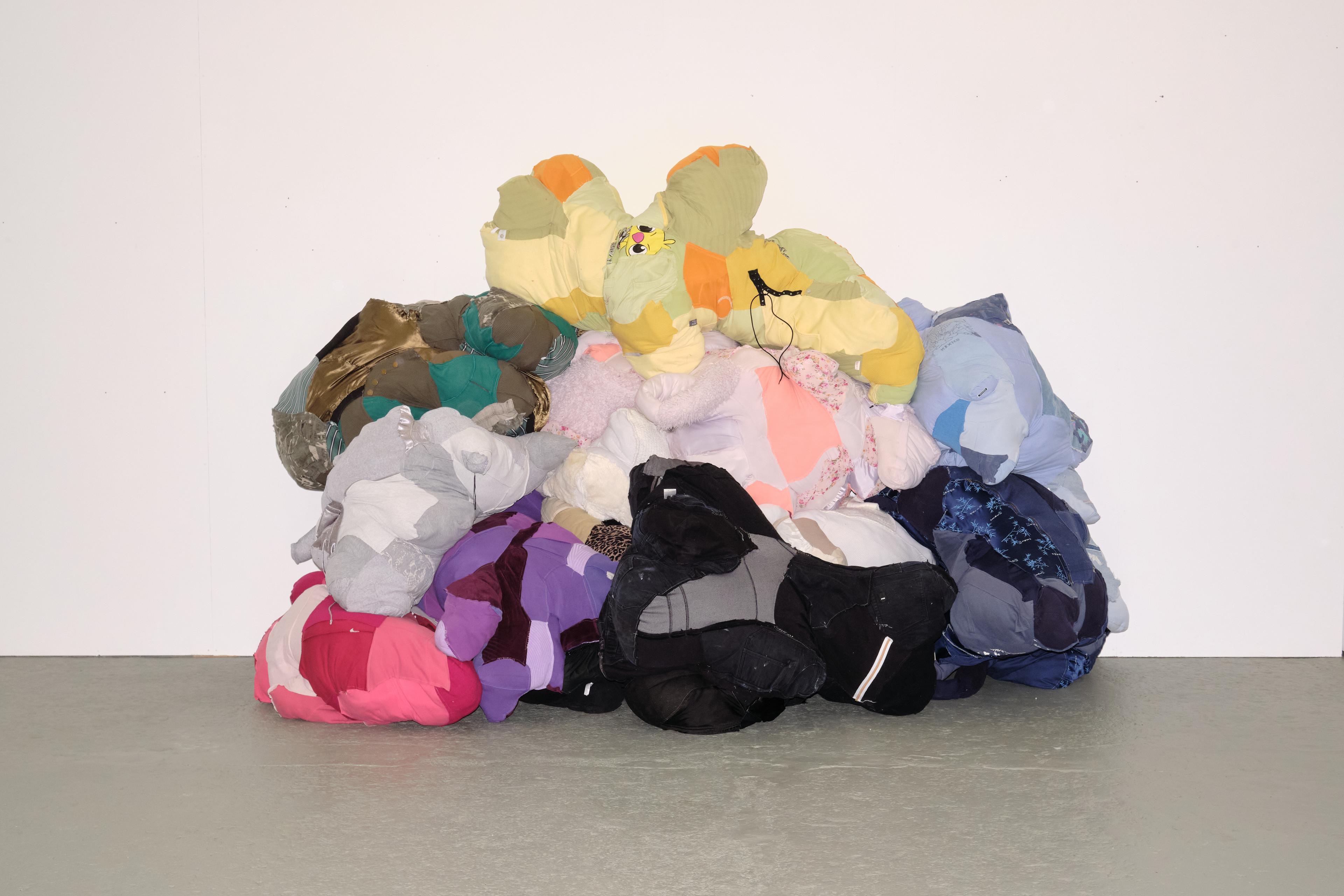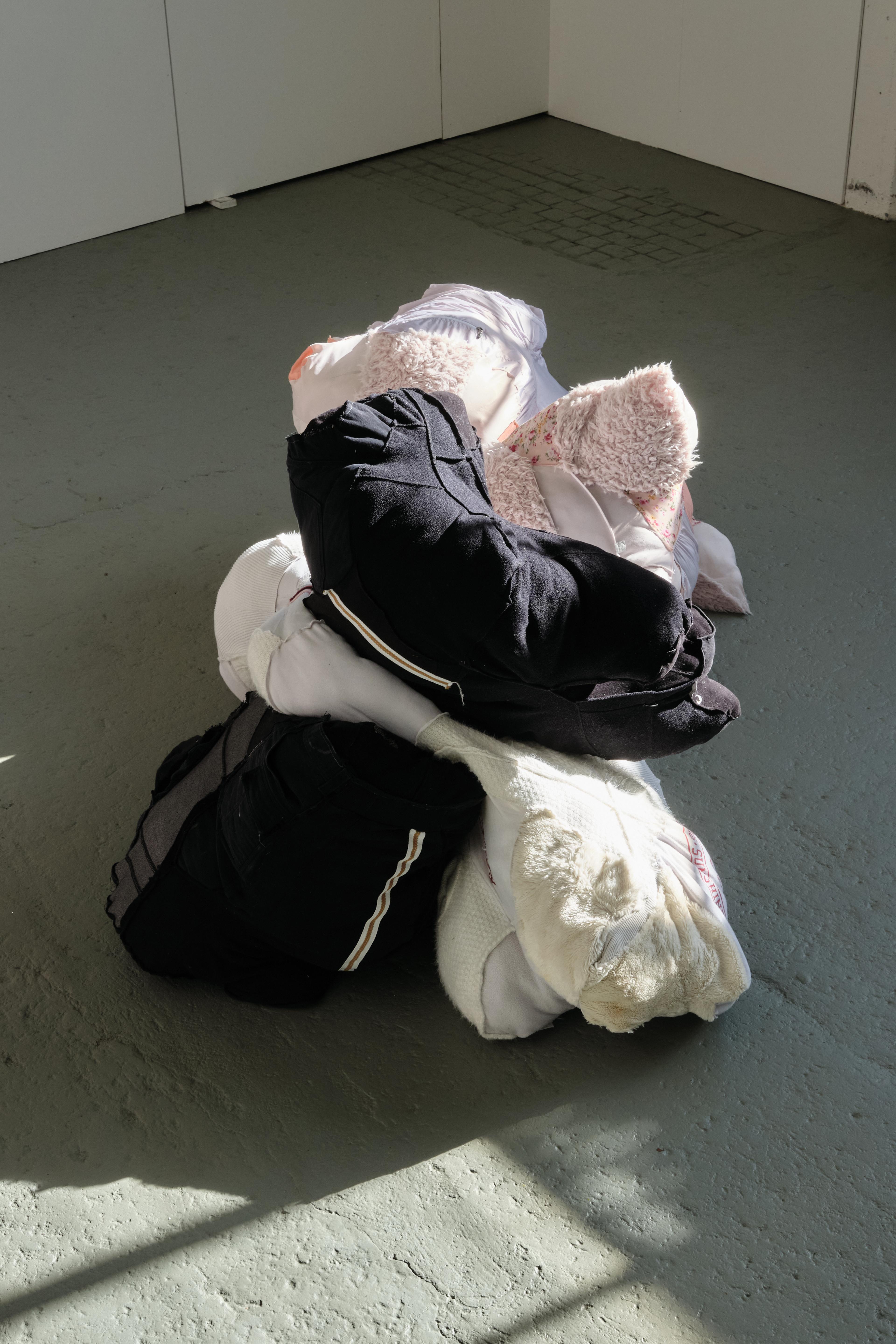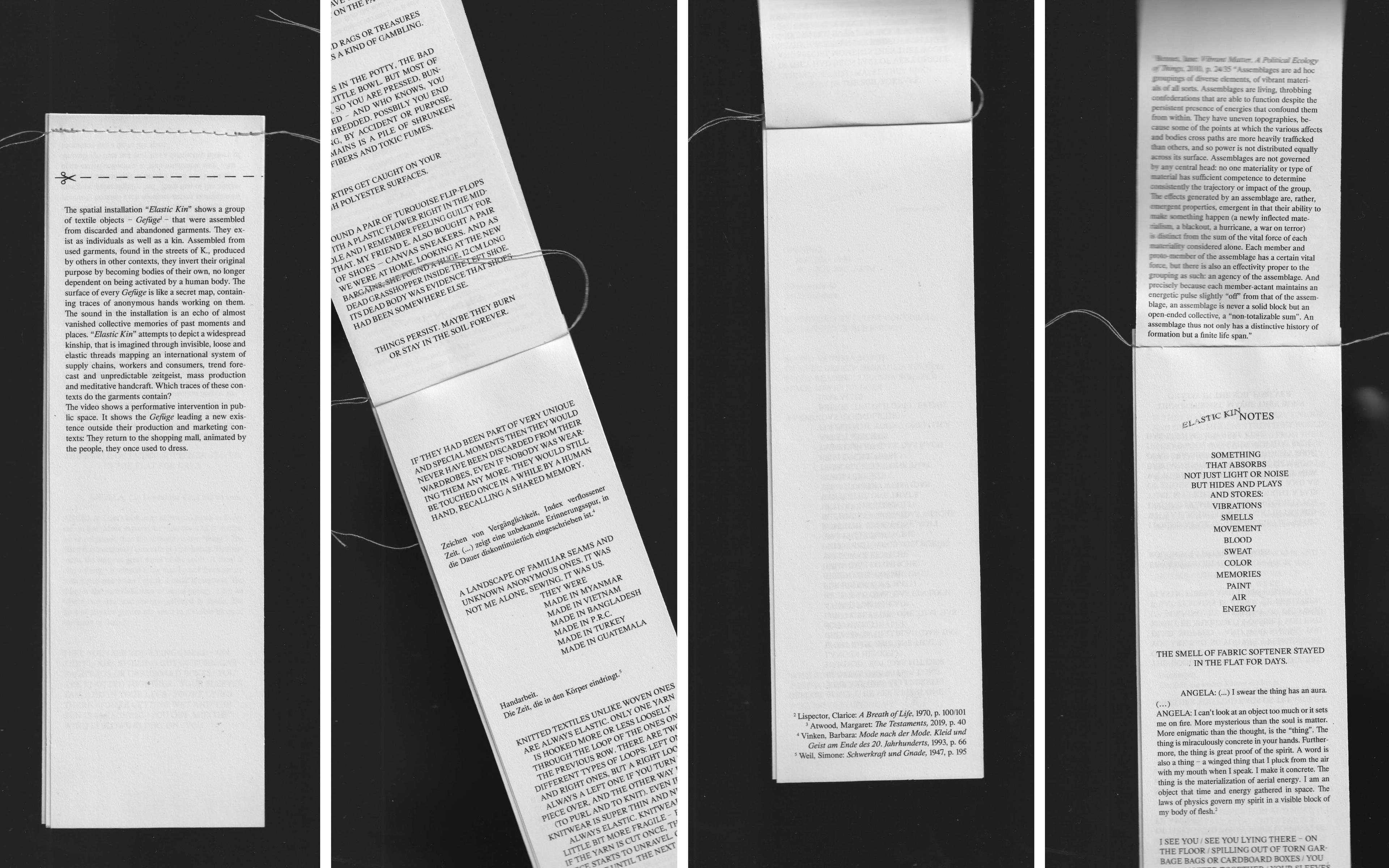 Die Rauminstallation “Elastic Kin” zeigt eine Gruppe von Textilobjekten - Gefüge1 , die aus weggeworfenen Kleidungsstücken bestehen. Sie existieren sowohl als Individuen als auch als Gruppe. Die Kleidungsstücke, die in den Straße von K. gefunden wurden und von Anderen in anderen Kontext hergestellt worden sind, kehren ihren ursprünglichen Zweck um, indem sie zu eigenen Körpern werden, die unabhängig von menschlichen Körpern sind. Jede Oberfläche ist wie eine geheime Landkarte, die Spuren anonymer Hände enthält, die an den Textilien gearbeitet haben. Der Sound der Installation ist ein Echo - fast verschwundener, kollektiver Erinnerungen an vergangene Momente und Orte.