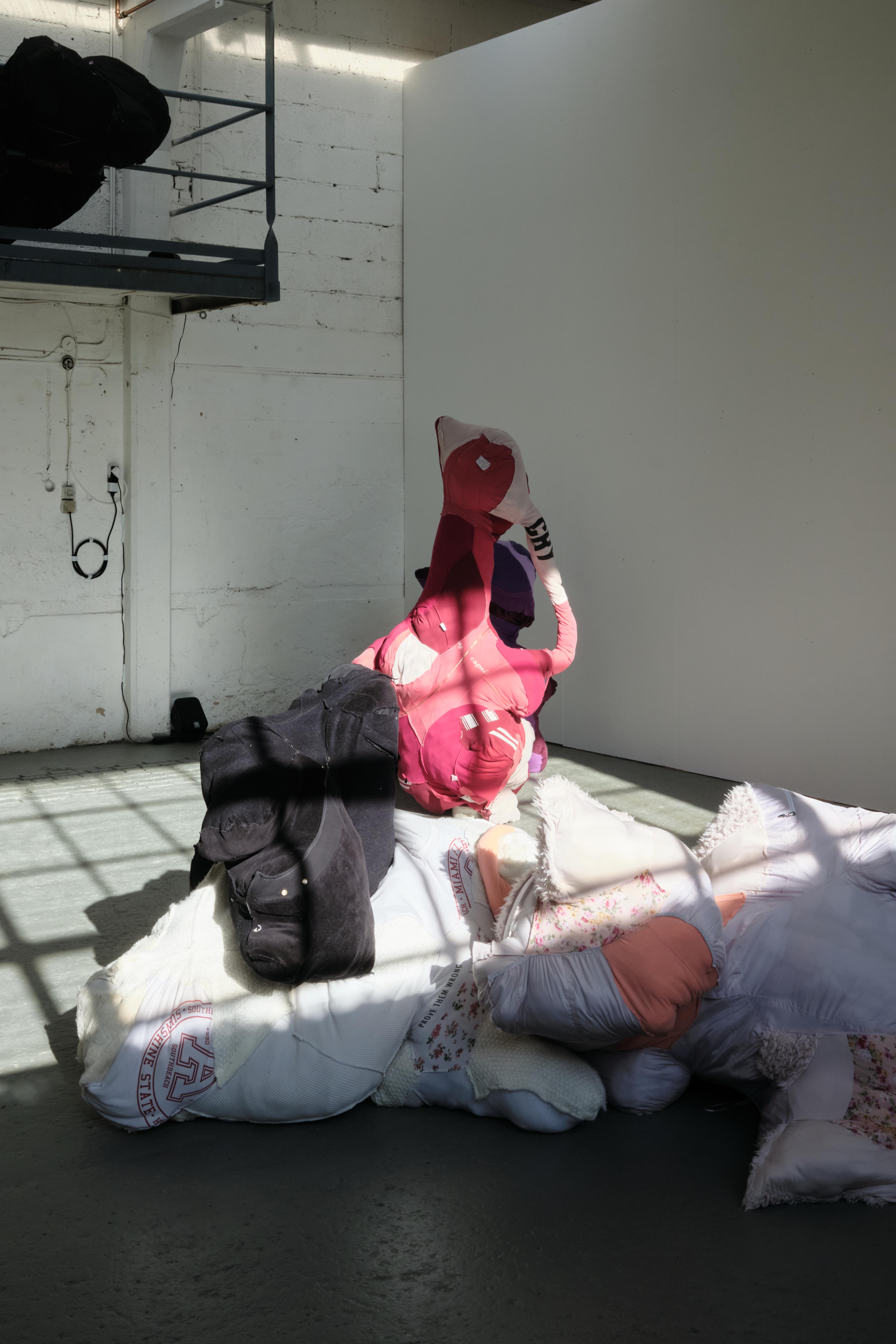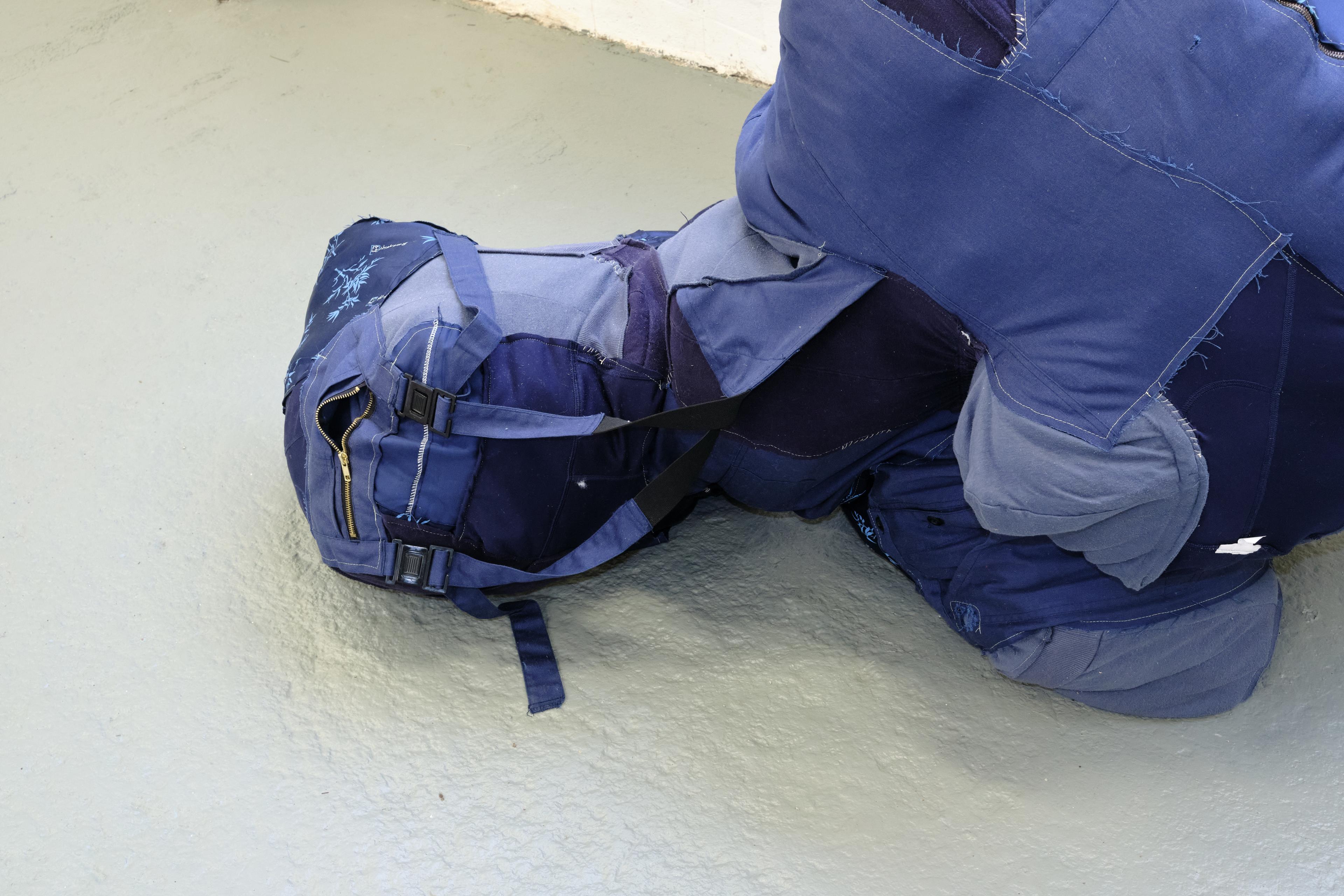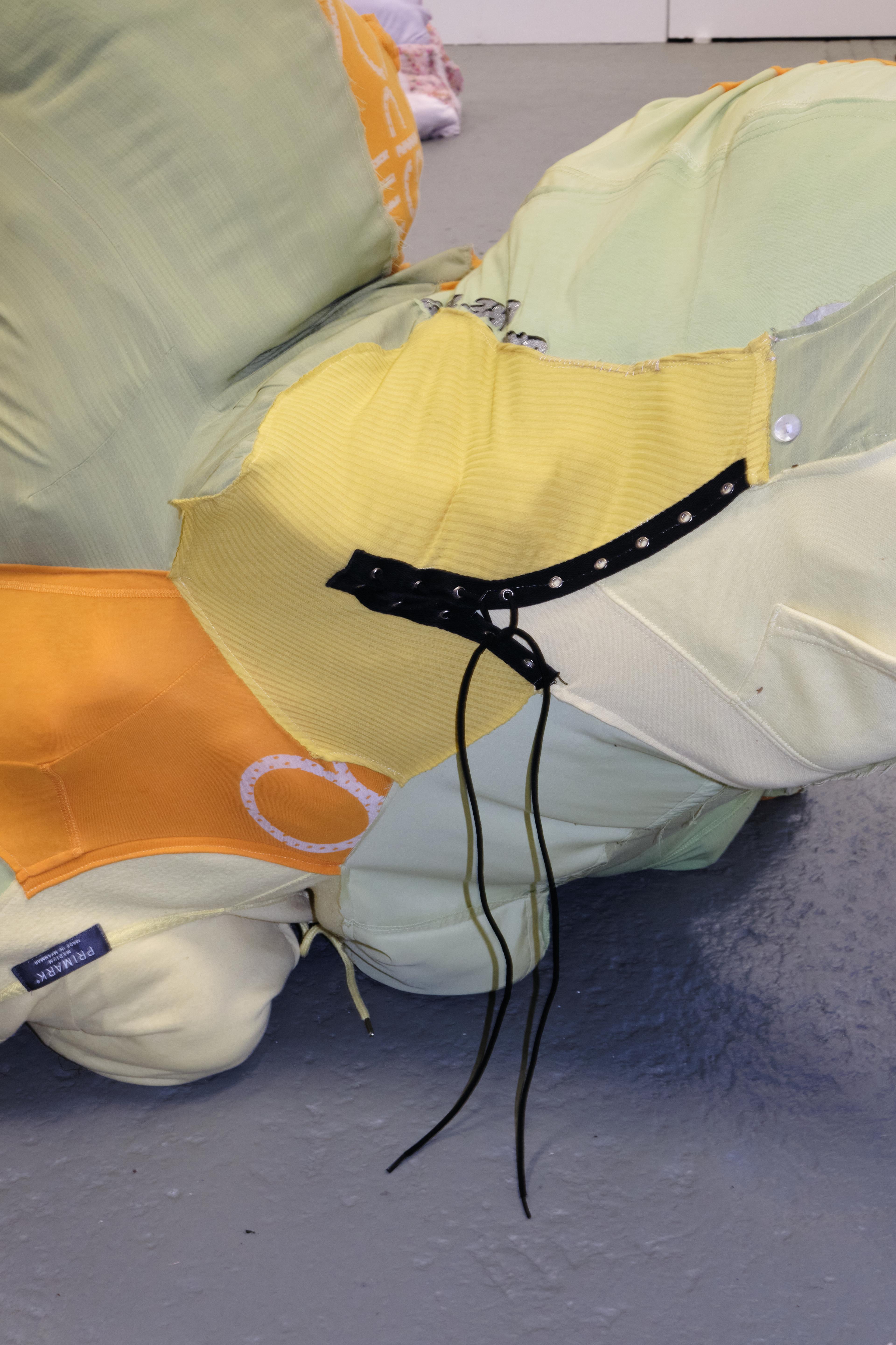 Die Rauminstallation “Elastic Kin” zeigt eine Gruppe von Textilobjekten - Gefüge1 , die aus weggeworfenen Kleidungsstücken bestehen. Sie existieren sowohl als Individuen als auch als Gruppe. Die Kleidungsstücke, die in den Straße von K. gefunden wurden und von Anderen in anderen Kontext hergestellt worden sind, kehren ihren ursprünglichen Zweck um, indem sie zu eigenen Körpern werden, die unabhängig von menschlichen Körpern sind. Jede Oberfläche ist wie eine geheime Landkarte, die Spuren anonymer Hände enthält, die an den Textilien gearbeitet haben. Der Sound der Installation ist ein Echo - fast verschwundener, kollektiver Erinnerungen an vergangene Momente und Orte.