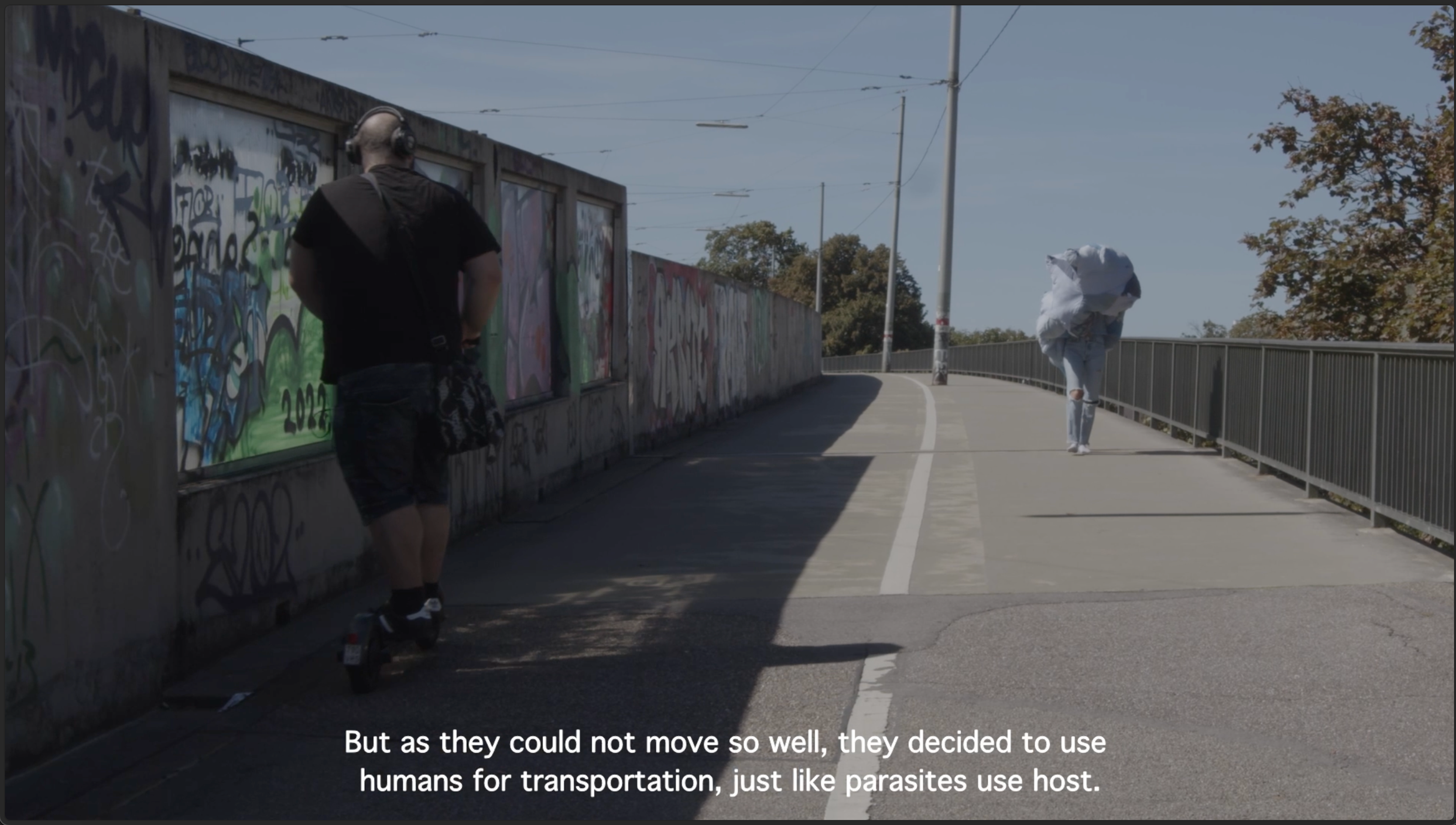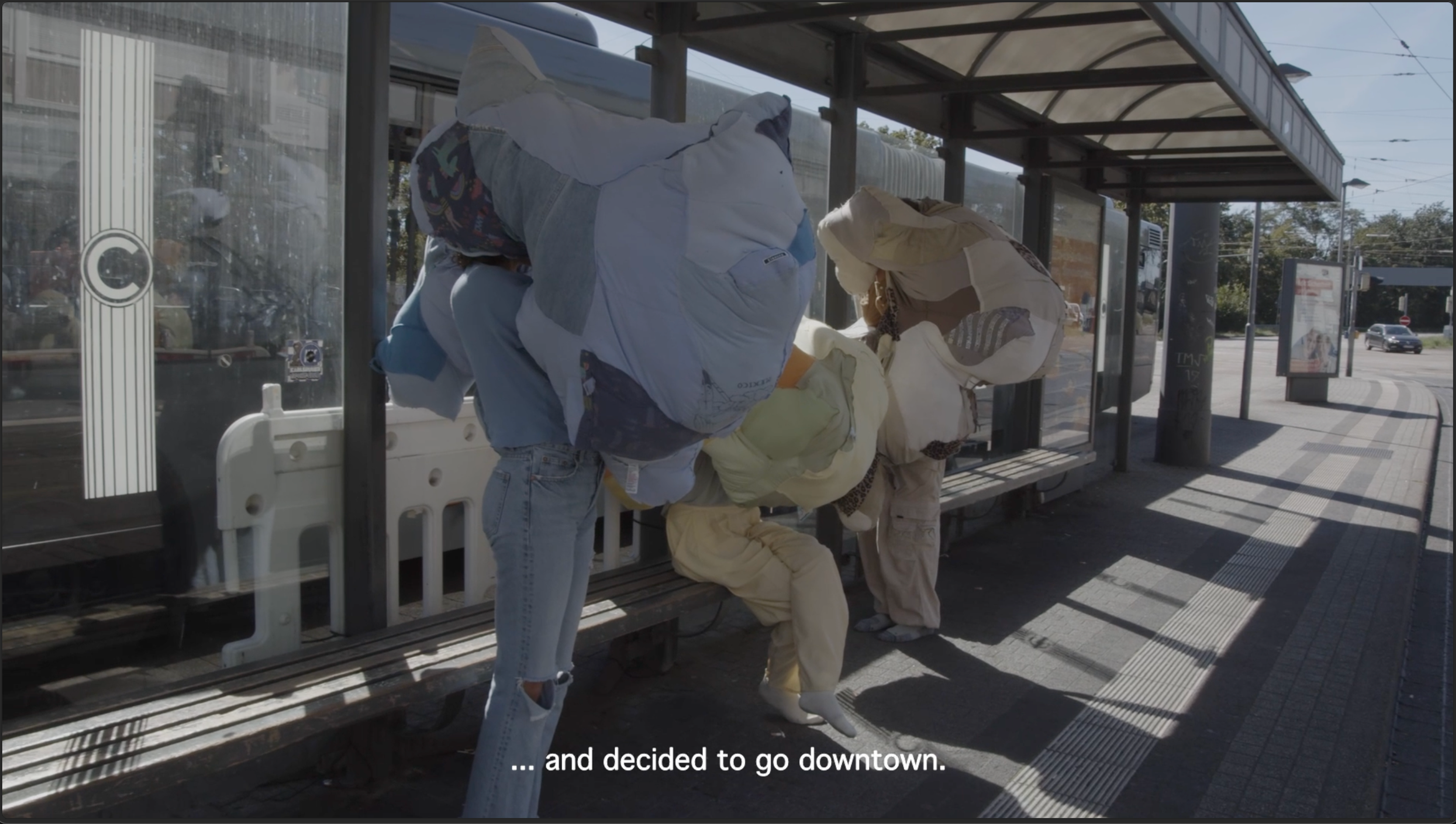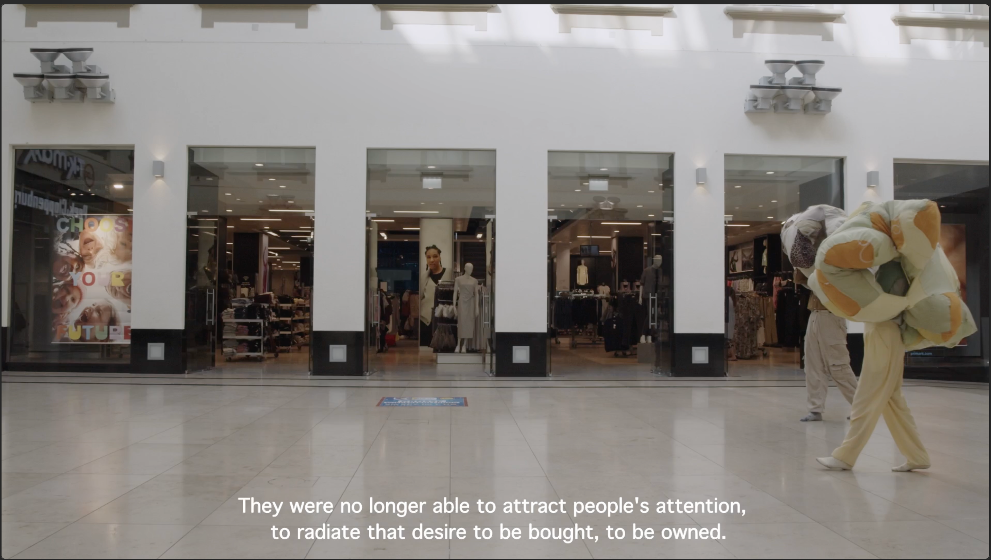 Das Video zeigt eine performative Intervention im öffentlichen Raum. Es zeigt die Gefüge, die eine neue Existenz außerhalb ihrer Produktions- und Vermarktungskontexte führen: Sie kehren in ein Einkaufszentrum zurück, animiert von den Menschen, die sie einst bekleideten.