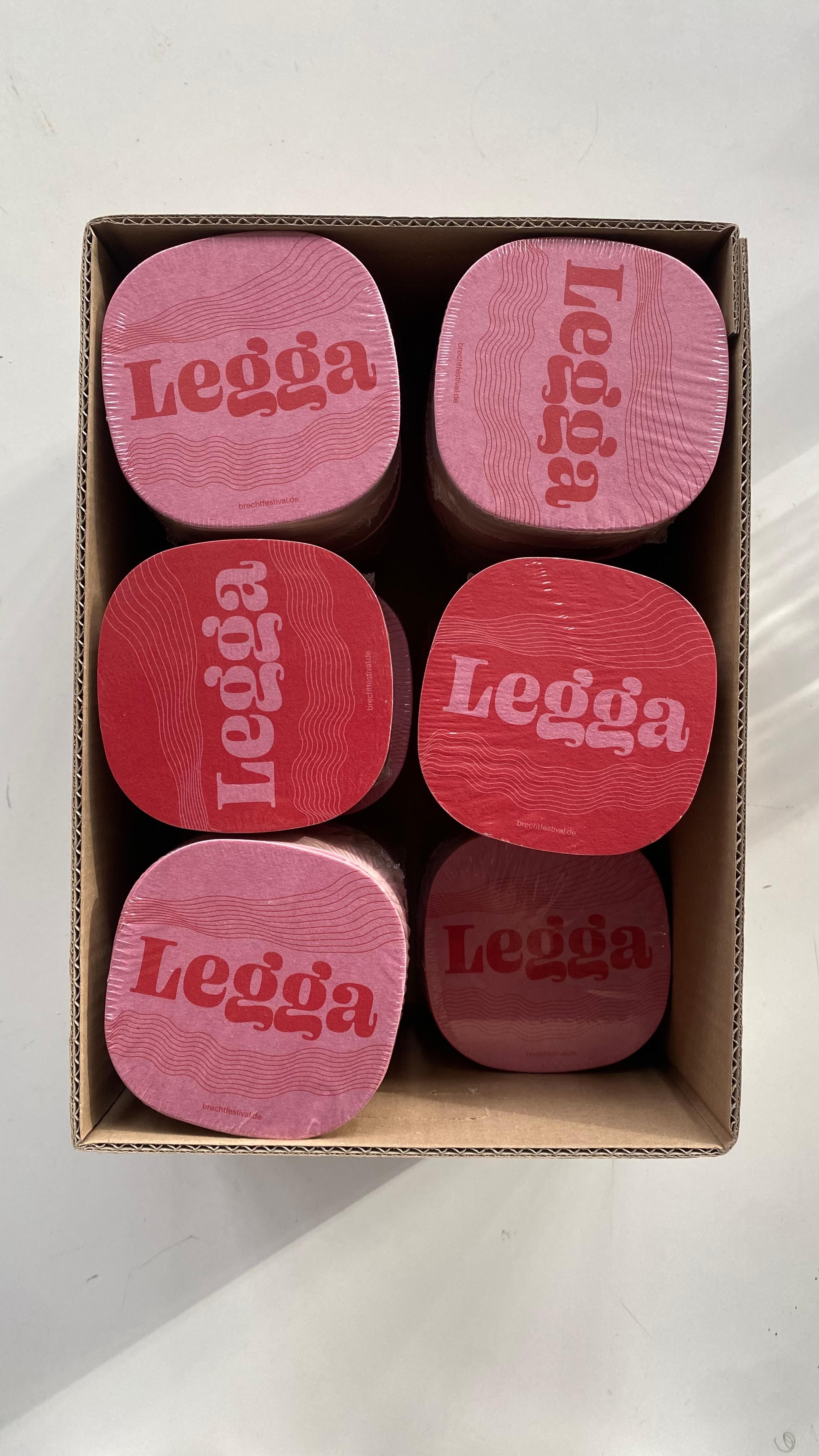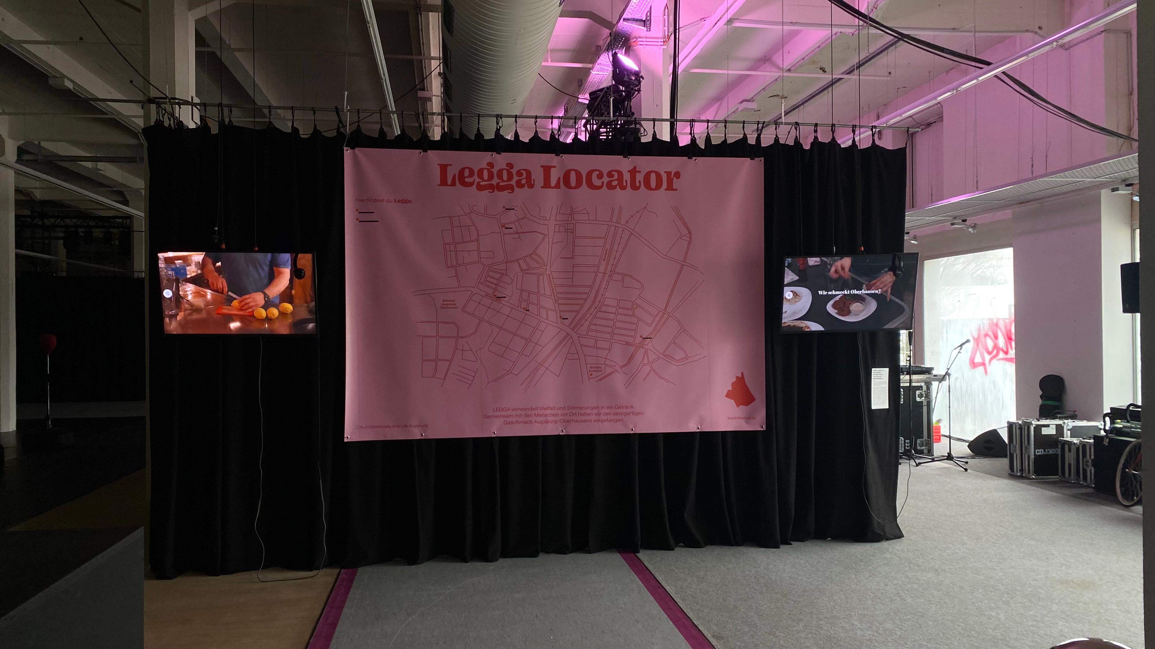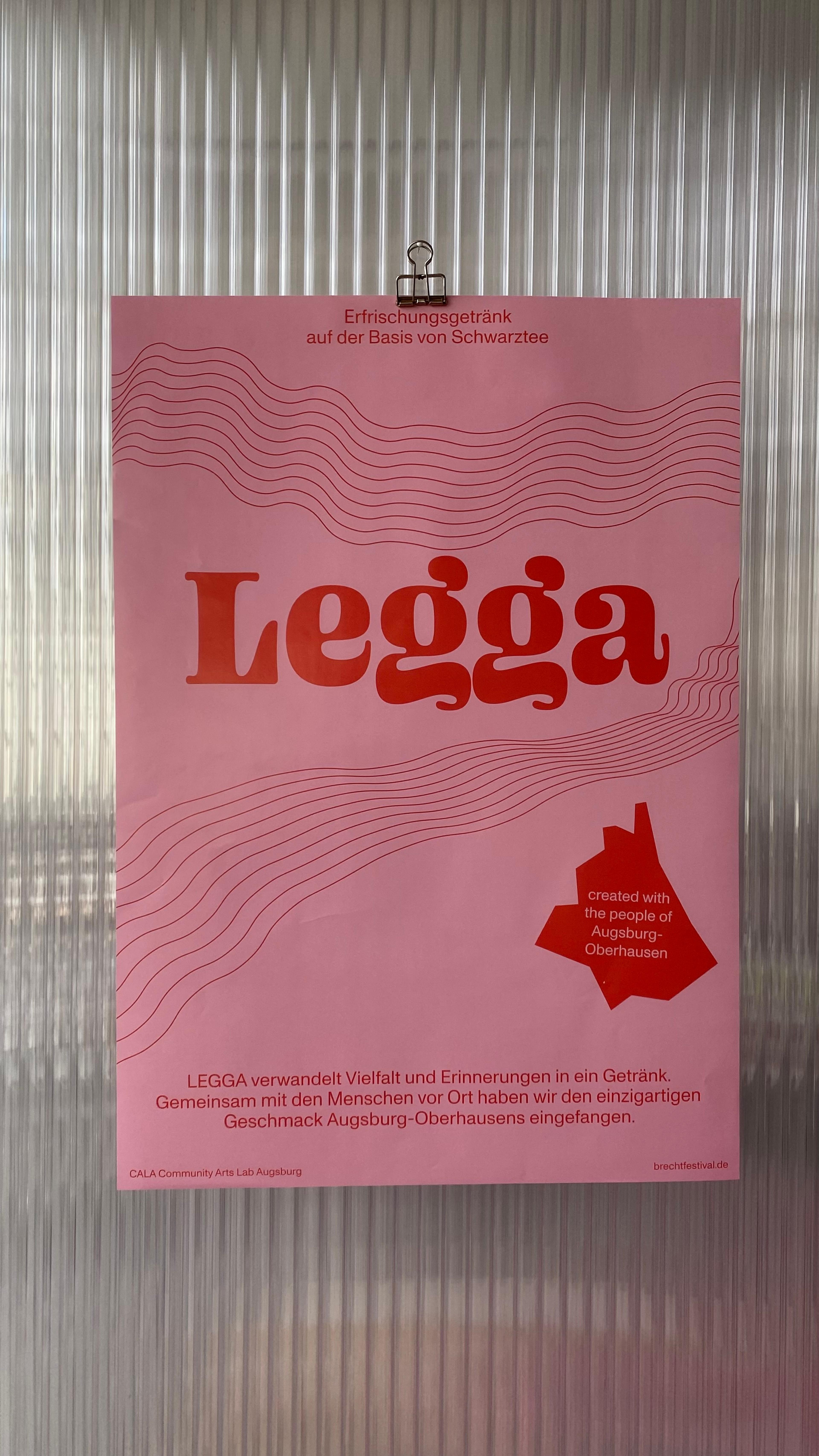 Das Getränk „LEGGA“ wurde im Verlauf des Sommer- und des Wintersemsters 2023 für das Brechtfestival 2024 in Augsburg entwickelt. In Interviews mit Menschen aus Augsburg-Oberhausen haben wir uns dem Stadtteil angenähert und mit dem Bewohnern viele Gespräche über Geschmacksvorlieben und sinnliche Assoziationen geführt. Durch gemeinsames Kreieren und Probieren auf den Straßen Oberhausens erhielt LEGGA seine finale Form aus Schwarztee, verfeinert mit Nelken, Kardamom, Rosen- und Granatapfelaroma und Dattelsirup. Das Projekt war der Versuch die Vielfalt und die sinnlichen Erinnerungen eines Stadtteiles in ein Getränk zu verwandeln. Ausgestellt und zum Verkauf freigegeben wurde „LEGGA" während des Brechtfestivals 2024, sowohl auf dem Festivalgelände und teilnehmenden Spielstätten, als auch außerhalb in Kiosks, Cafés, Restaurants und Getränkeautomaten des Stadtteils.