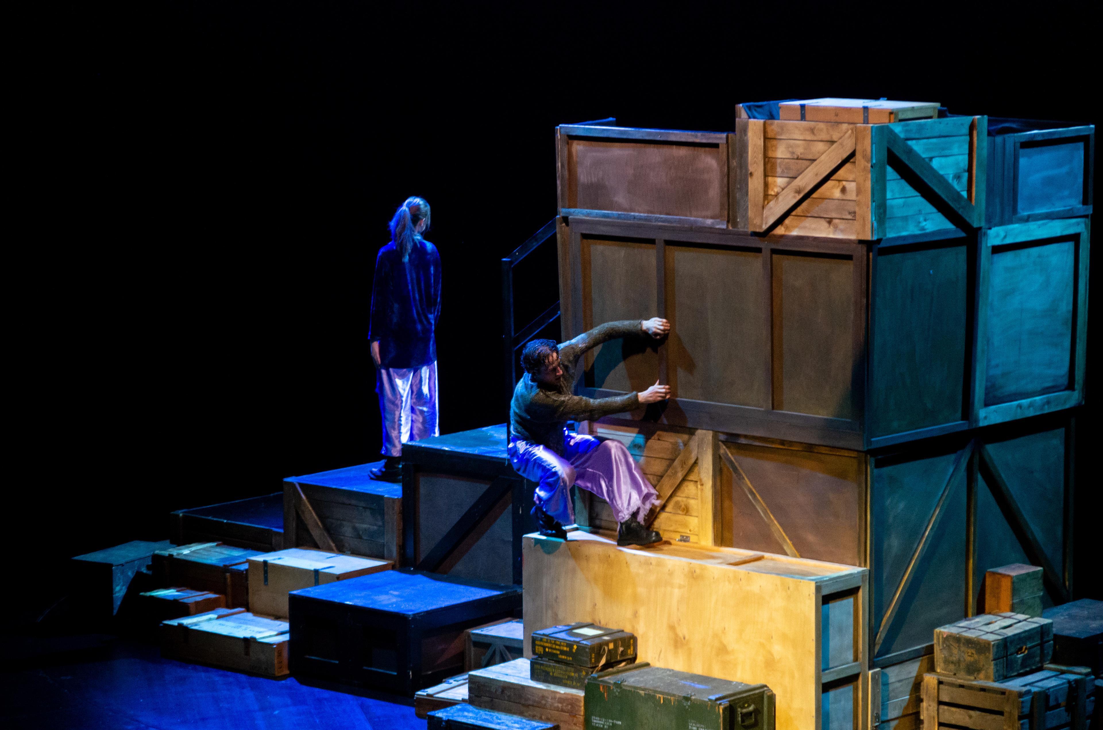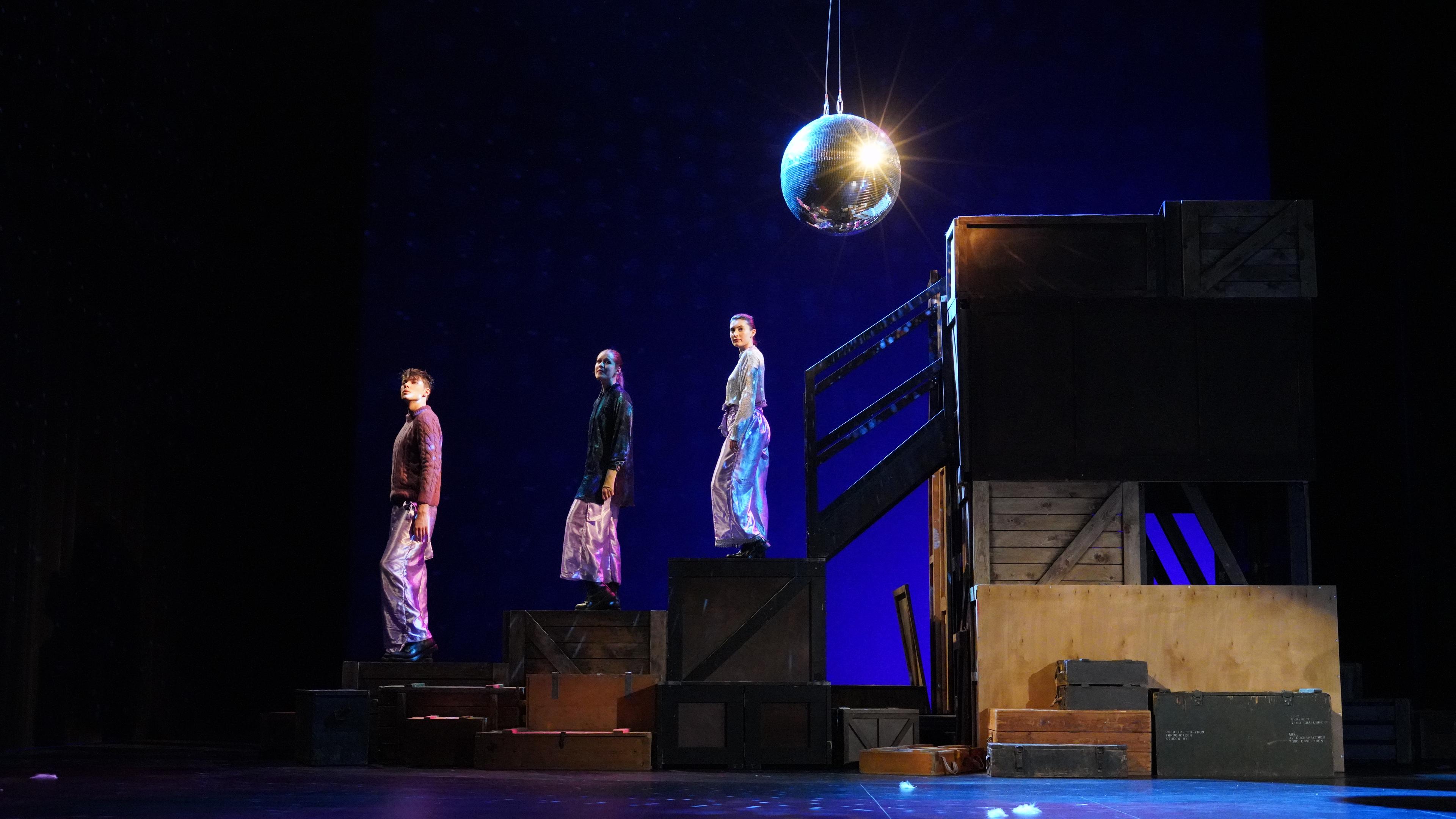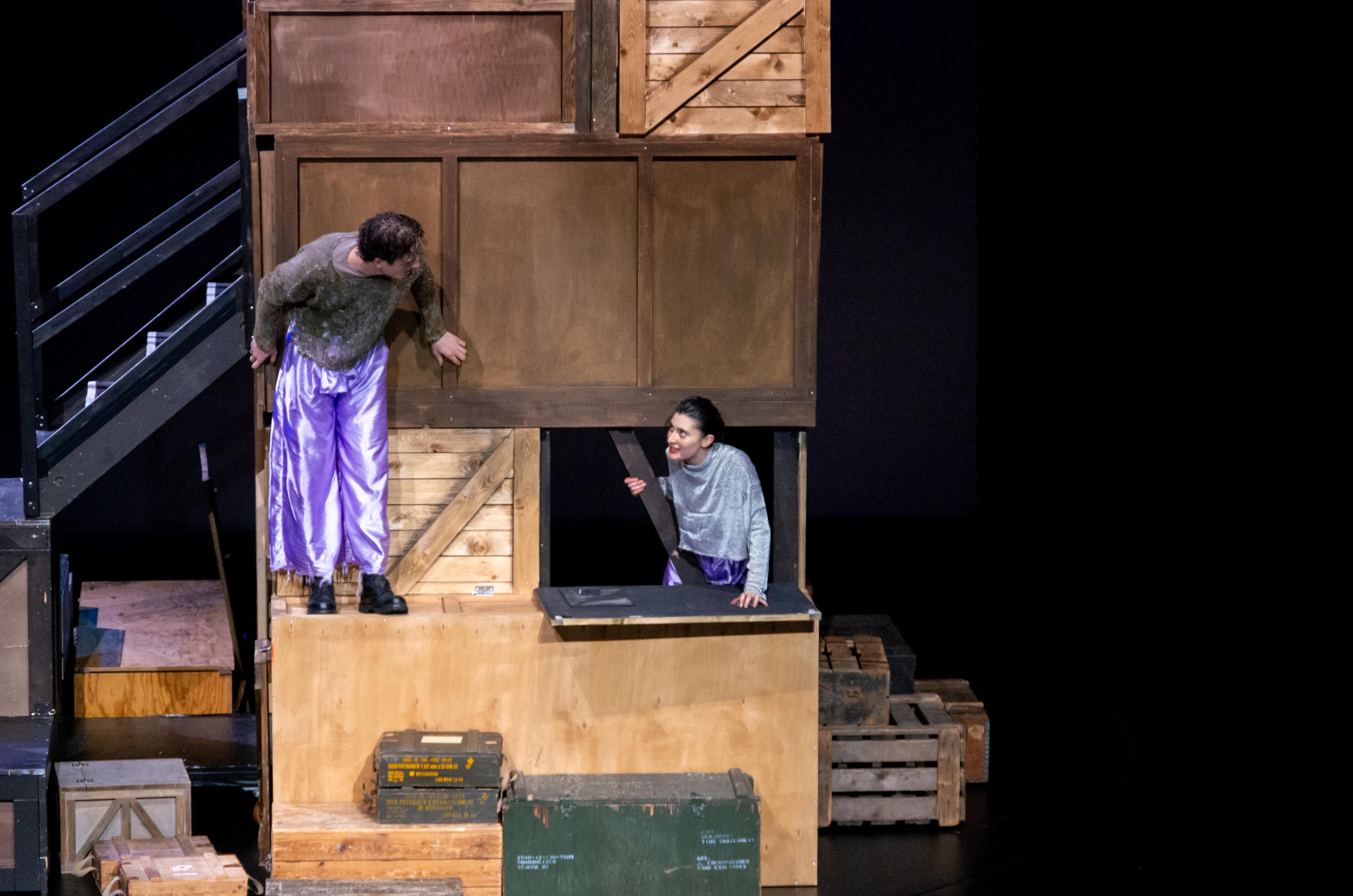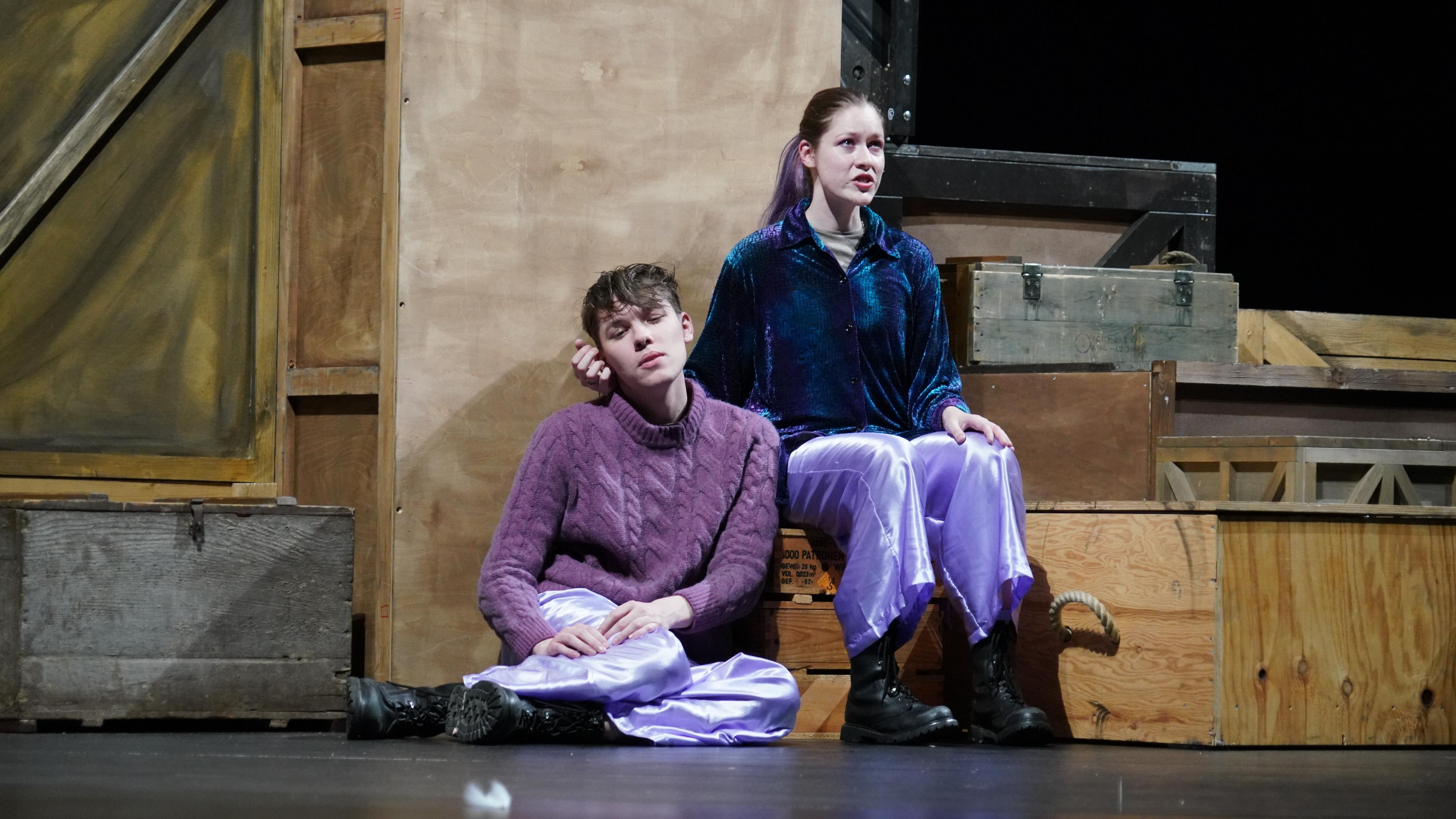 Regie und Text Mateja Kardelis (er/ihm), Es spielen Nika Altukhova (sie/ihr), Sophie Marleen Jany (sie/ihr), Maksym Rudskyi (er/ihm), Franz Warnek (er/ihm), Dramaturgie Amelie Hermann (sie/ihr), Kostüm Kelda Siegel (sie/ihr)*, Bühne, Video Carl Koch (er/ihm)*, Yaël Kolb (er/ihm)*, Choreografie Louiza, Avraam (sie/ ihr)**, Musik Vuk Martinović (er/ihm)