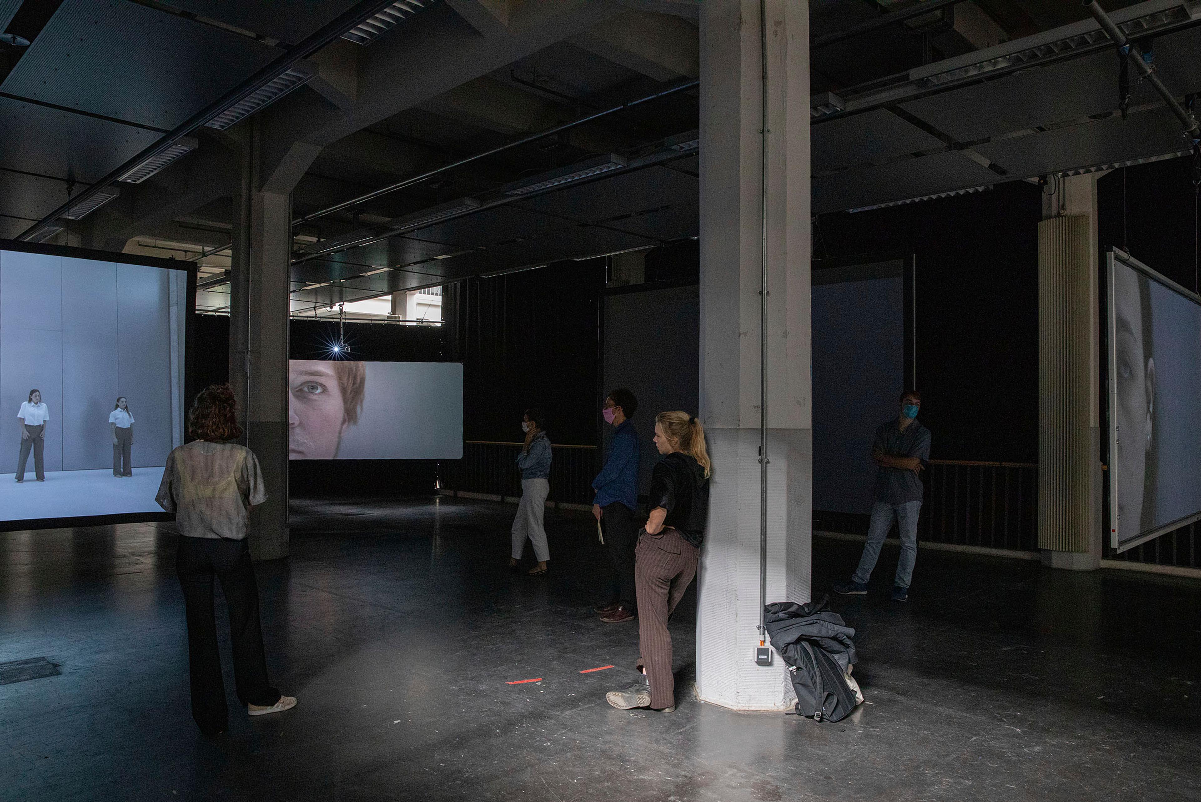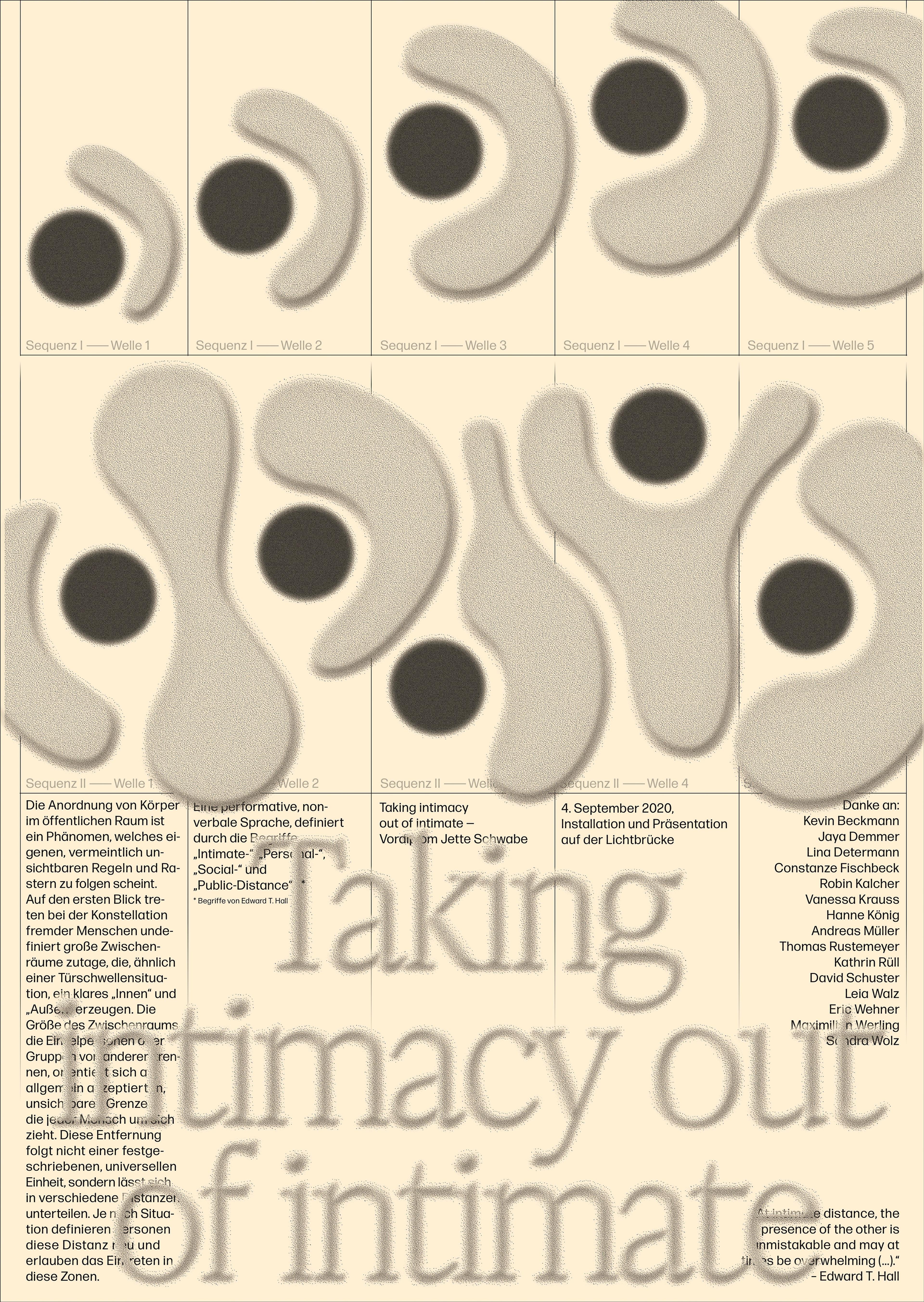 Die 4-Kanal-Videoinstallation „Taking intimacy out of intimate" (2020) befasst sich mit dem Raumverhalten von Menschen als nonverbales Kommunikationssystem. Mittels räumlicher Konstellationen, Gesten und Haltungen wird zwischen Kommunikations- oder Interaktionspartner:innen eine „,Raumsprache" kreiert. „Taking intimacy out of intimate" versteht sich als Versuch diese Sprache durch Choreografien zu analysieren und