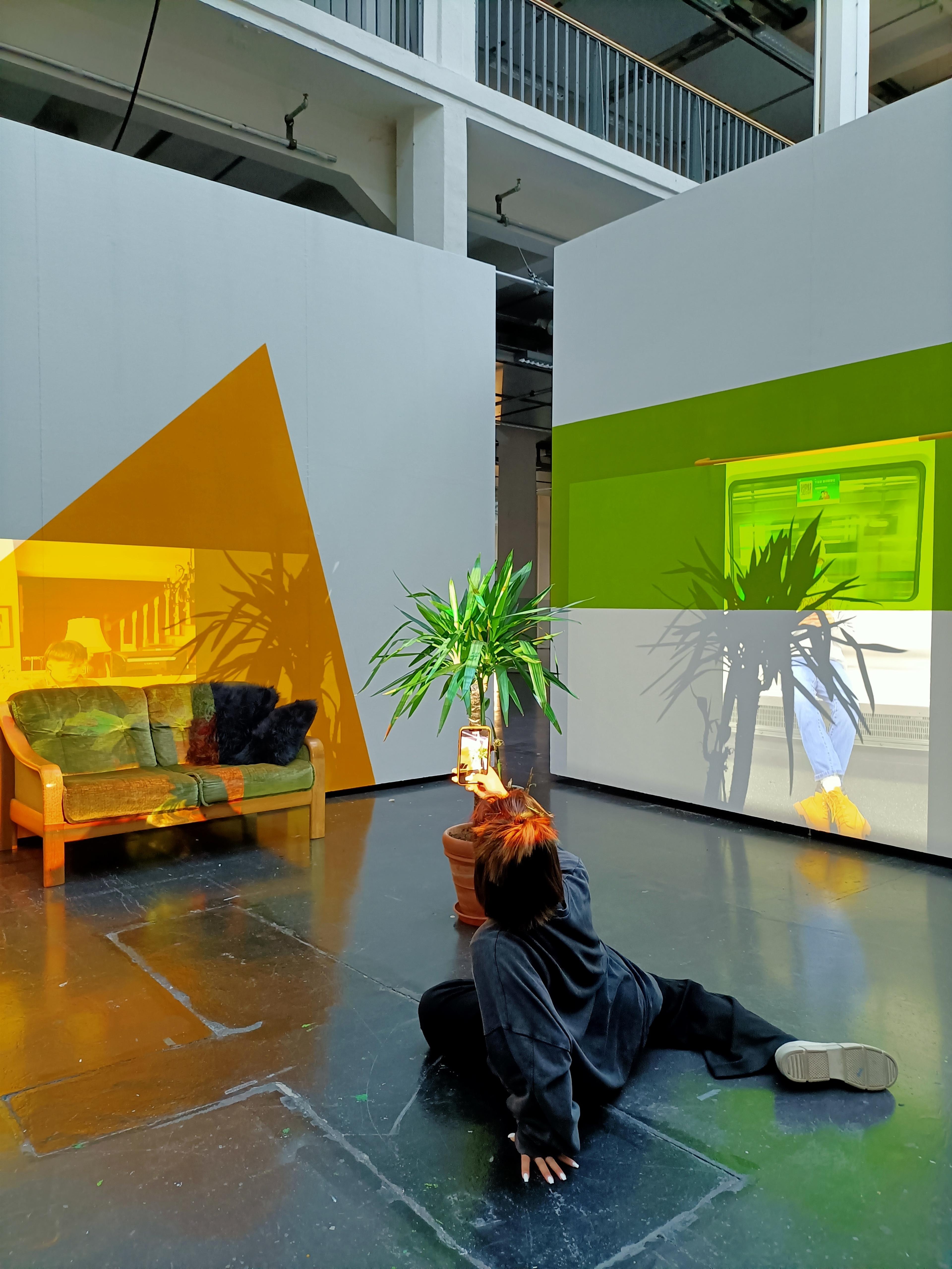 In dieser Ausstellung habe ich die vier repräsentativen Szenen meines Lebens aufgestellt: Essen, Schlafen, Entspannen und die Wohnung verlassen. In der linken Hälfte der Szene gibt es in diesen vier Szenen eine Schleife vom realen Zustand meines Bruders in China. Die rechte Hälfte der Szene ist allen Besuchern vorbehalten. Die Besucher schwingen mit den Menschen in der linken Hälfte in derselben Szene durch die Videoleinwand an beiden Enden der Welt mit.