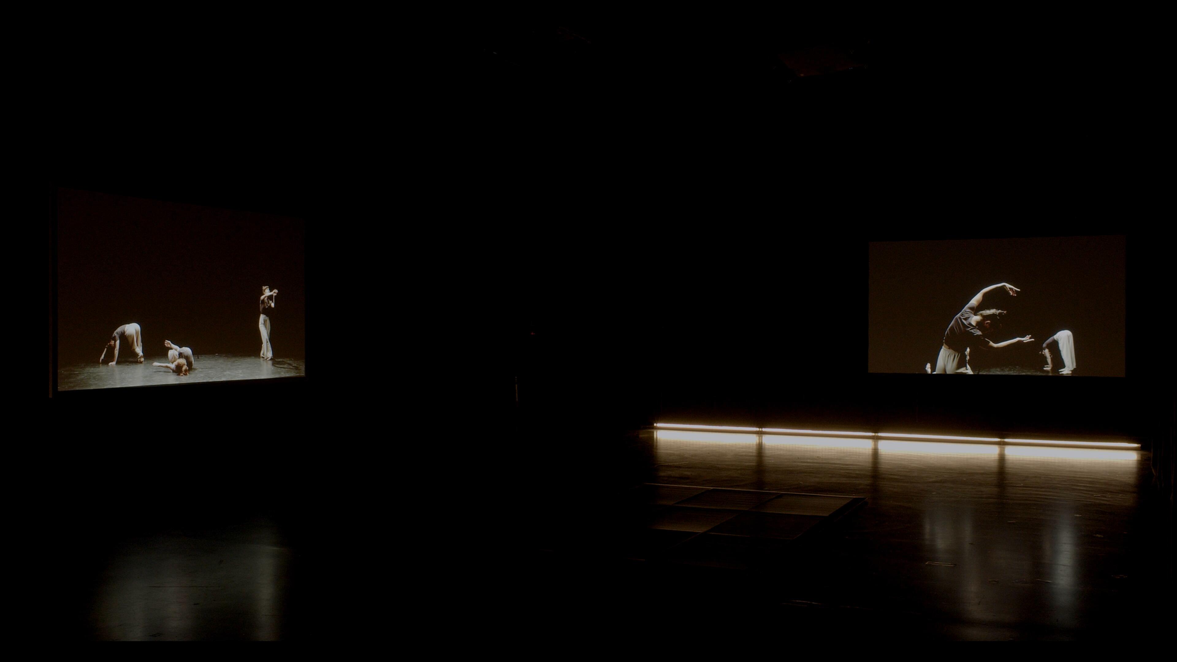 Die Performance wird aus mehreren Perspektiven gefilmt. Diese Aufnahmen aus verschiedenen Blickachsen eines überwachenden Apparats, sind auf vier Projektionsflächen verteilt.