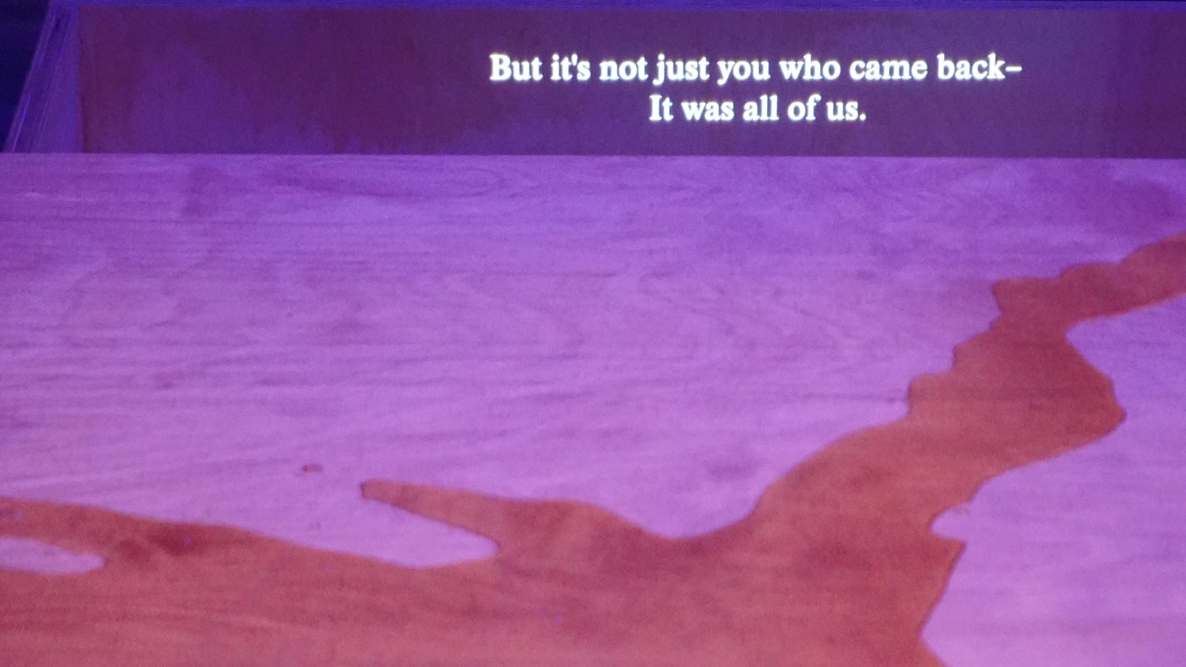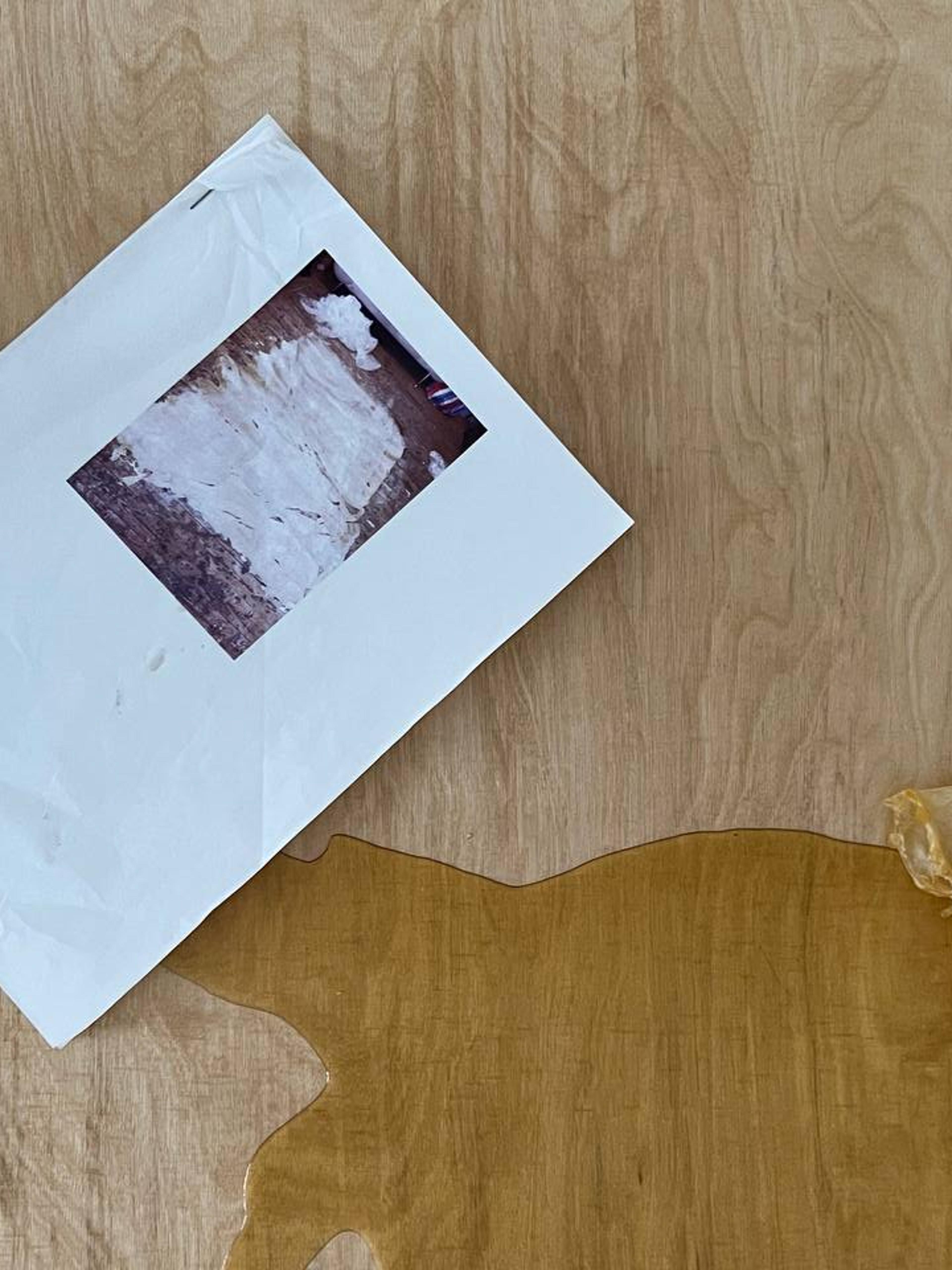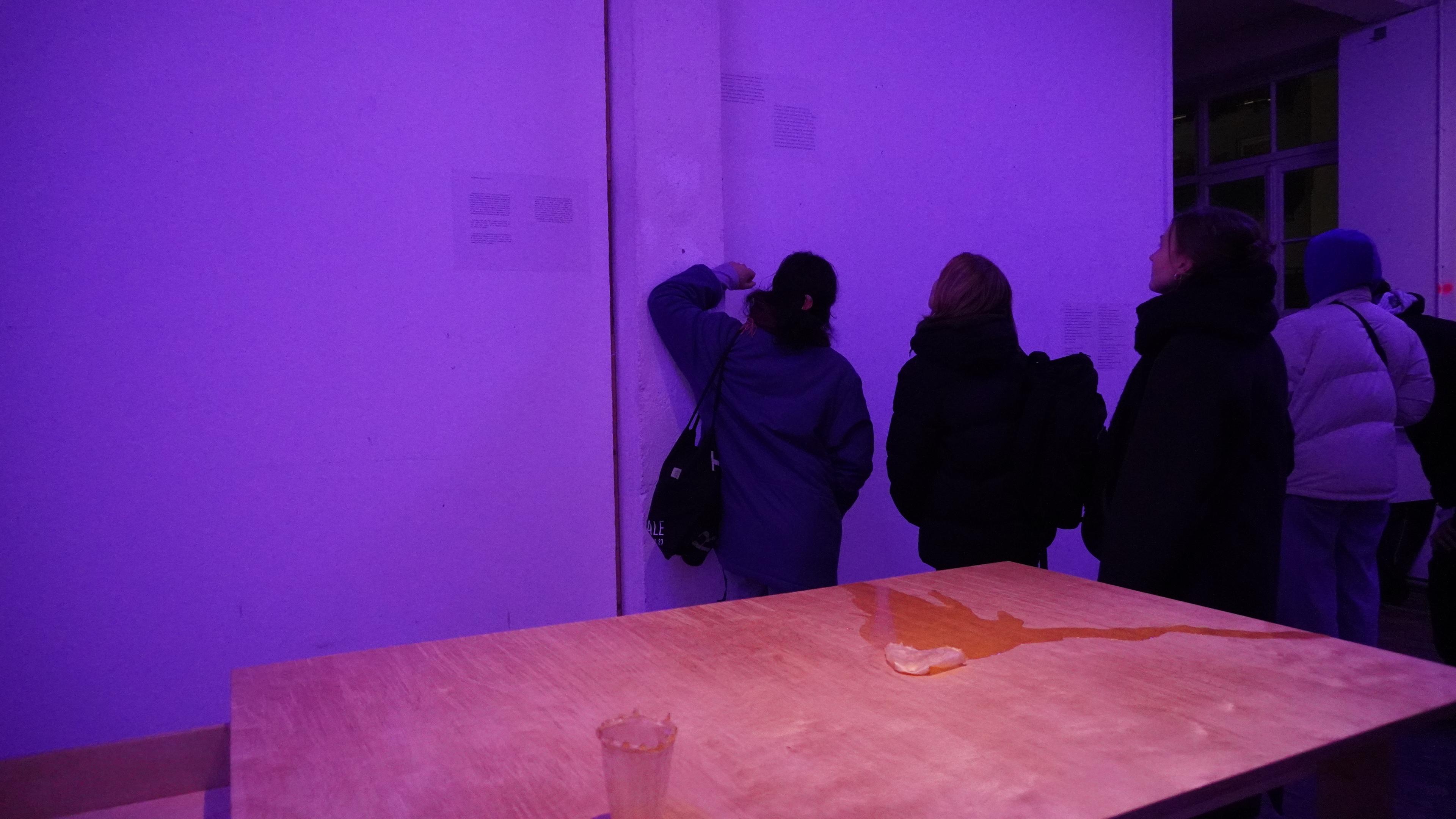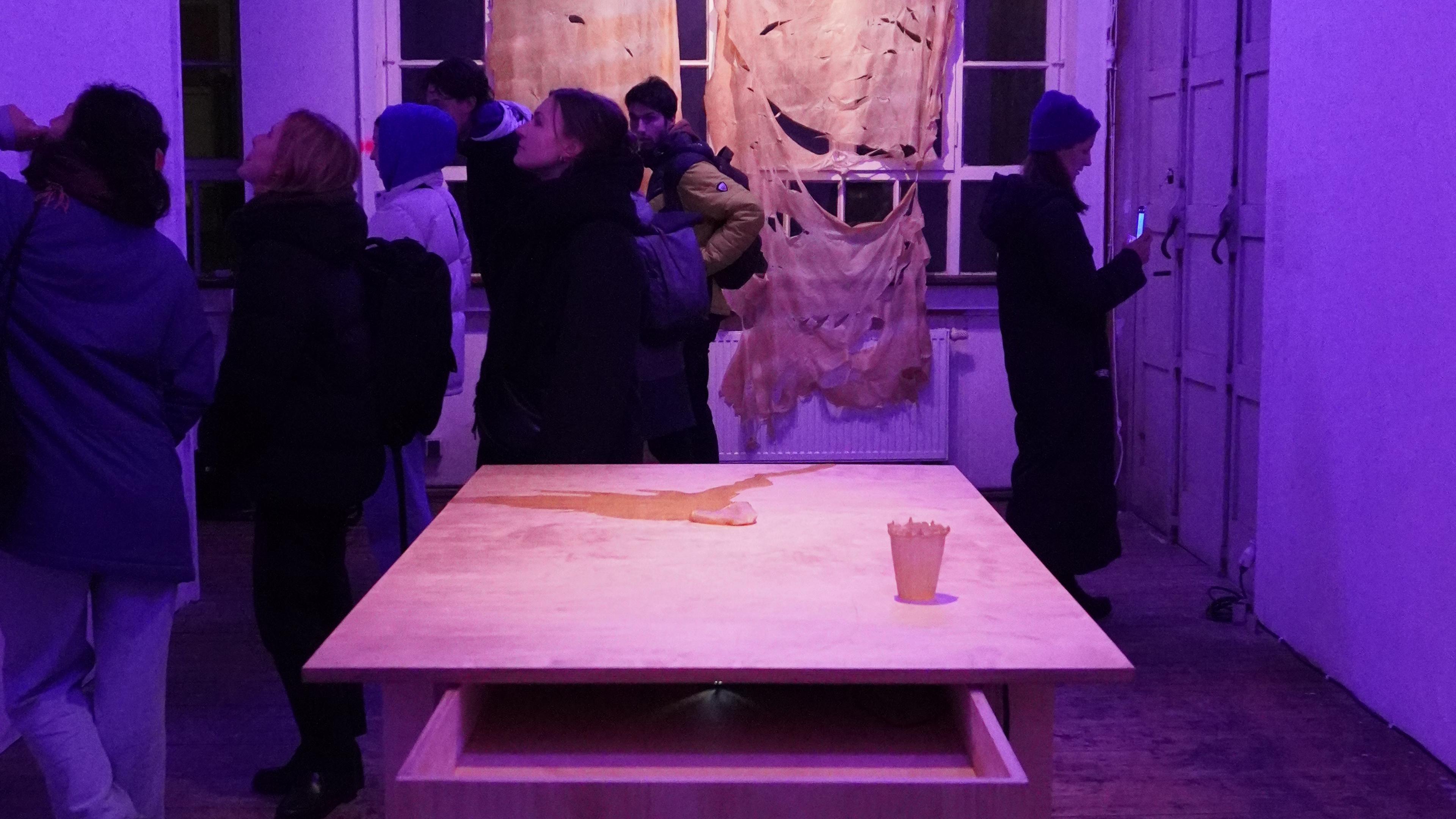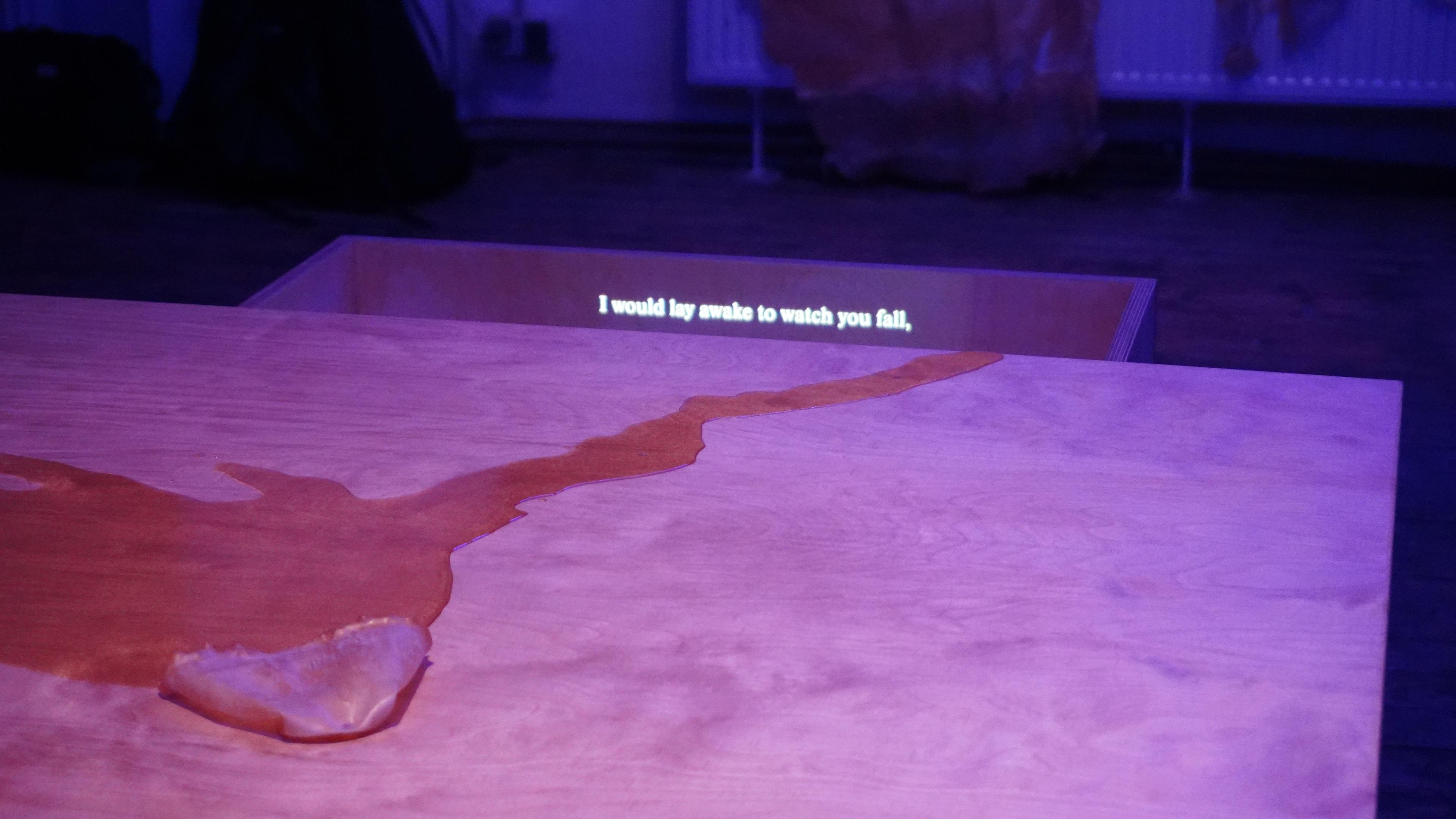 Tassenabgüsse und eine Pfütze aus Latex liegen auf dem Tisch–Überbleibsel einer Zusammenkunft. In ihm eine Projektion eines Gesprächs– ein Ausschnitt aus einer Freundschaft, ein Konflikt - vielleicht -, eine genaue Kenntnis des anderen. Sie sprechen von gegenseitiger Verantwortung, der Möglichkeit des Lernens und vor allem der Kritik am anderen mit gegenseitigem Wohlwollen, Ressourcen, Mahnungen und Entschuldigungen.
