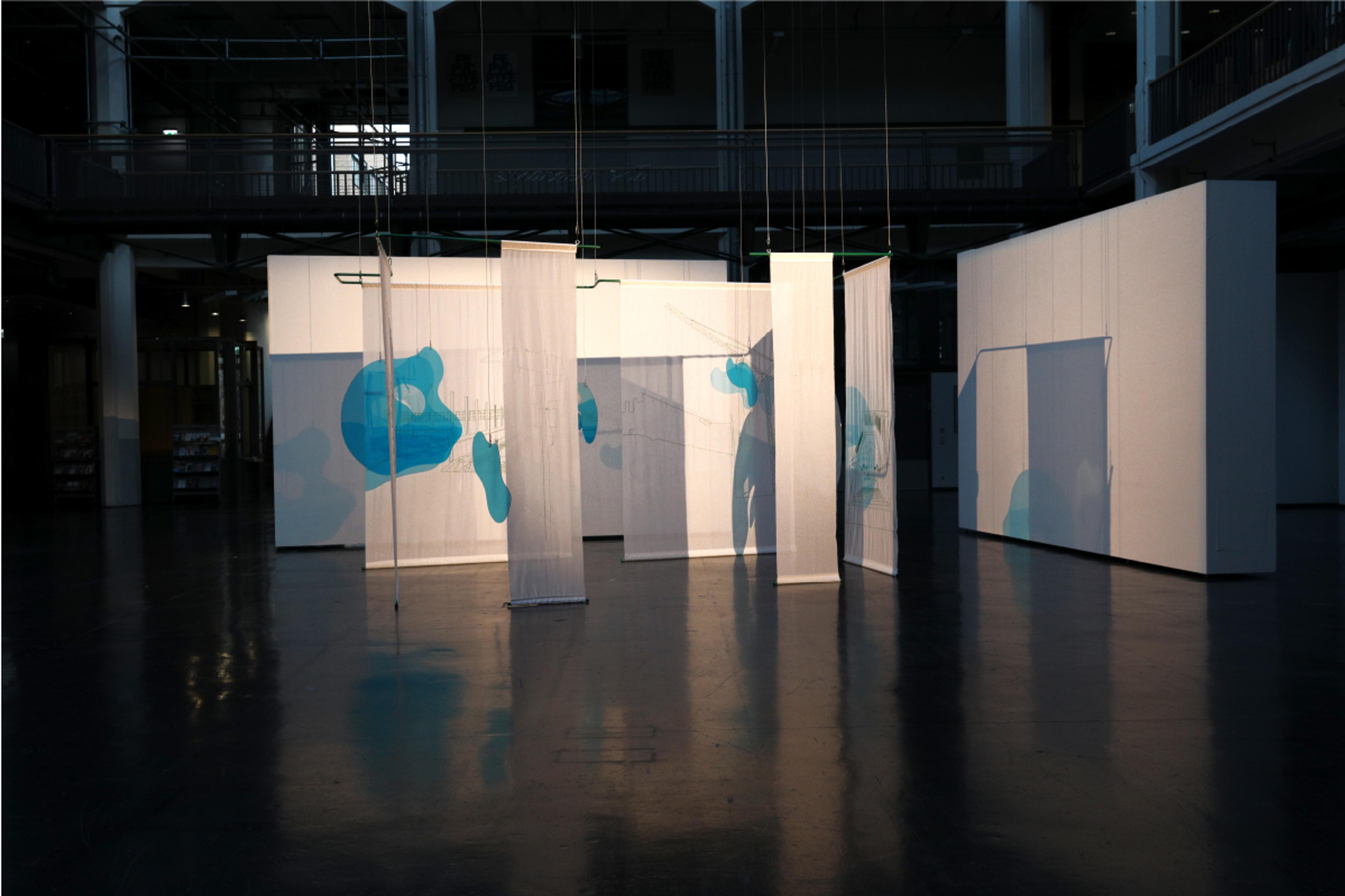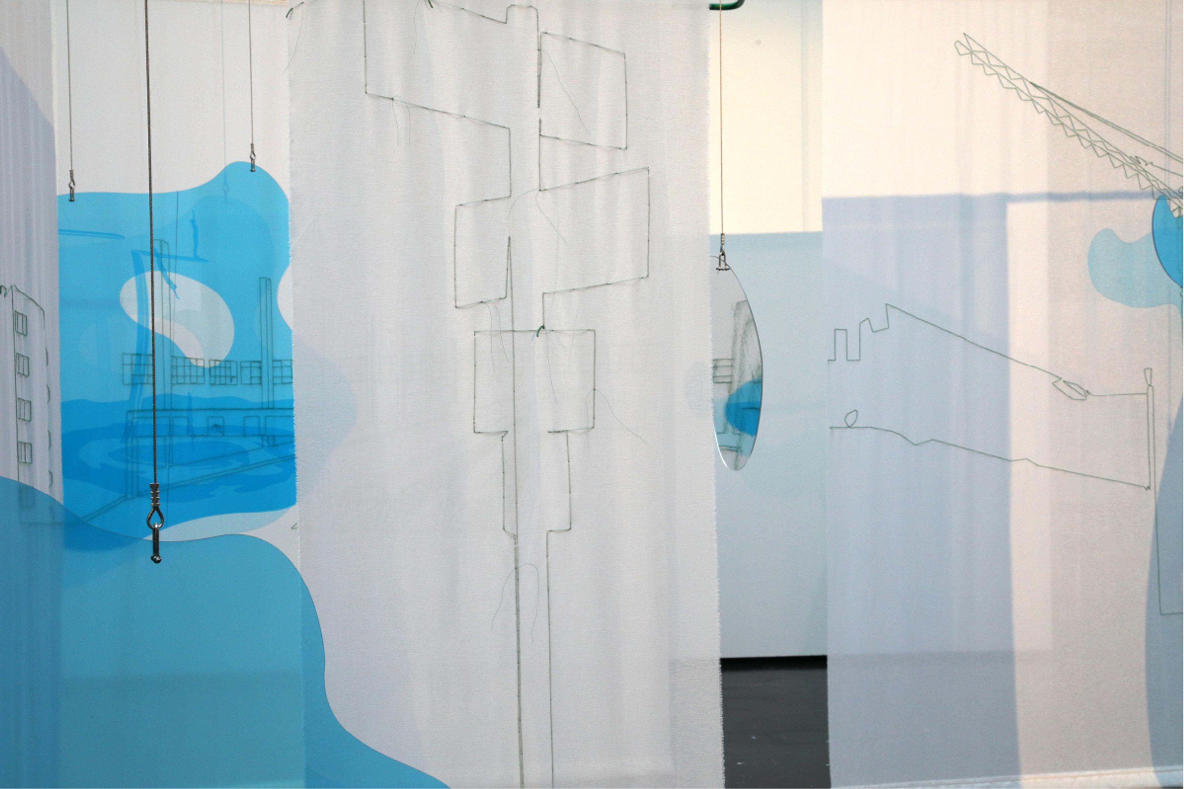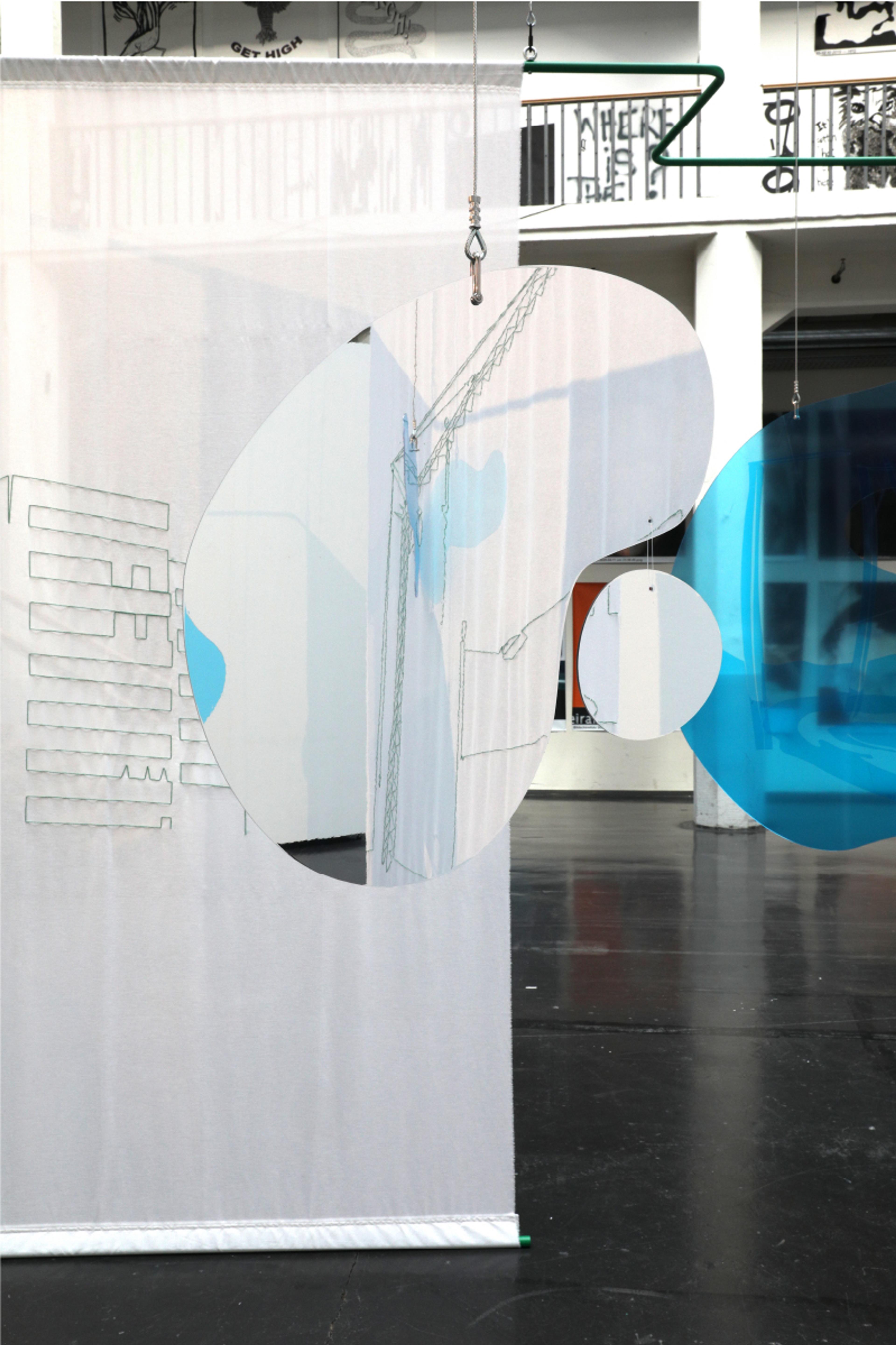 I translated my drawings into a new spatial system: an installation made of curved tubes, transparent and translucent fabric panels and Plexiglas panes, which constantly changed depending on the angle of view and movement of the visitors. The result was a play between different levels of scenes and everyday objects that constantly created new spaces and contexts by constantly overlapping, condensing and detaching from each other.