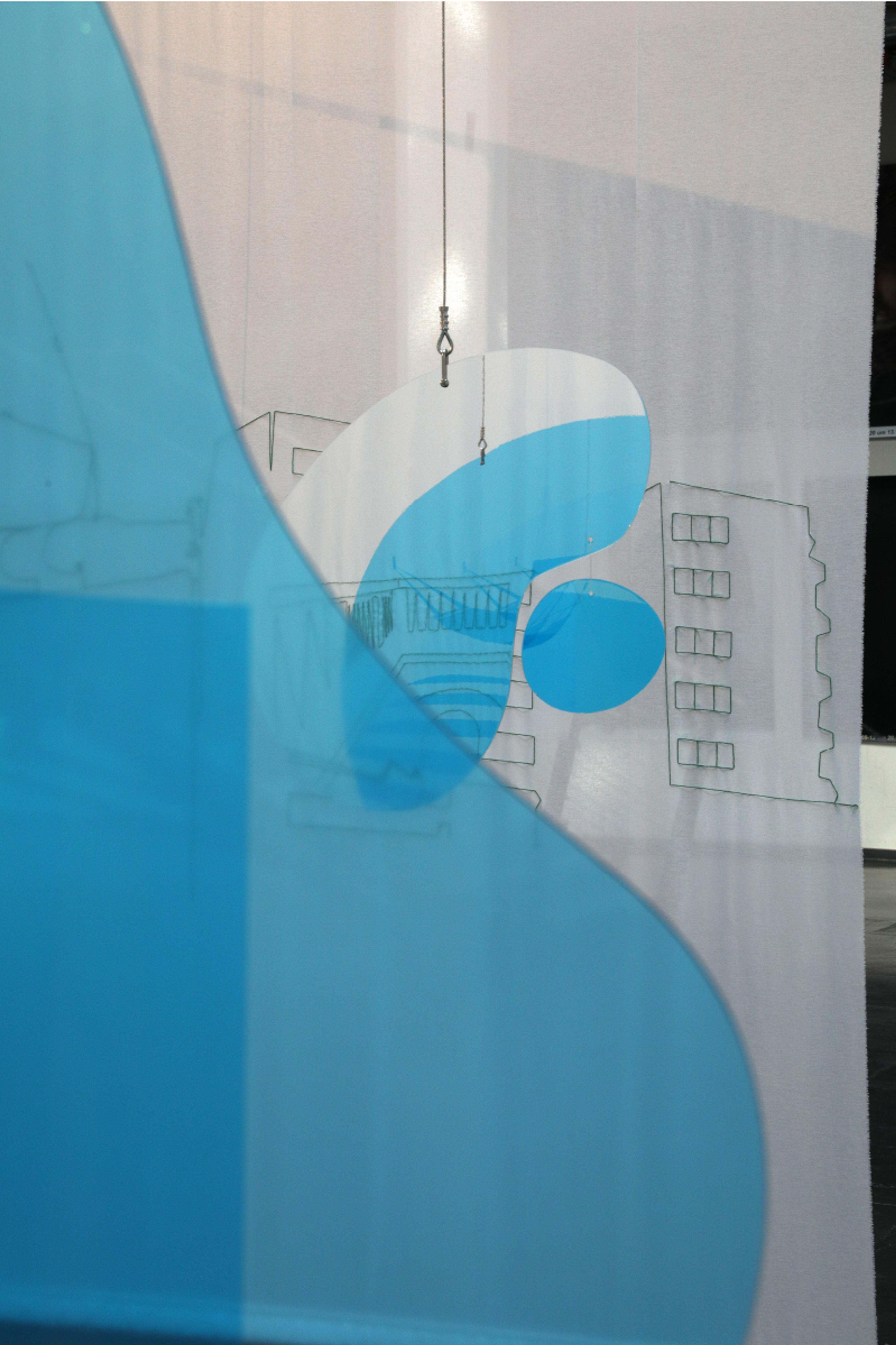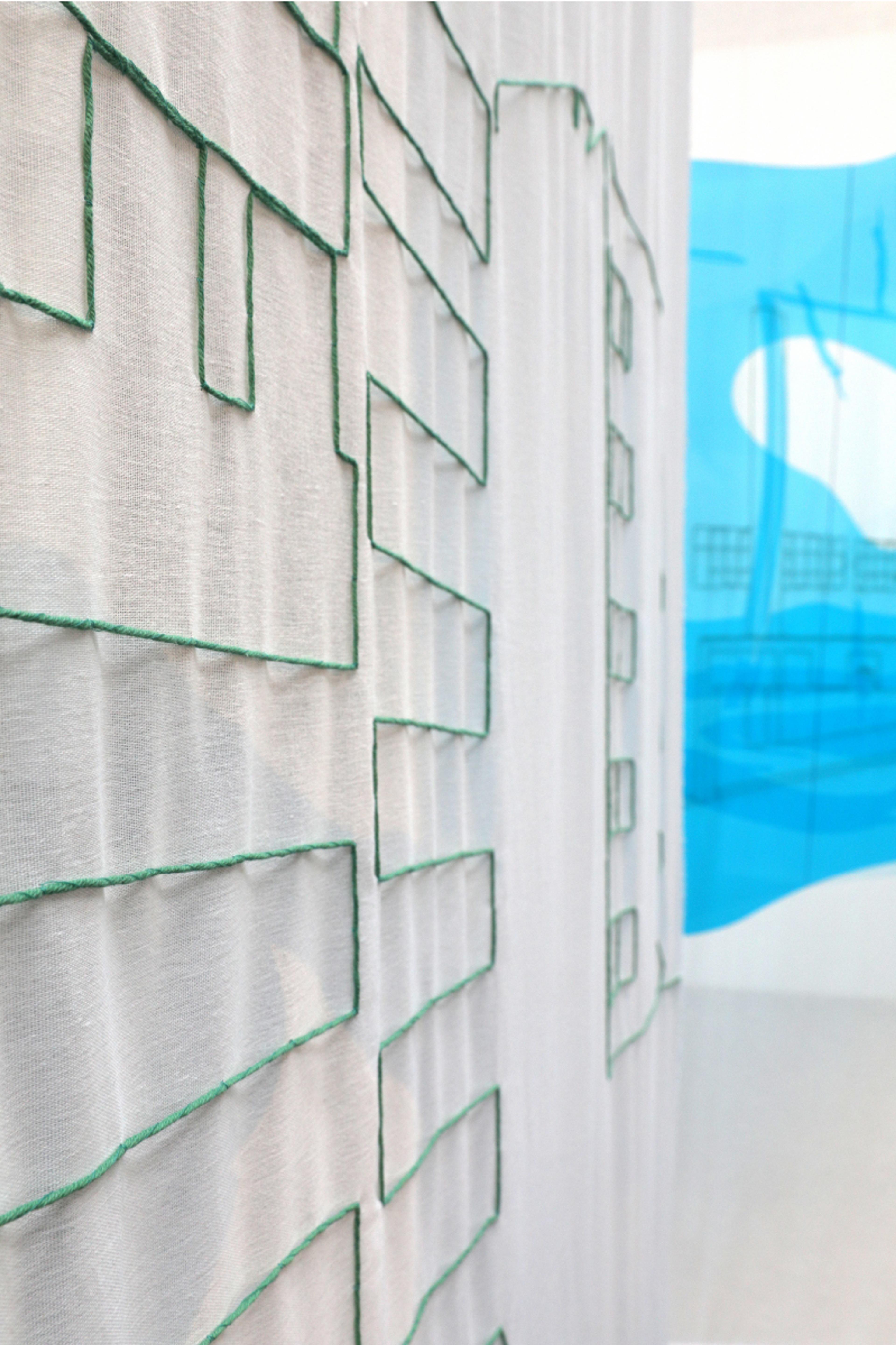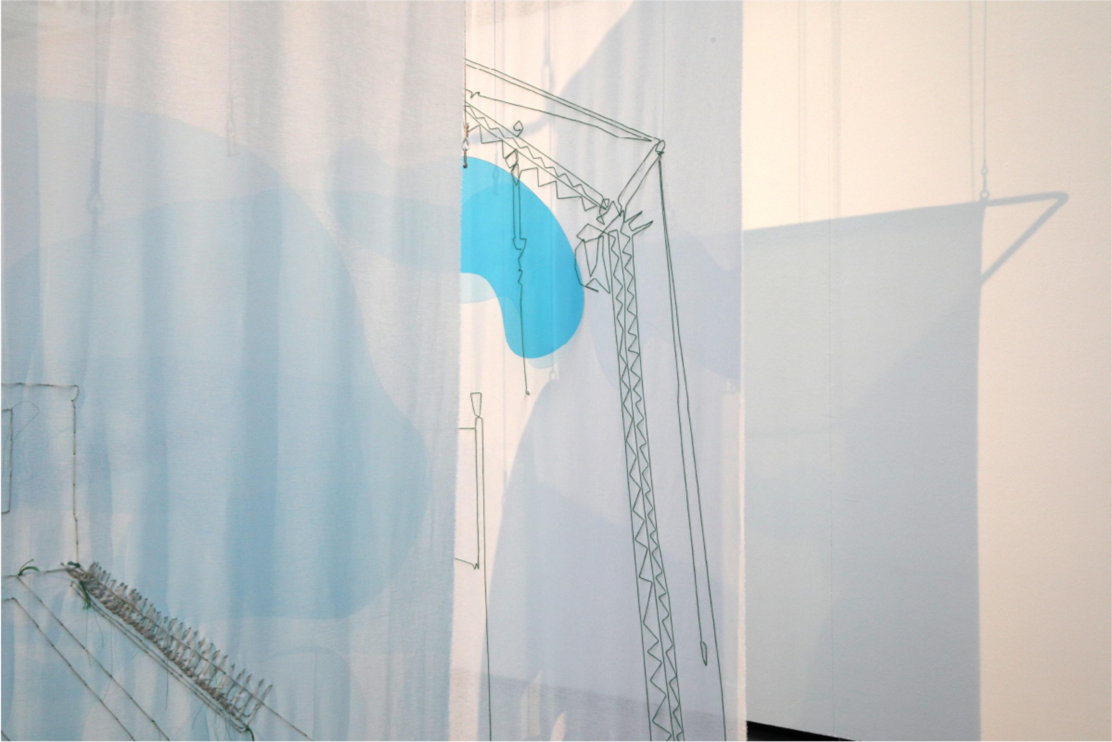 I translated my drawings into a new spatial system: an installation made of curved tubes, transparent and translucent fabric panels and Plexiglas panes, which constantly changed depending on the angle of view and movement of the visitors. The result was a play between different levels of scenes and everyday objects that constantly created new spaces and contexts by constantly overlapping, condensing and detaching from each other.
