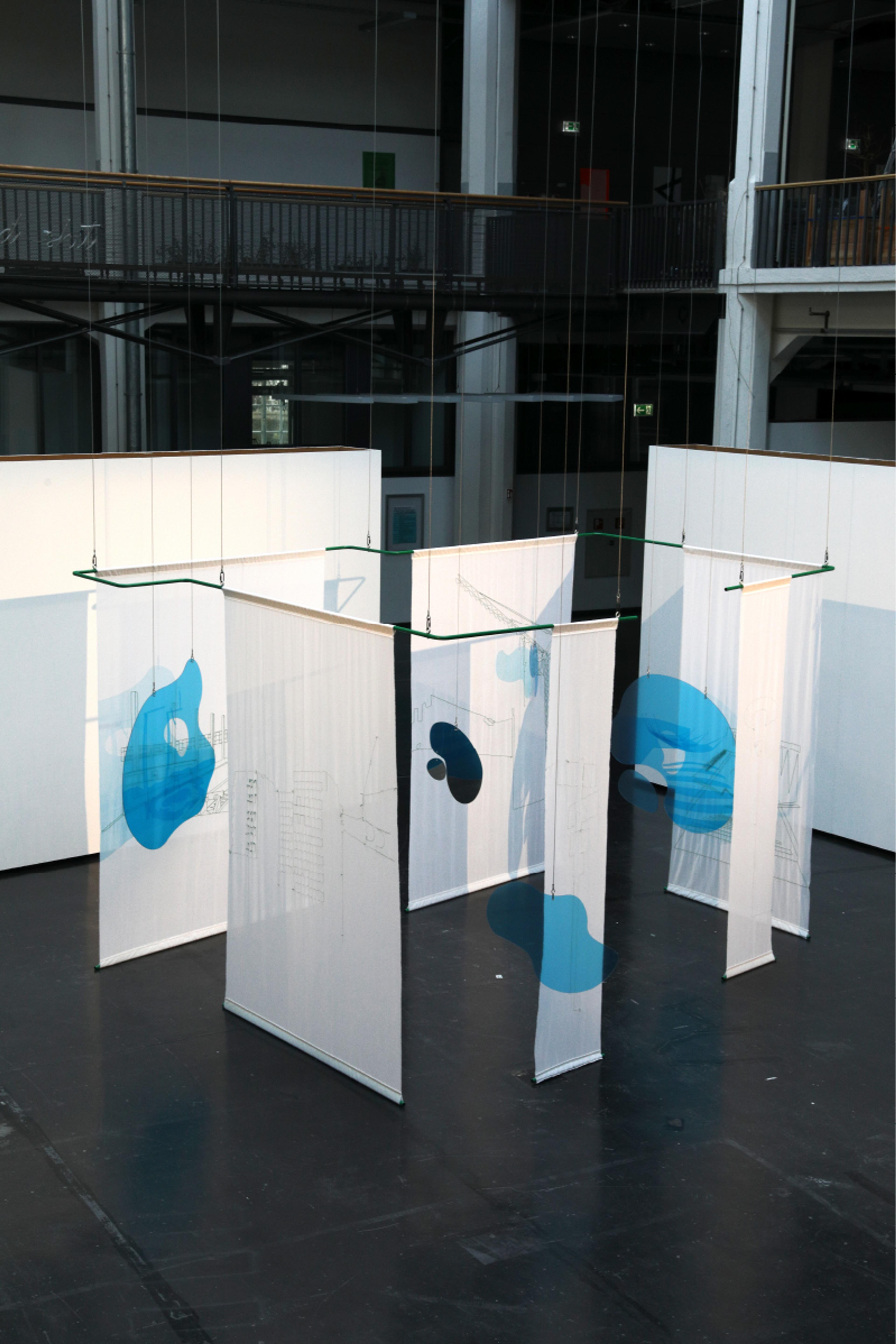 Blue hour is a spatial sketch. A collection of thoughts. A design in which chance, the lighting conditions of the exhibition space, the wind and the movement of the visitors play an important role.