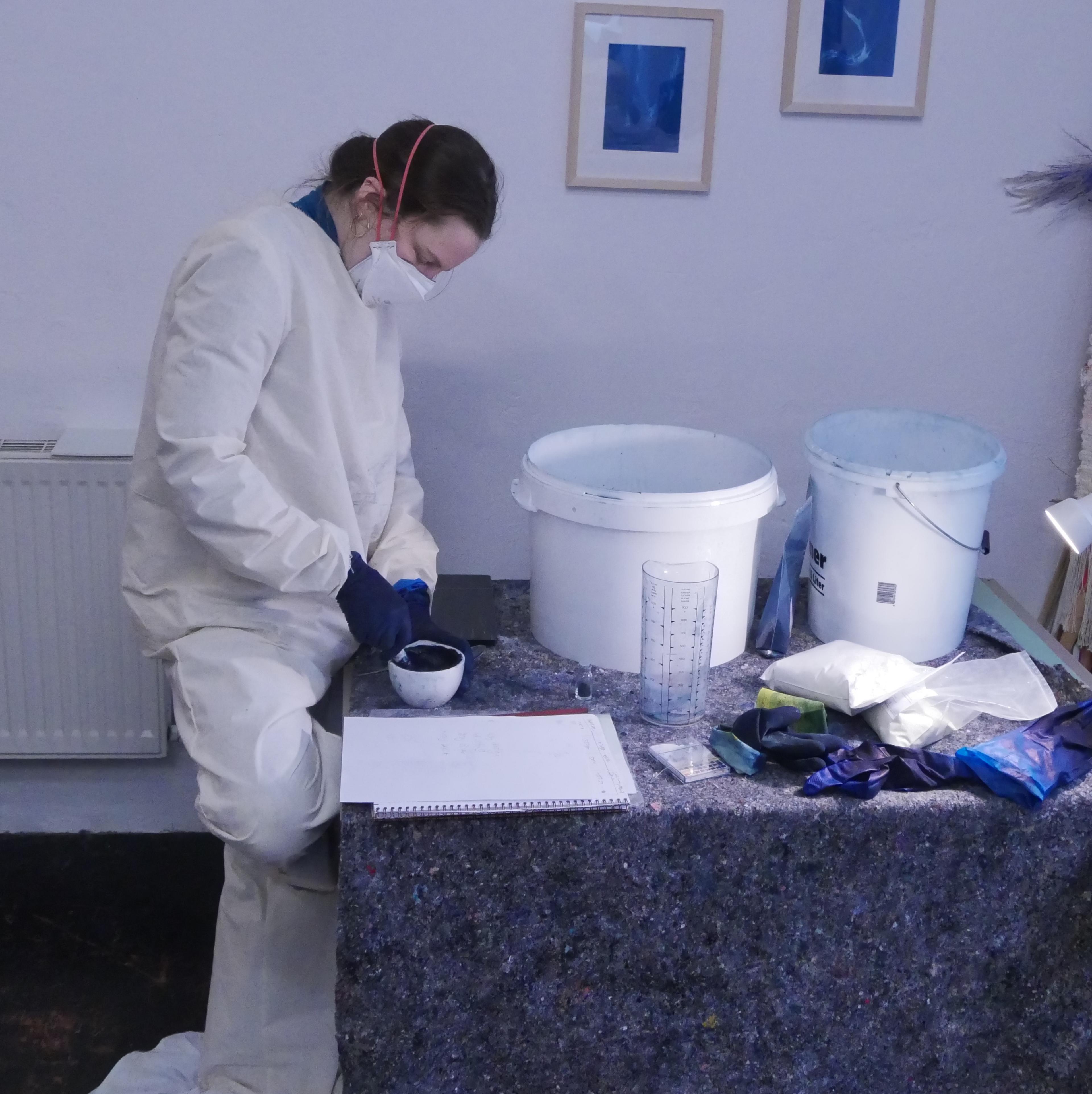 Corinne assisted Claudia Hill during her internship with sewing indidvidual clothes for each artist invited(Jared Gradinger, Siegmar Zacharias, Shelley Etkin, Roberto Martinez, Heidrun Holzfeind and Stefan Rusconi), weaving and warping the loom as well as mixing and dyeing with indigo.
