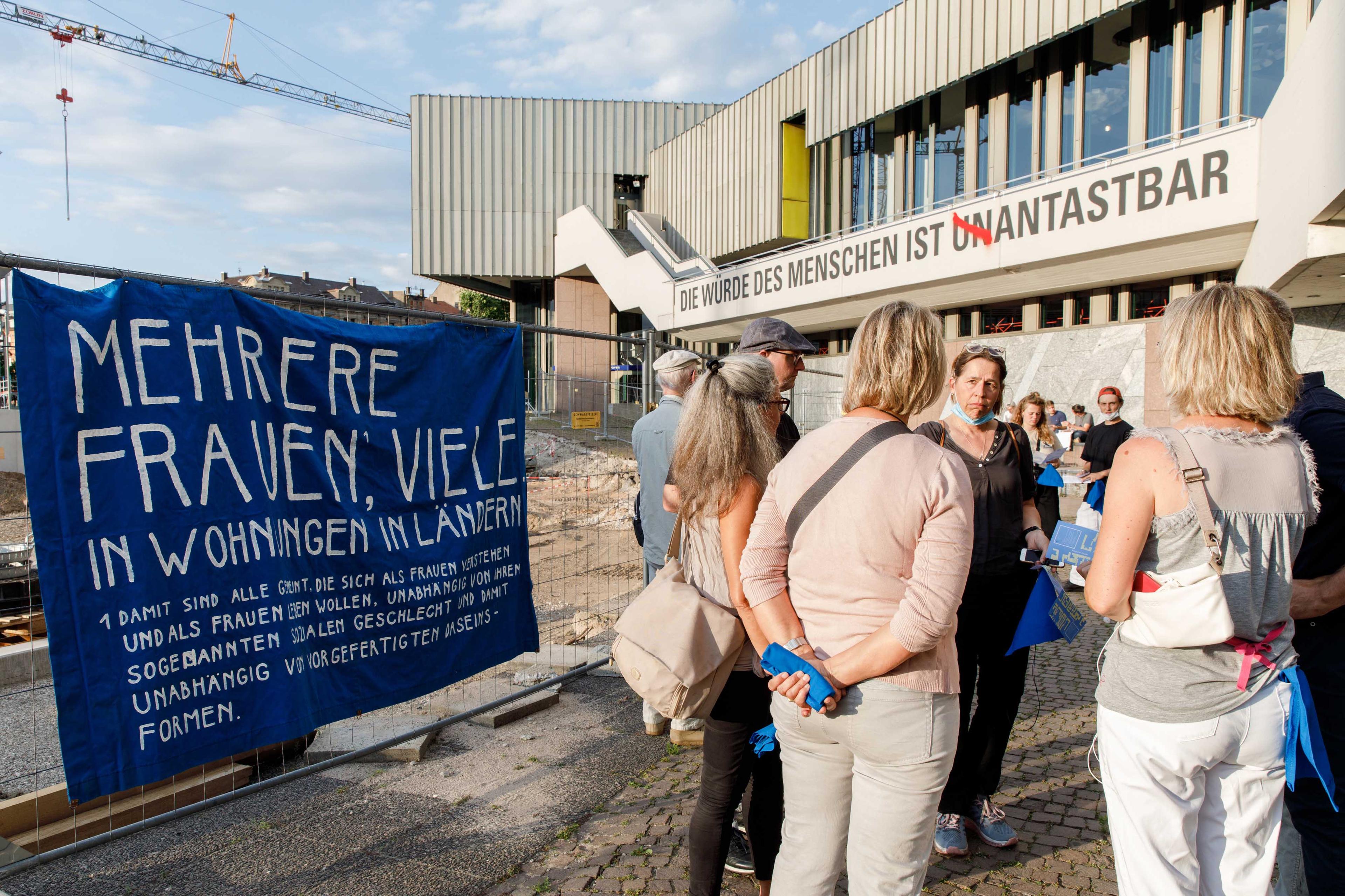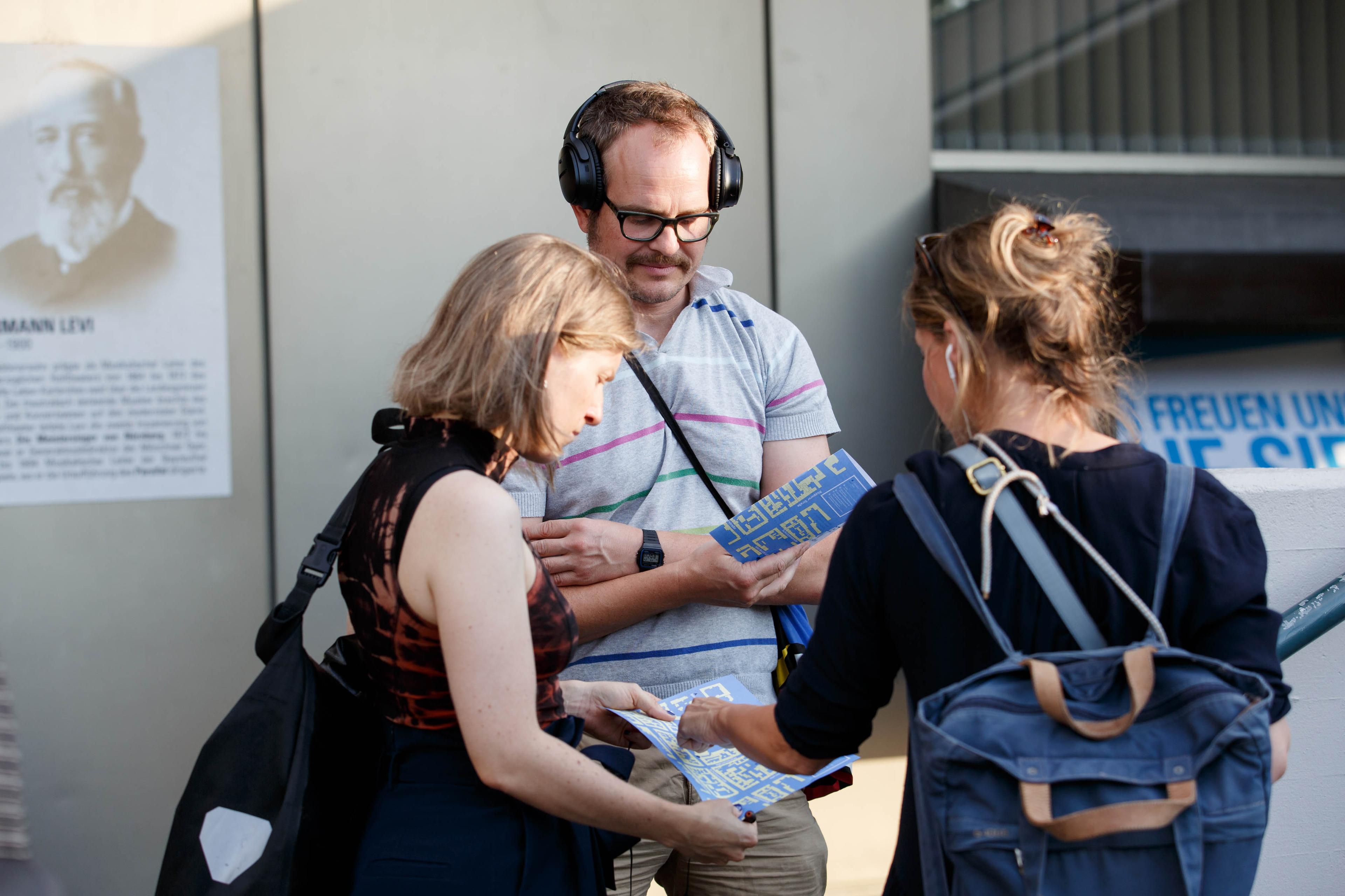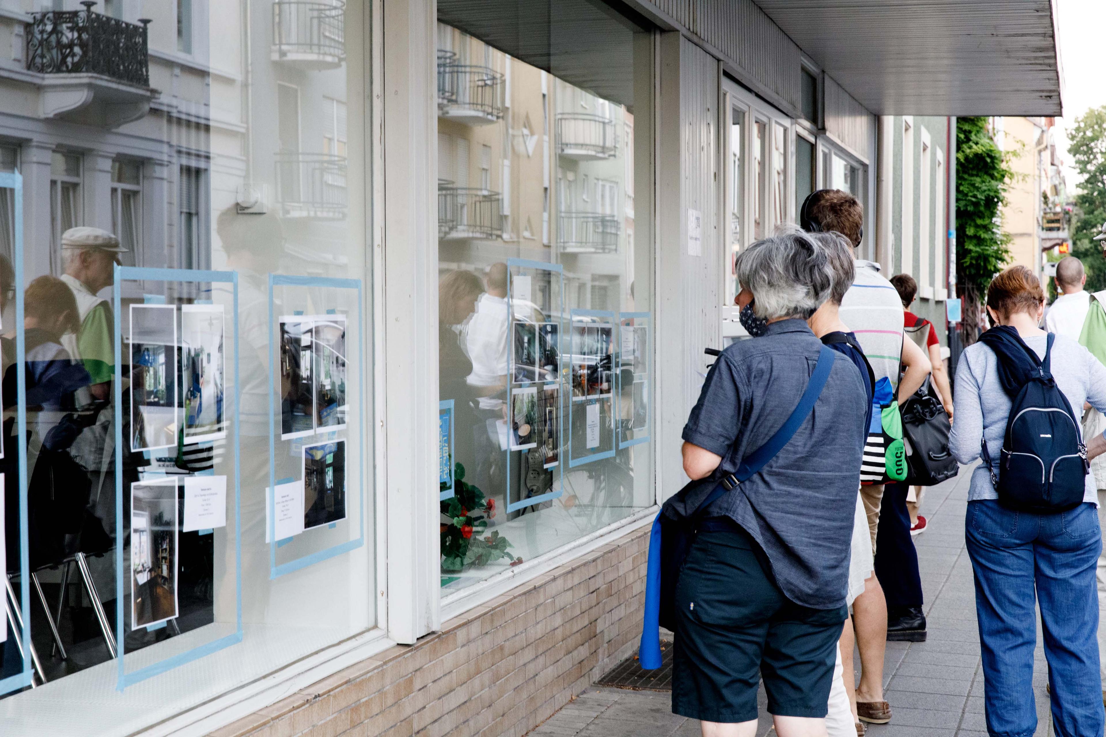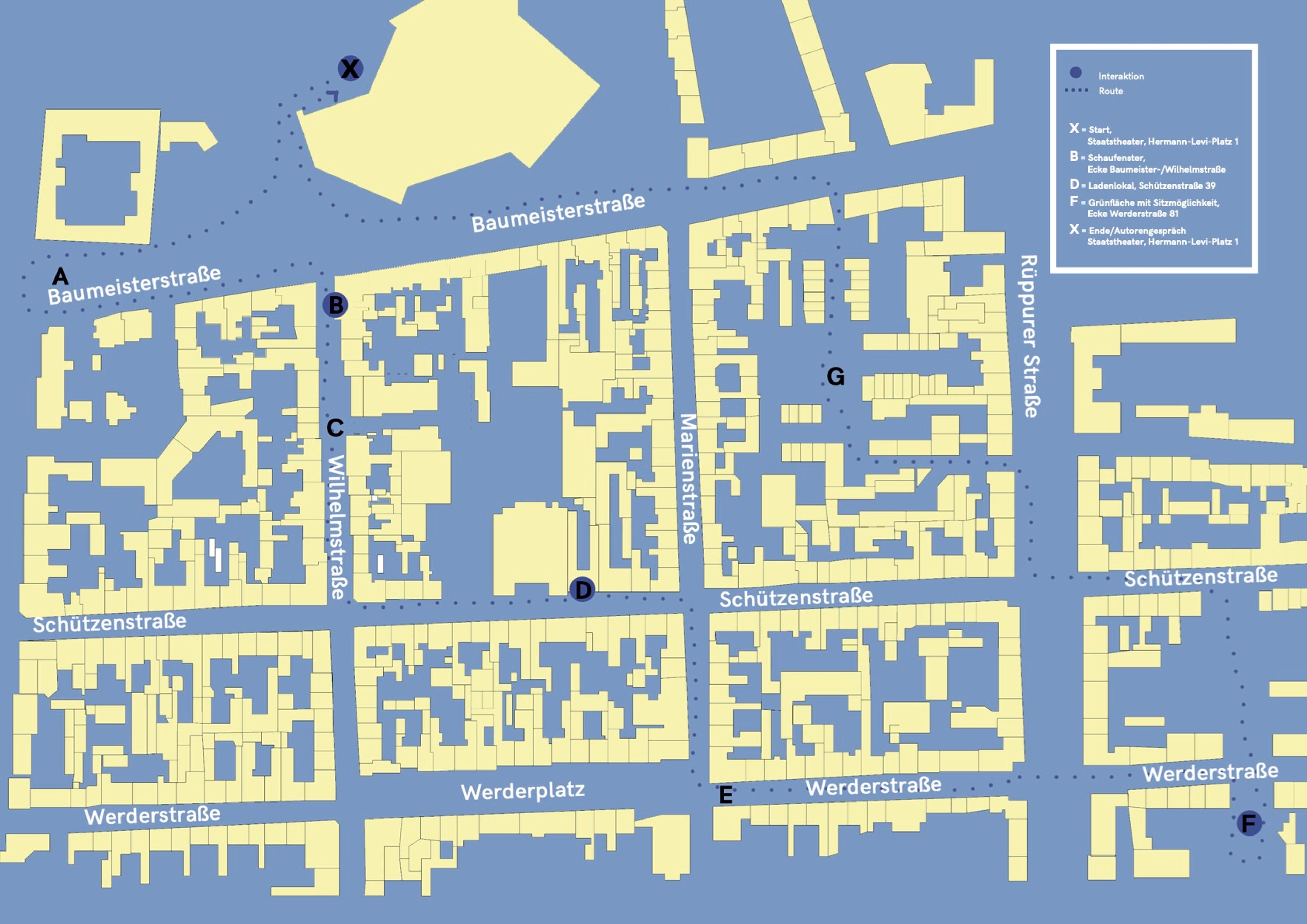 Lucie Emons), guided the participants audio-visually through the streets. The walk was complemented by various interventions: e.g. the distribution of yoghurts, posters of flats in the Markler*innen office, resting stations and a live moment with the actresses Lodi Doumit and Antonia Mohr in a vacant shop in Schützenstraße.