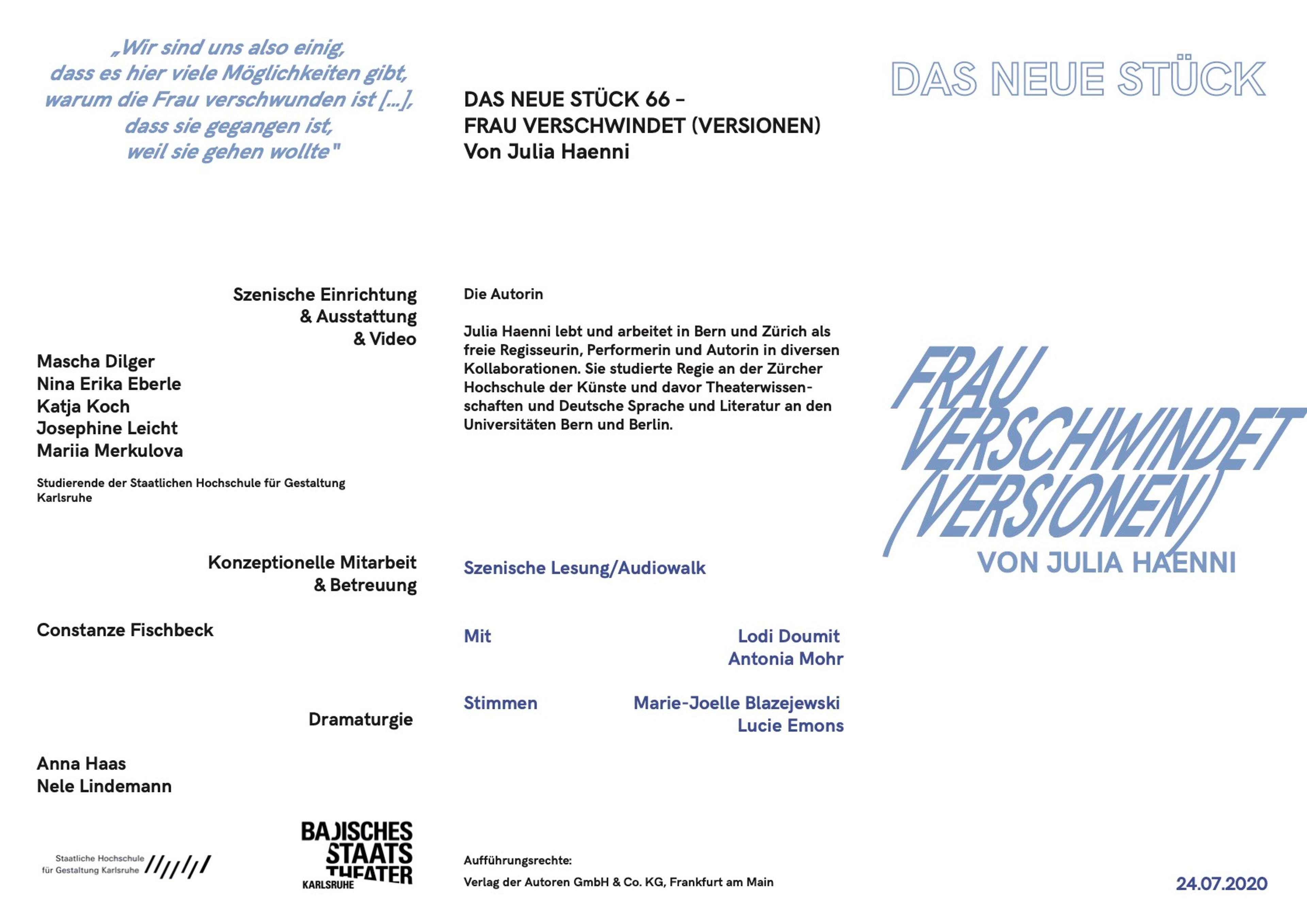 Das neue Stück is a format, in a long-standing cooperation between the Staatstheater Karlsruhe and the HfG Karlsruhe, which deals with texts by contemporary authors. The students develop a staged reading that normally takes place in the Staatstheater's studio.