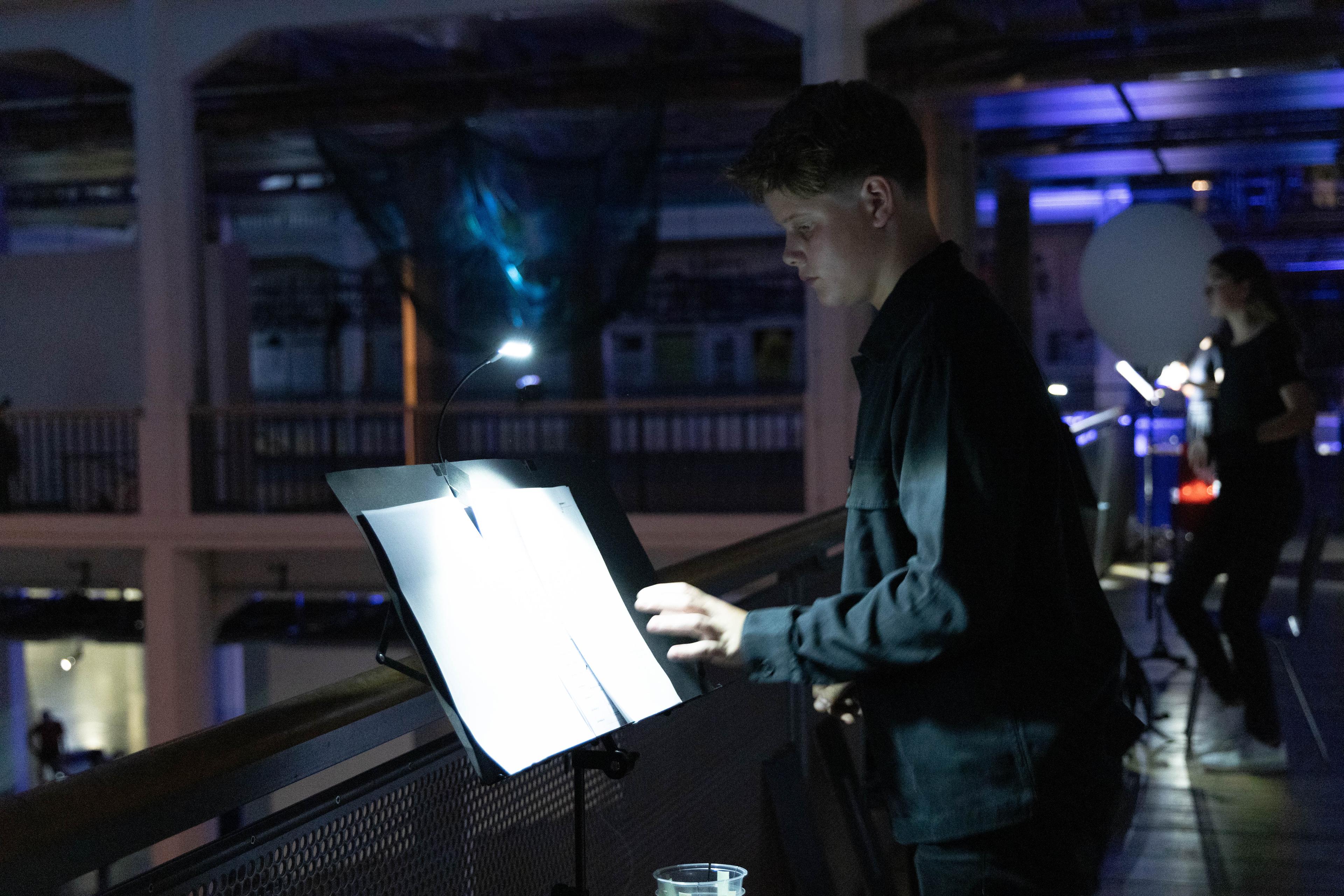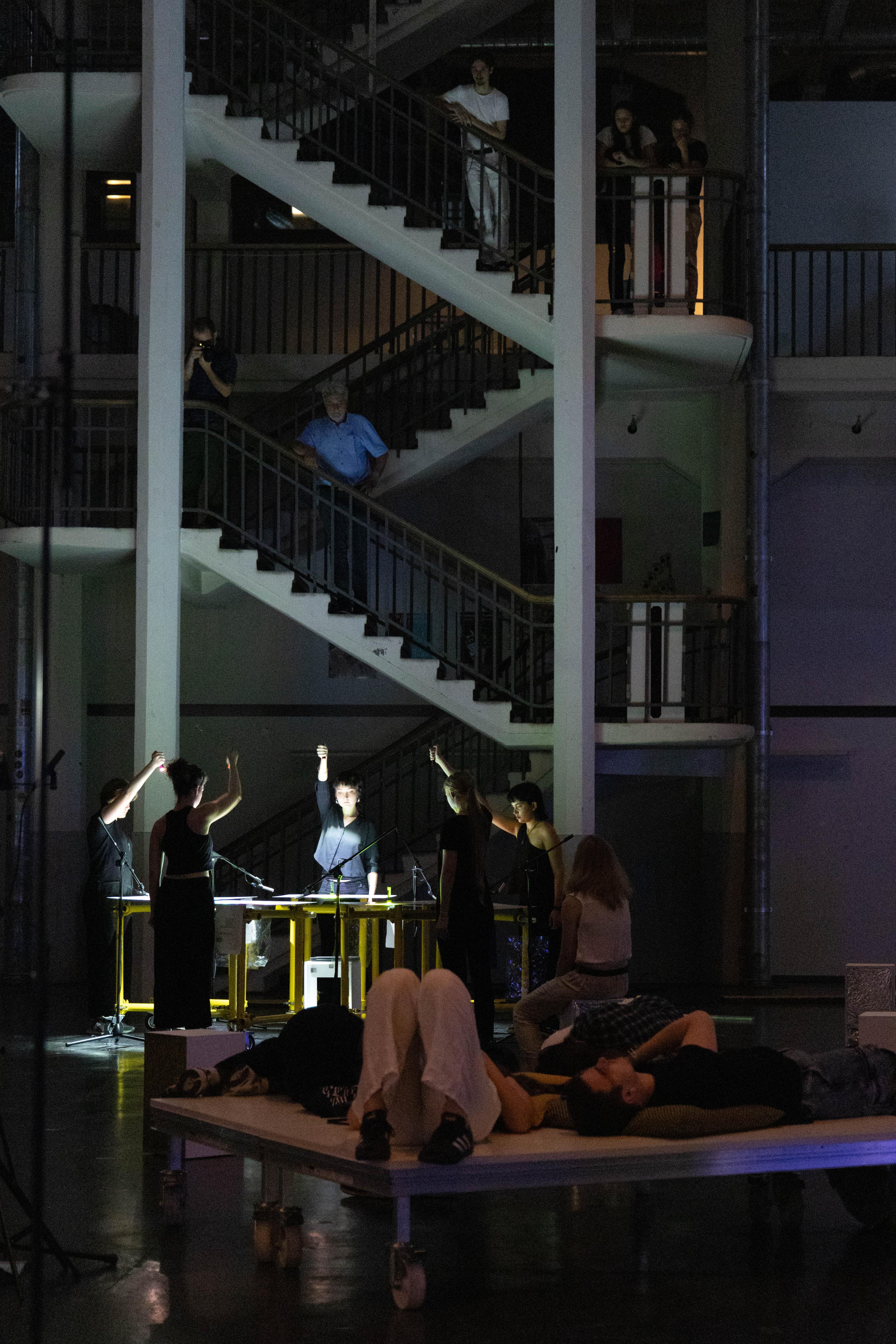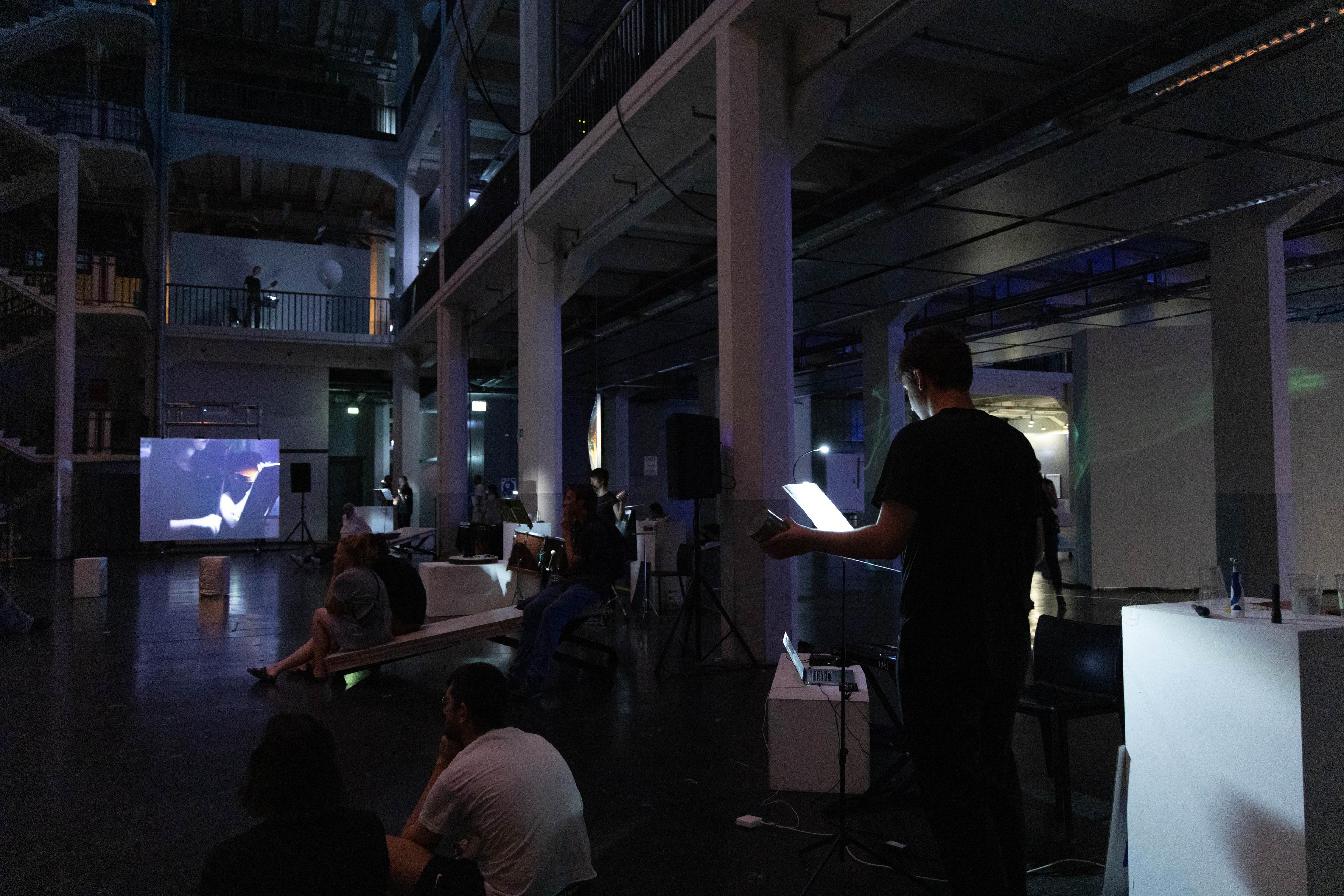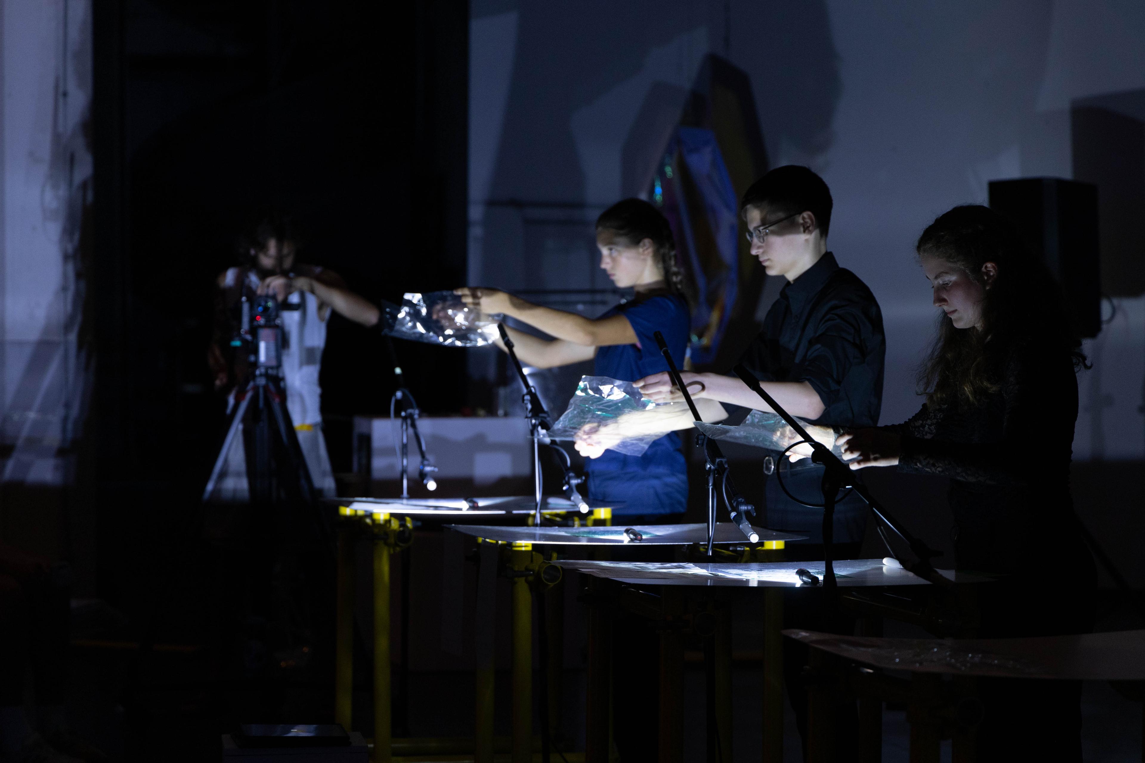 Somit fanden an zwei Abenden in der HfG eine ortsspezifische Komposition des Hamburger Komponisten Michael Maierhof mit Unterstützung der Studierenden aus dem Fachbereich Ausstellungsdesign und Szenografie, gespielt vom Landesjugendensemble Neue Musik Baden-Württemberg statt.
