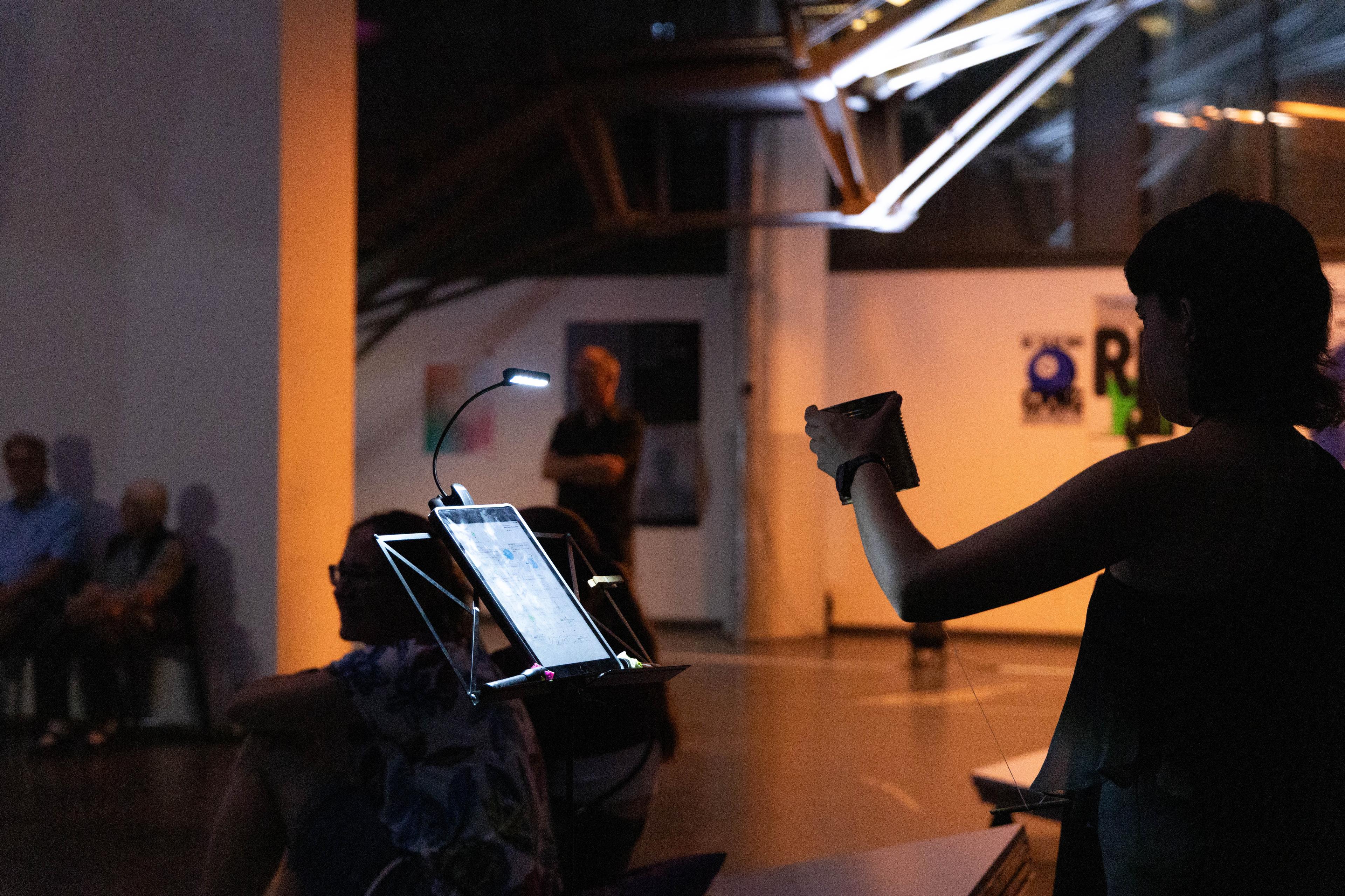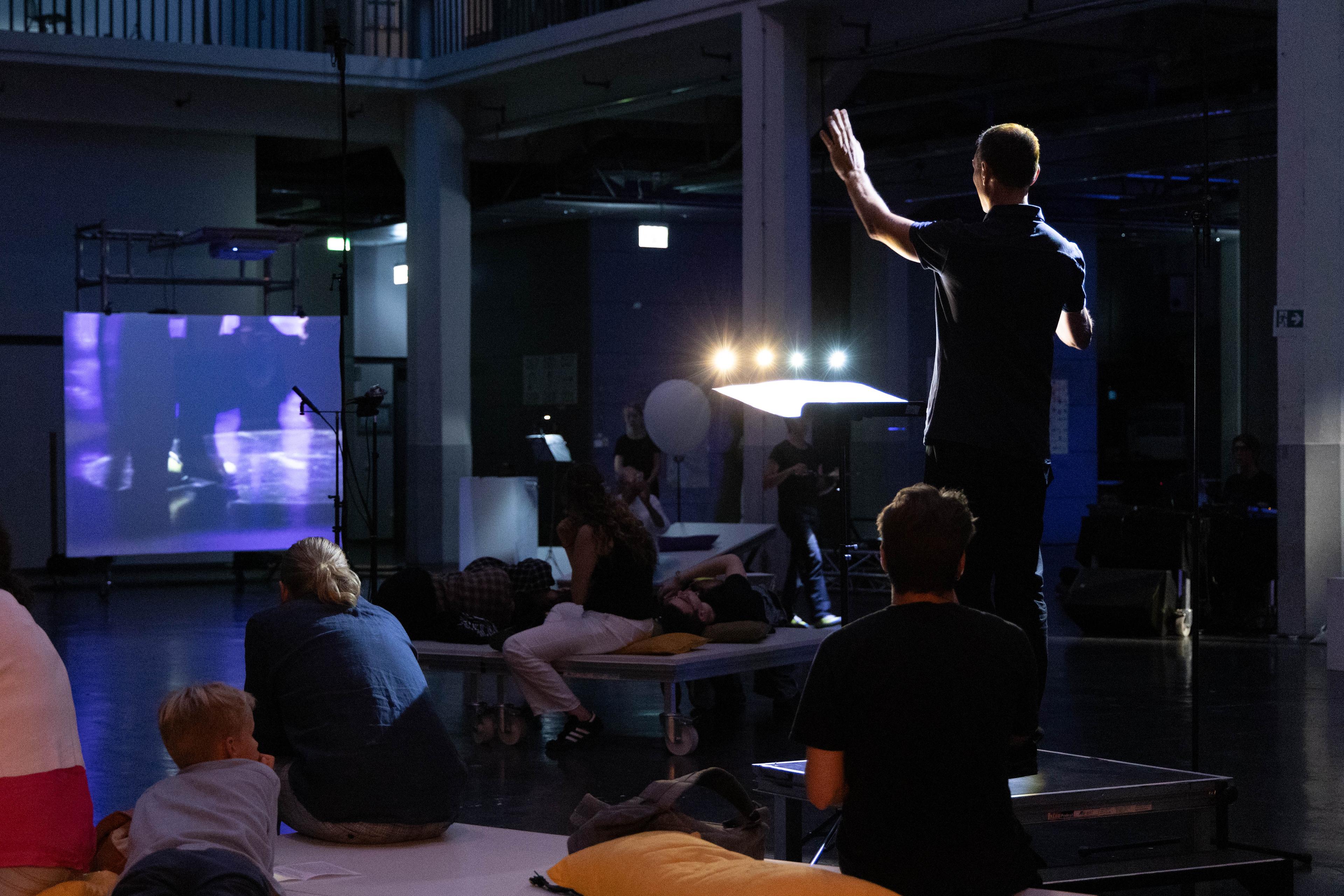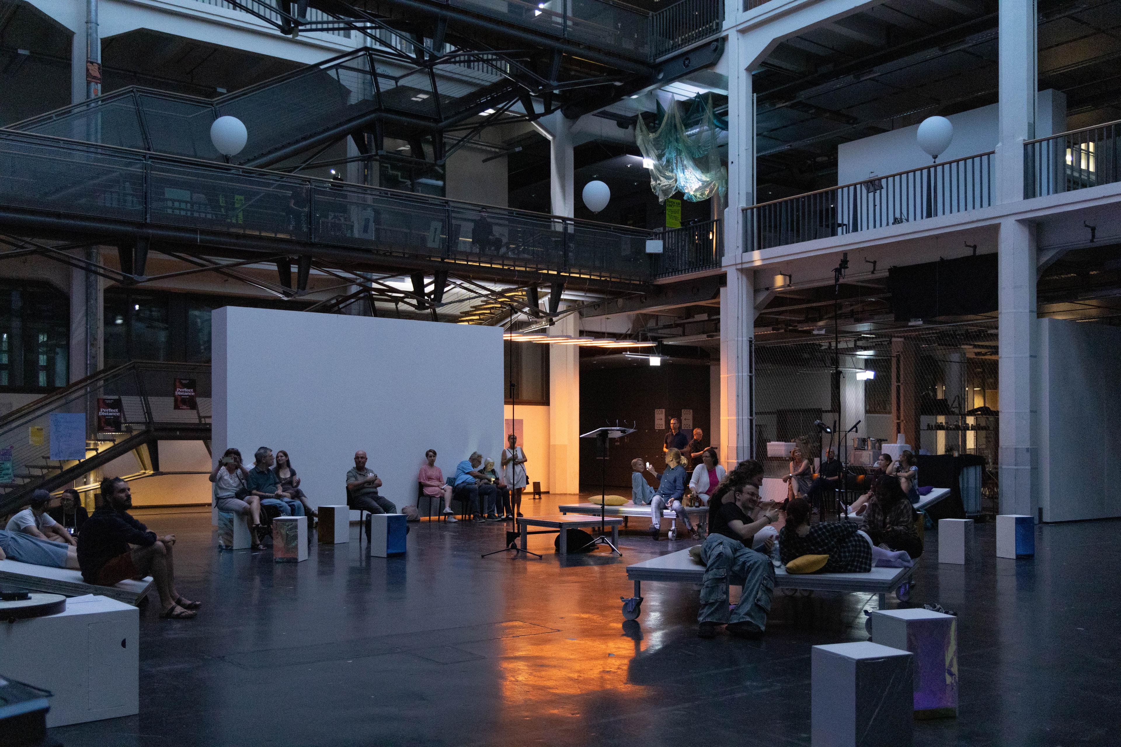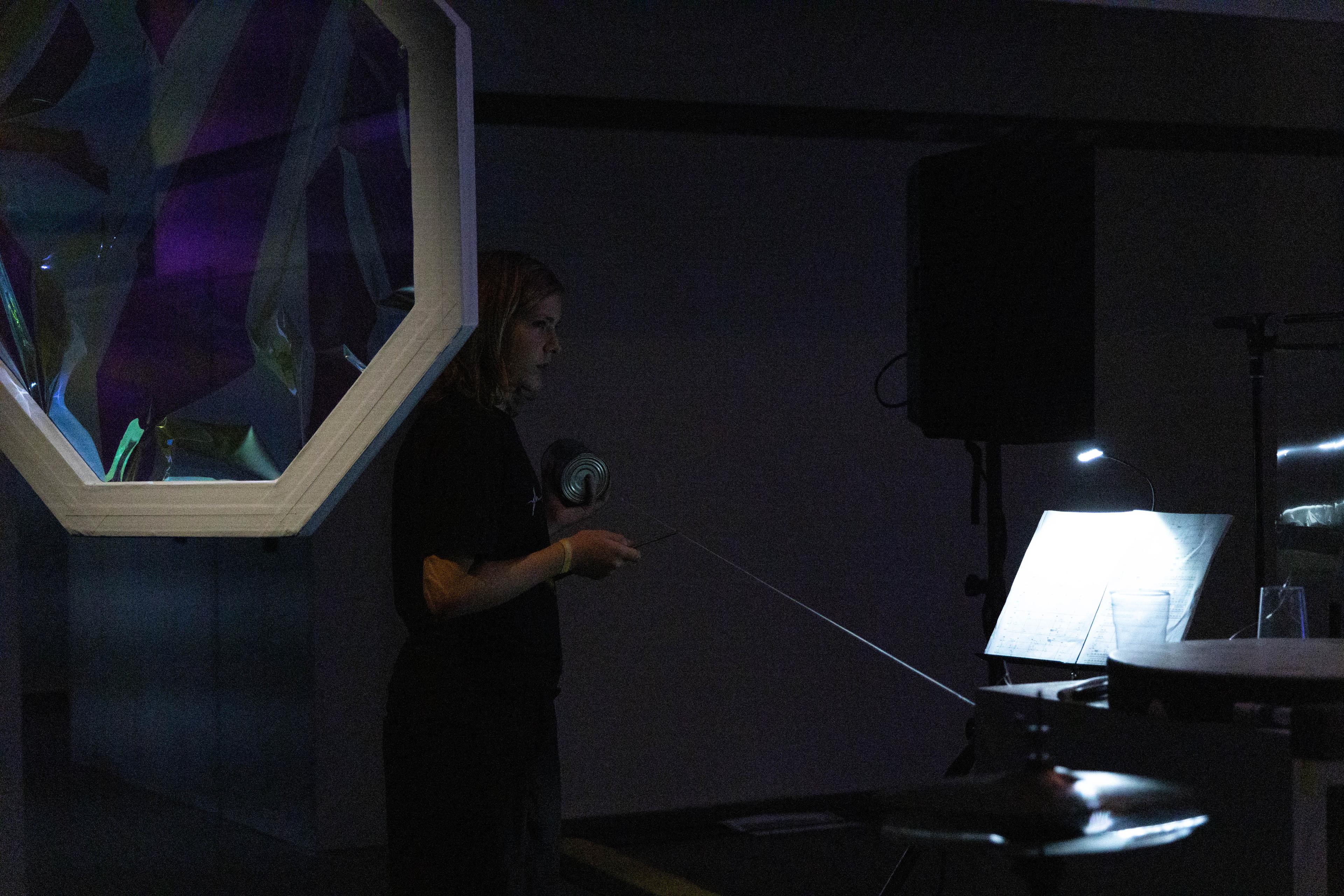 Somit fanden an zwei Abenden in der HfG eine ortsspezifische Komposition des Hamburger Komponisten Michael Maierhof mit Unterstützung der Studierenden aus dem Fachbereich Ausstellungsdesign und Szenografie, gespielt vom Landesjugendensemble Neue Musik Baden-Württemberg statt.