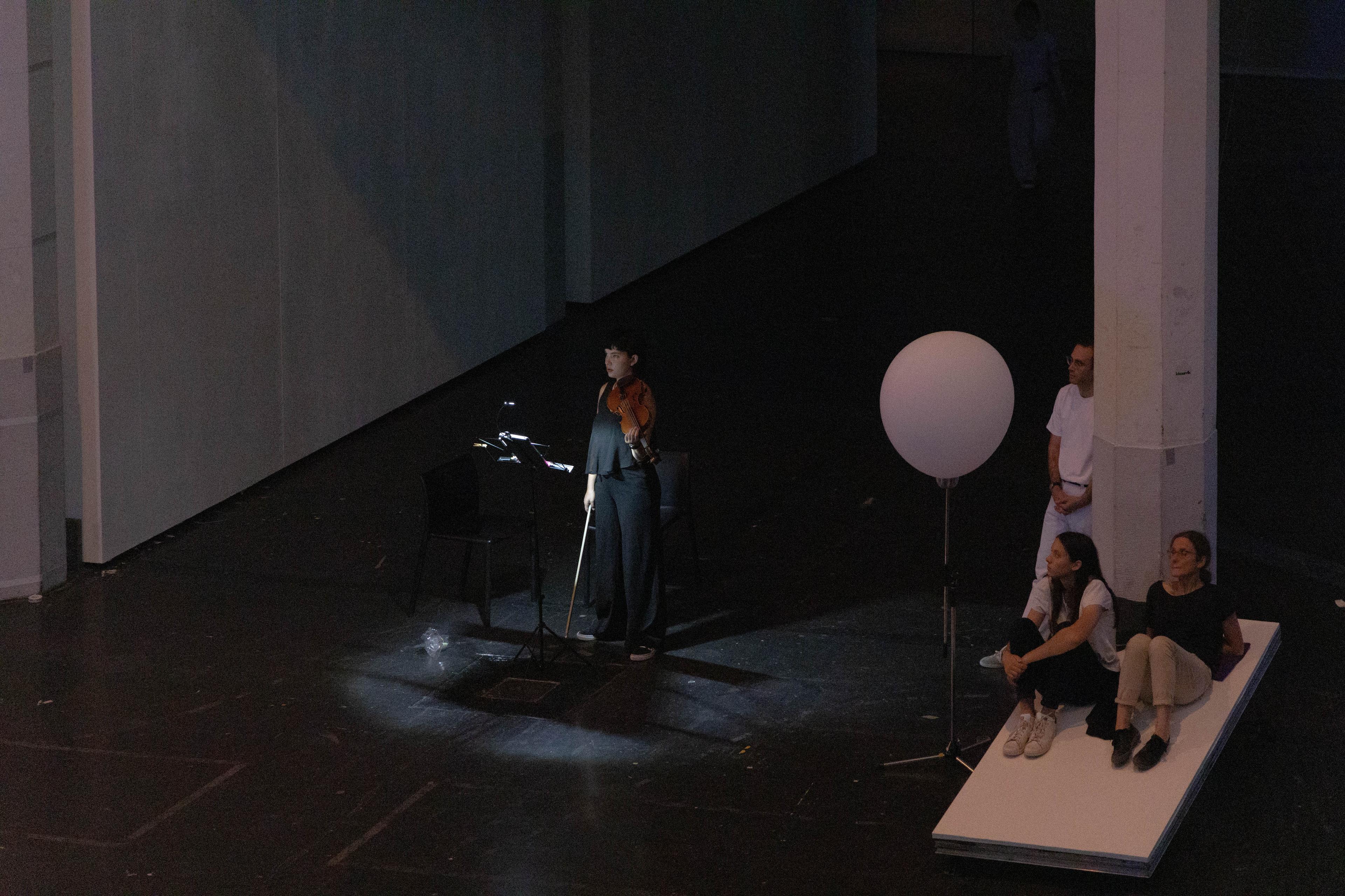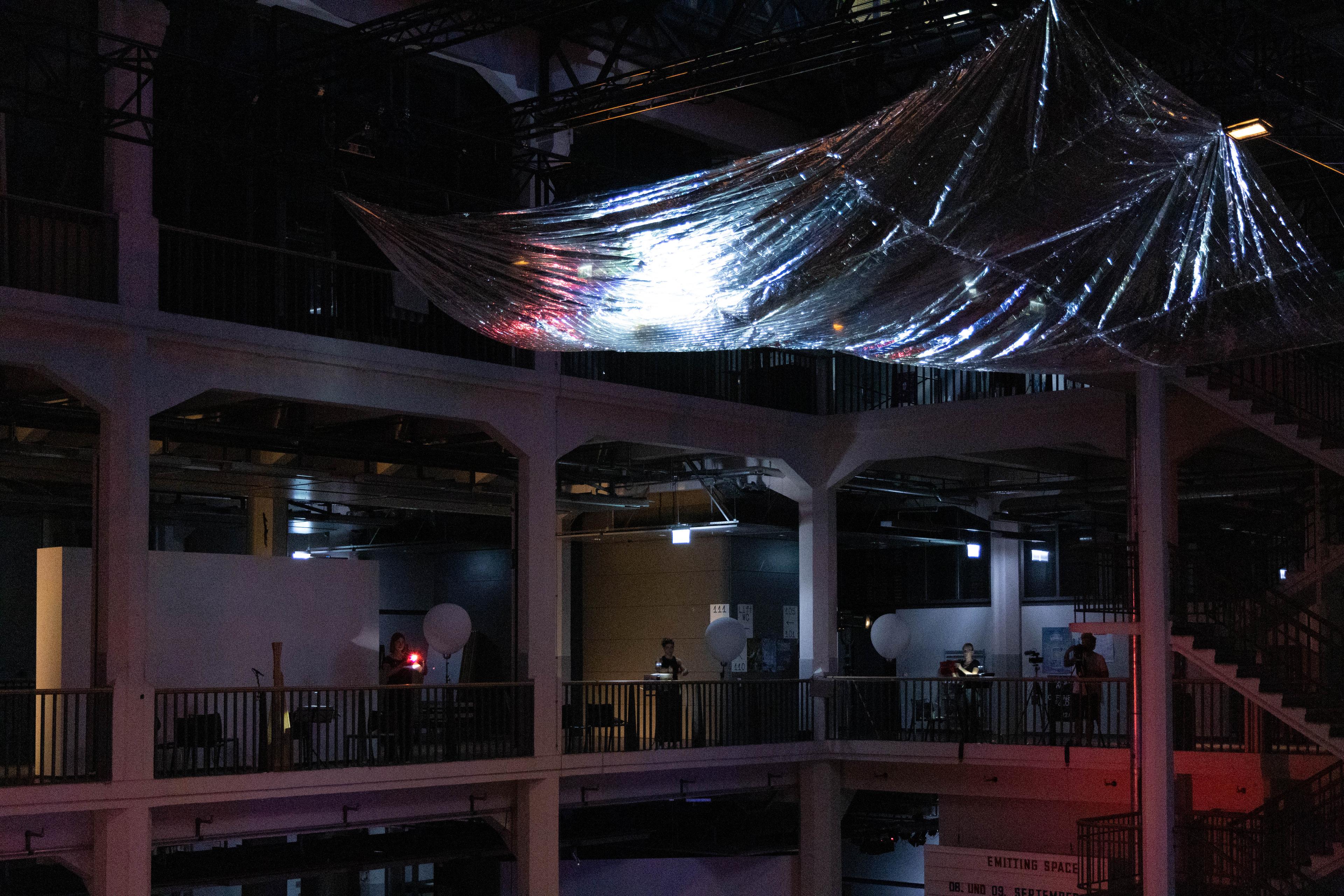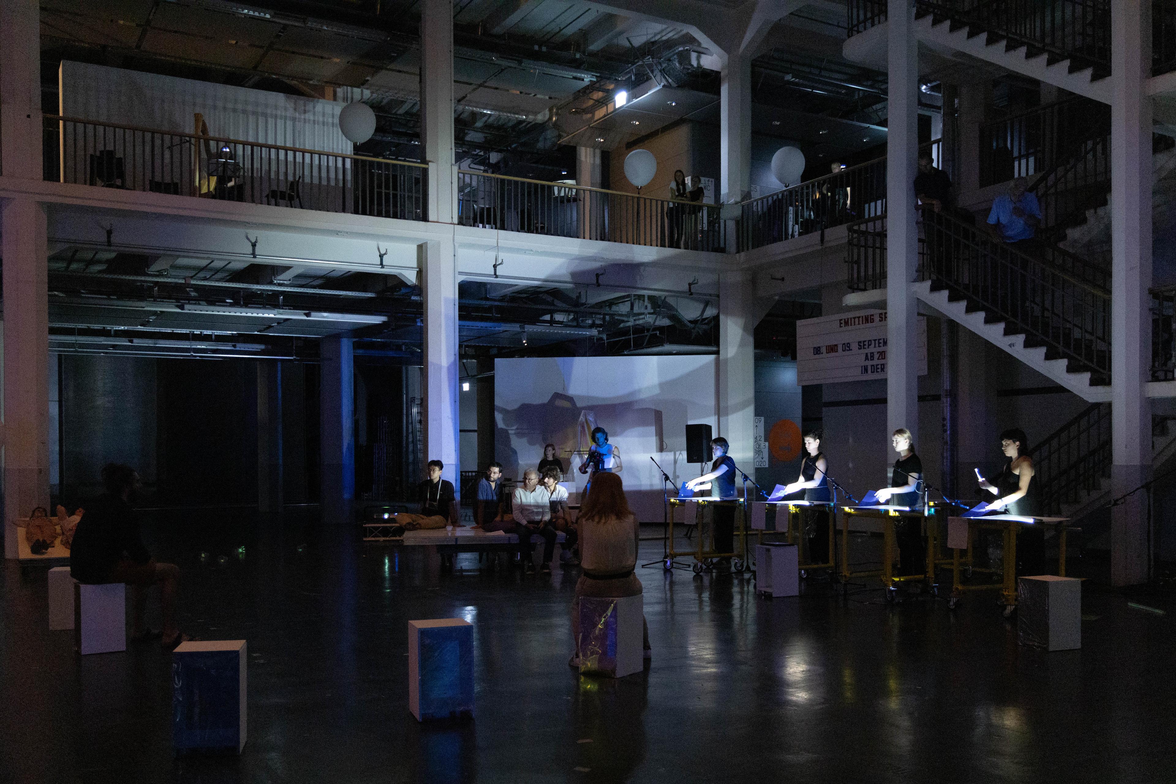 „Emitting Space“ nutzt den Raum der Hochschule für Gestaltung in Karlsruhe mit seinen Lichthöfen, um aus einem normalen Konzert mit Bühne eine 360 Grad Bühne auf mehreren Ebenen erfahrbar zu machen.