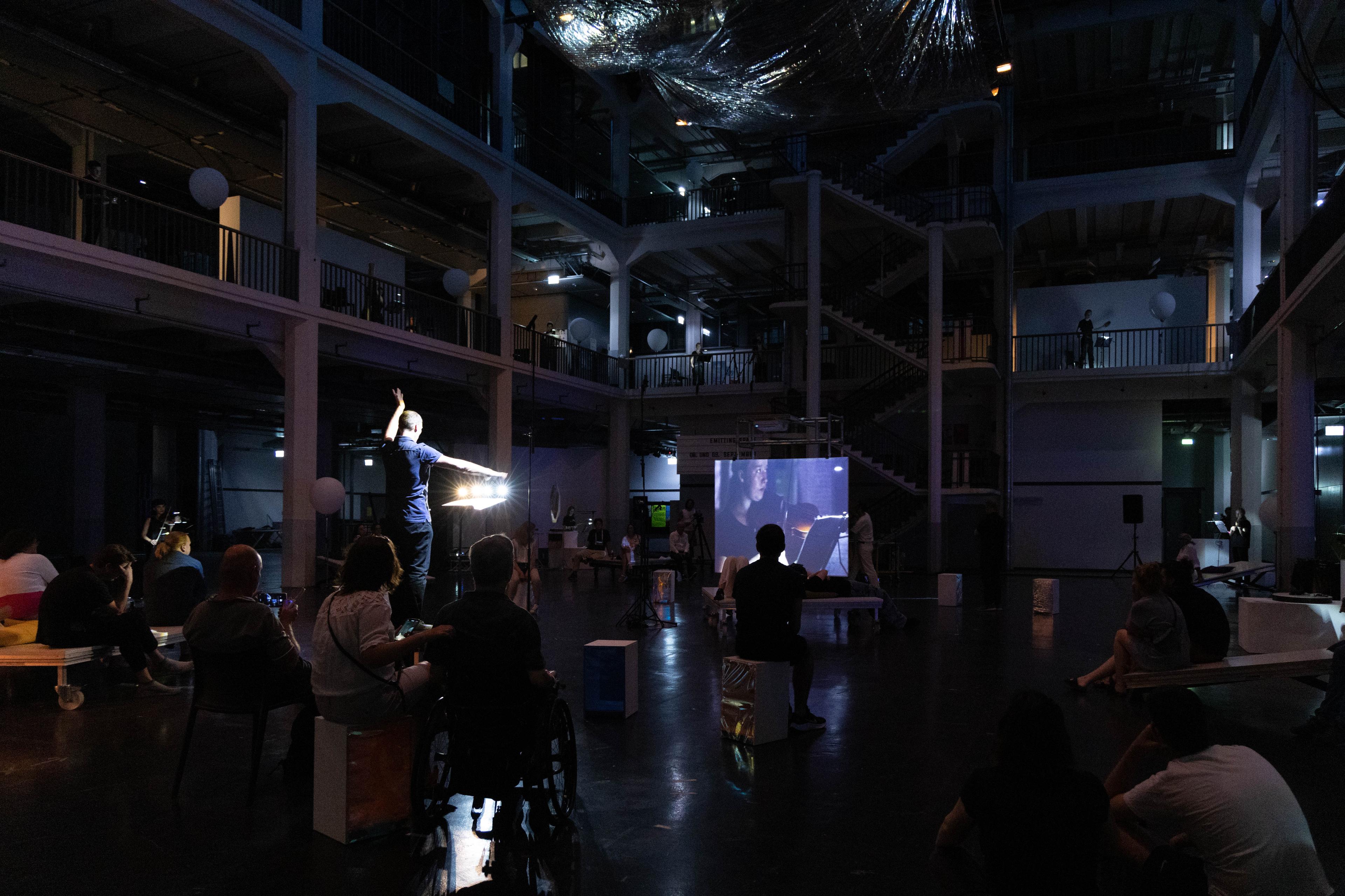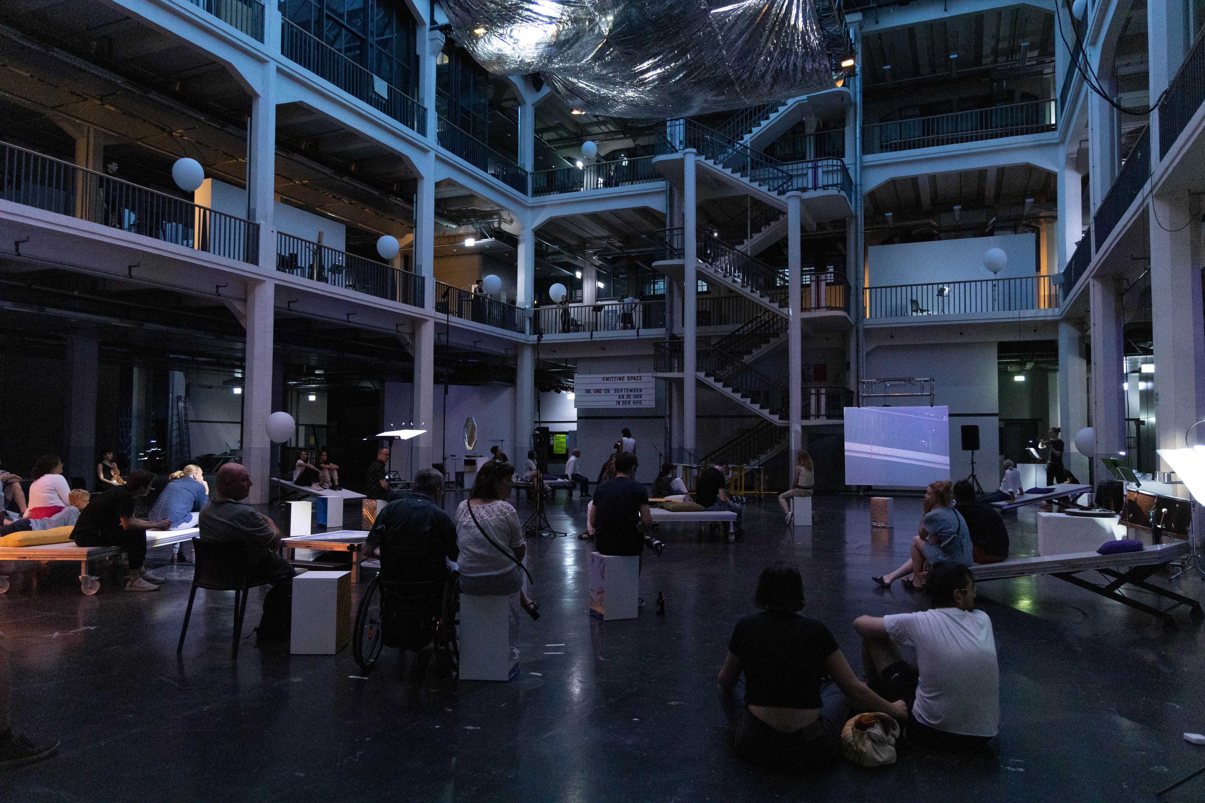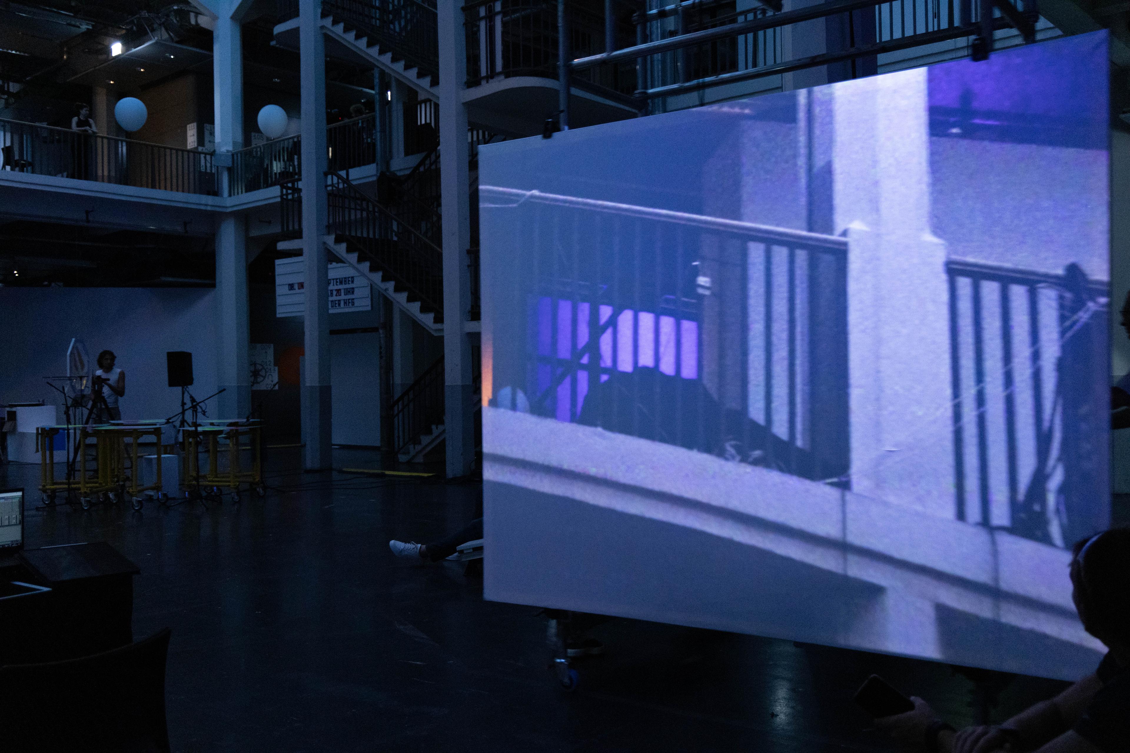 „Emitting Space“ nutzt den Raum der Hochschule für Gestaltung in Karlsruhe mit seinen Lichthöfen, um aus einem normalen Konzert mit Bühne eine 360 Grad Bühne auf mehreren Ebenen erfahrbar zu machen.