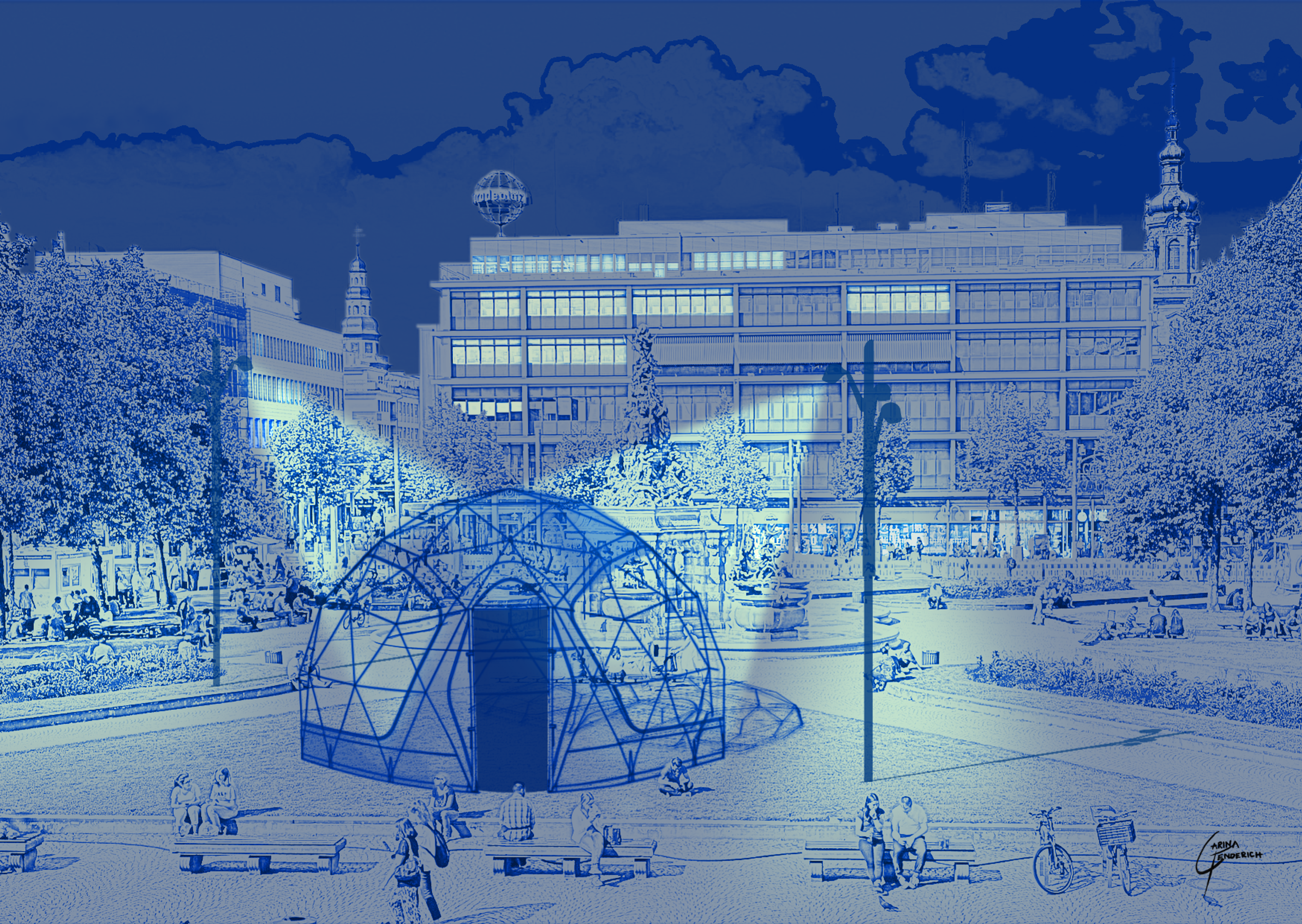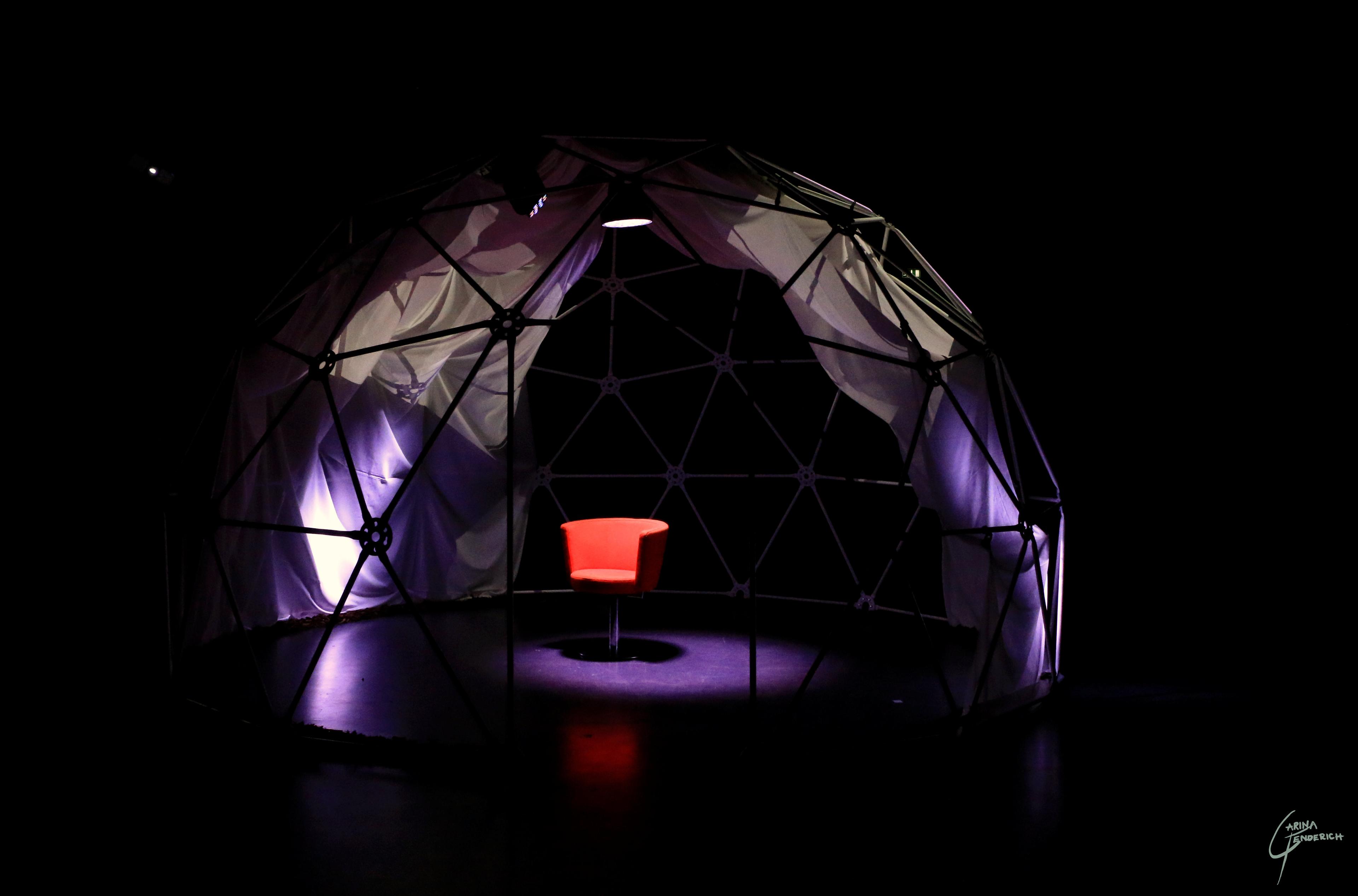 In addition to a written version, in which reflections from my perspective as a stage designer on the spatial sequence of theatre architectures are presented, it is an experimental light/sound and video production. This will be shown in a room-within-a-room installation, a geodesic dome designed by Buckminster Fuller. With its outstanding lighting and acoustic properties, the dome is an attractive setting for a theatre production both indoors and outdoors. Away from monumental memorial buildings to easily erectable and immersive tent structures that can be integrated into the public space and thus make theatre visible in the city.