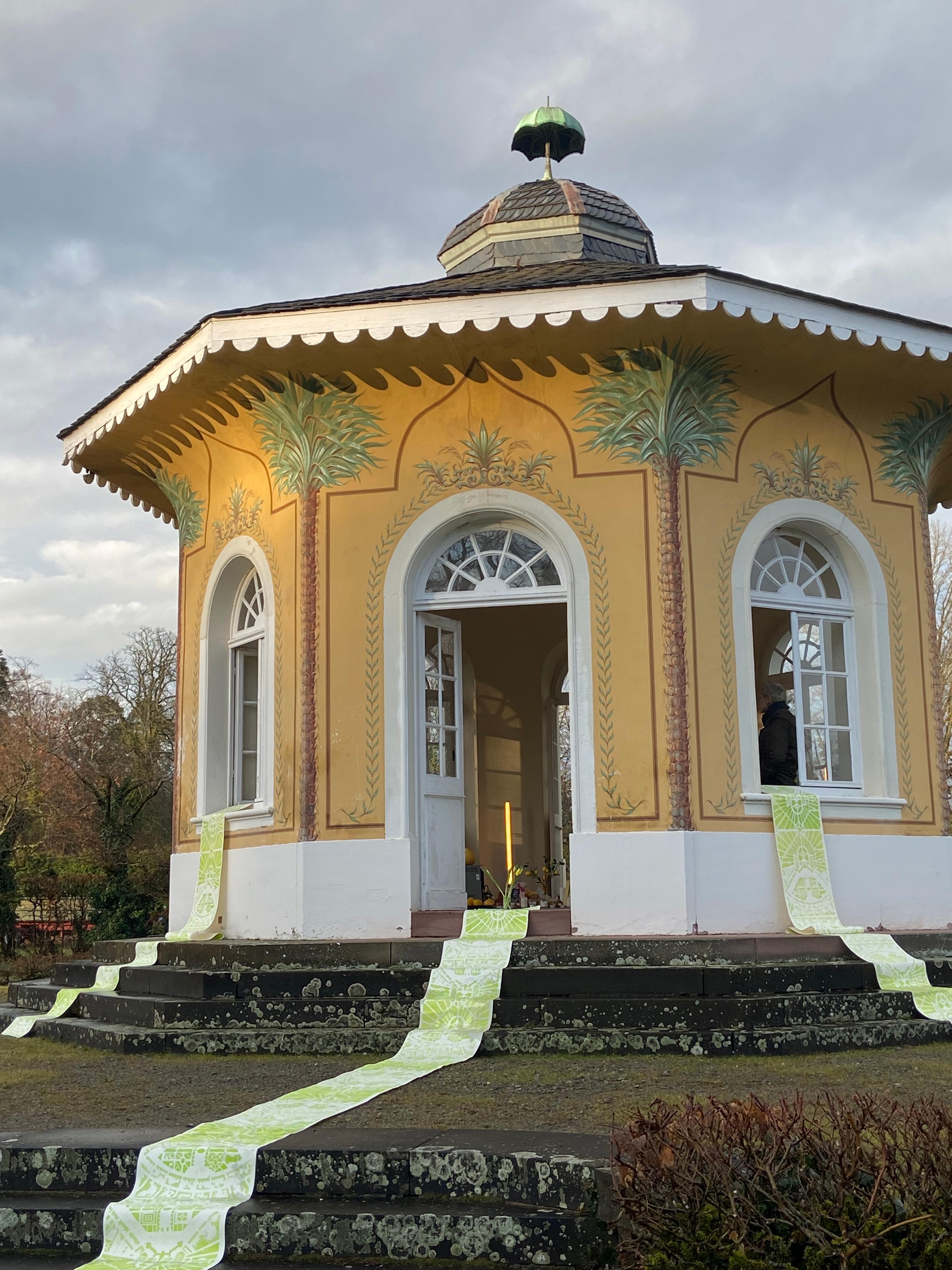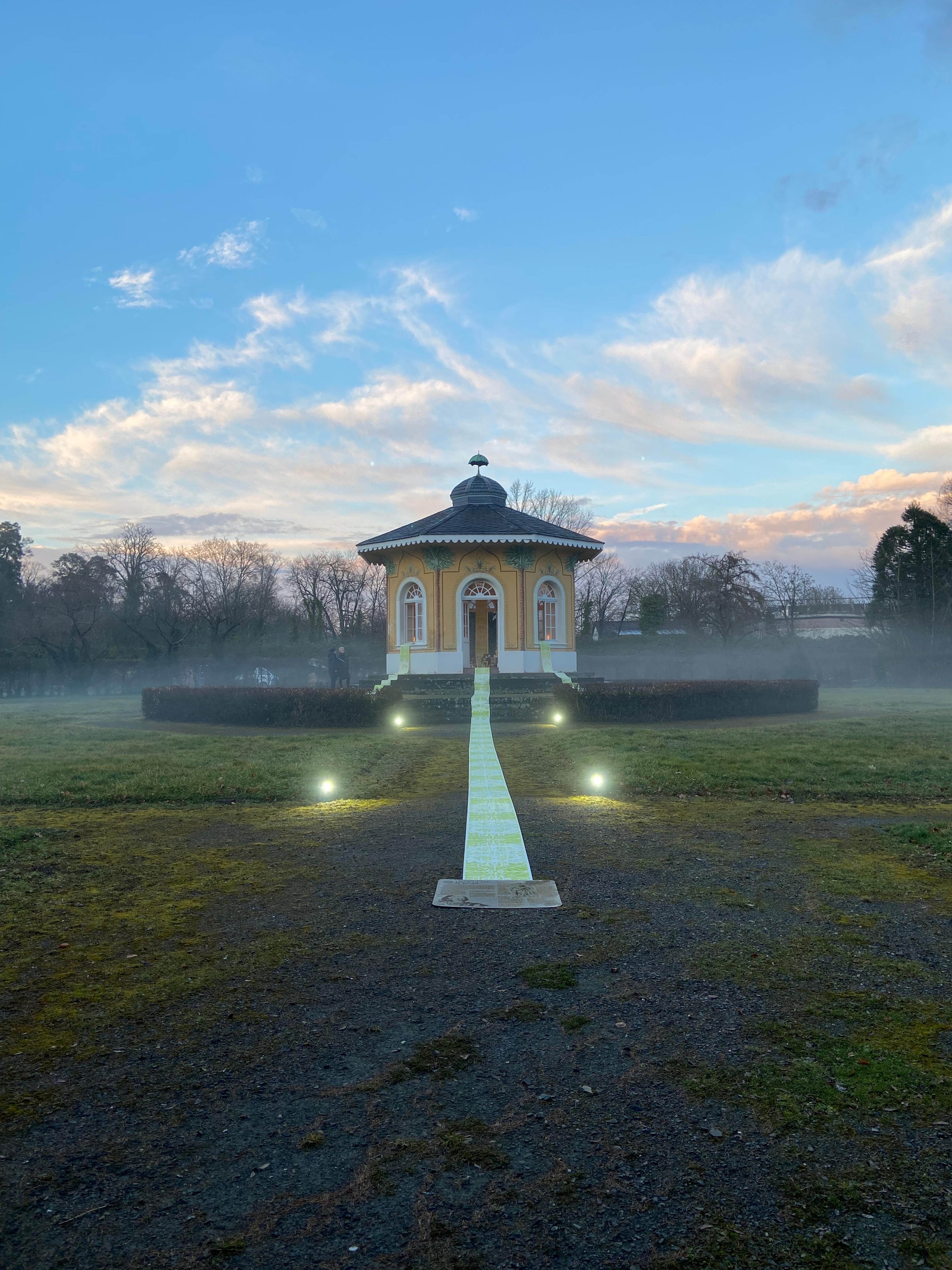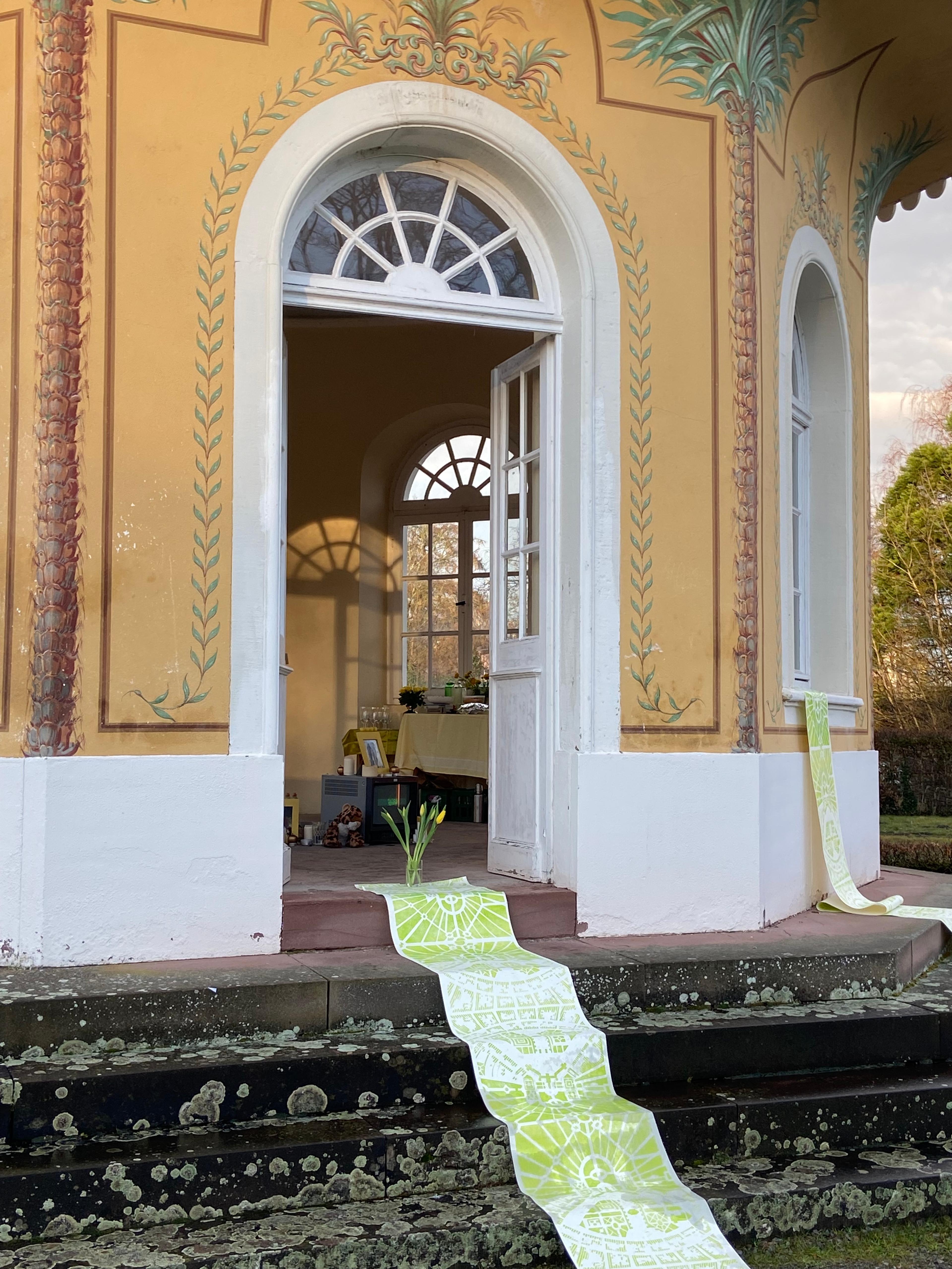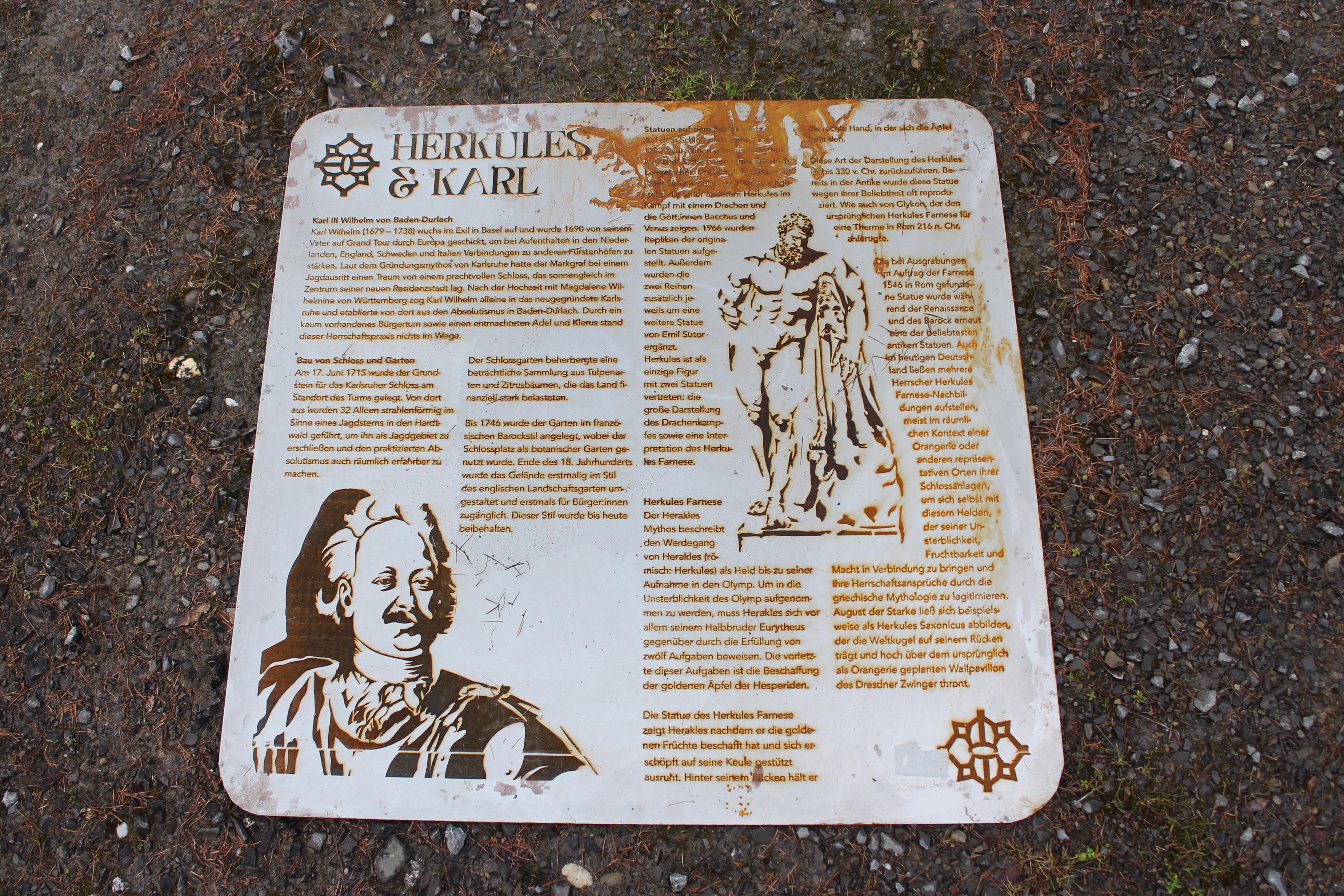 Die Spuren der ursprüngliche Anlage sind in der Linolschnittserie mit einem Motiv basierend auf einem Bepflanzungsplan des Karlsruher Barockgartens sichtbar und ziehen die Besucher:innen der Installation von einer Metallplatte, die über die historischen Zusammenhänge der Arbeit aufklärt, in das Teehaus, den letzten Überrest des Barockgartens. Im Inneren des Pavillons steht eine Gedenkstätte für Karl, Barockgärten und die vergangenen Zeit, für die diese Männer zu Symbolfiguren wurden.