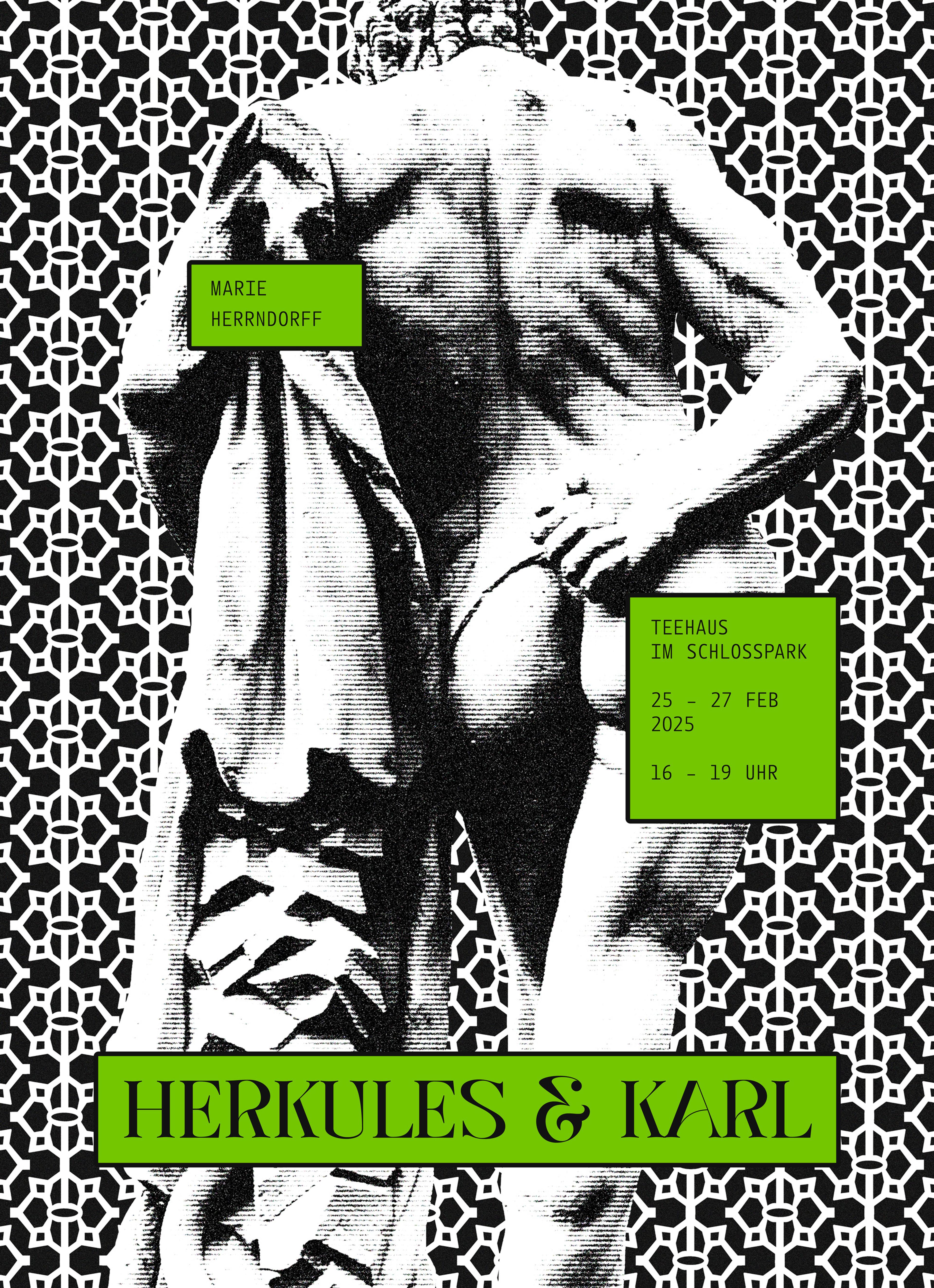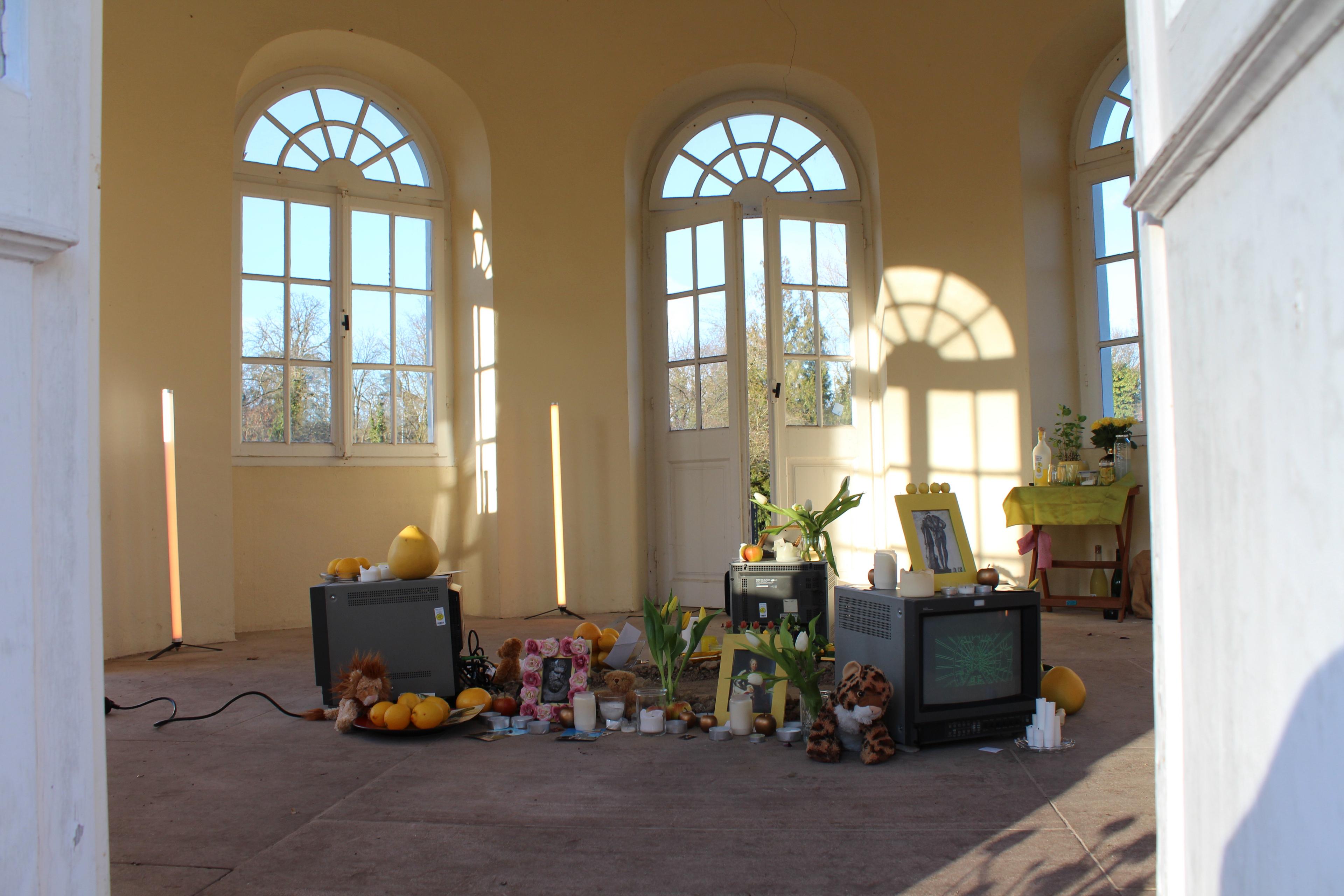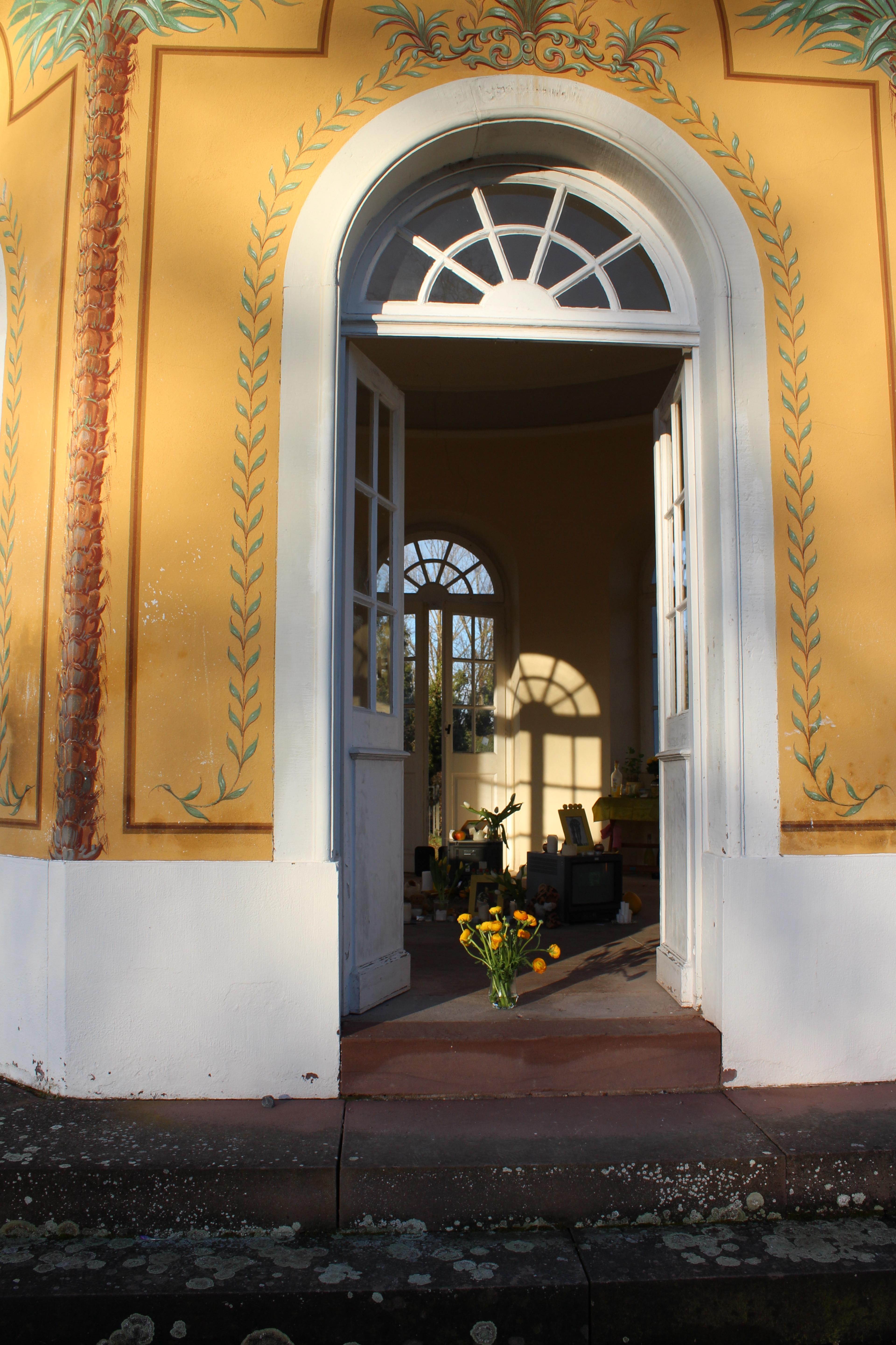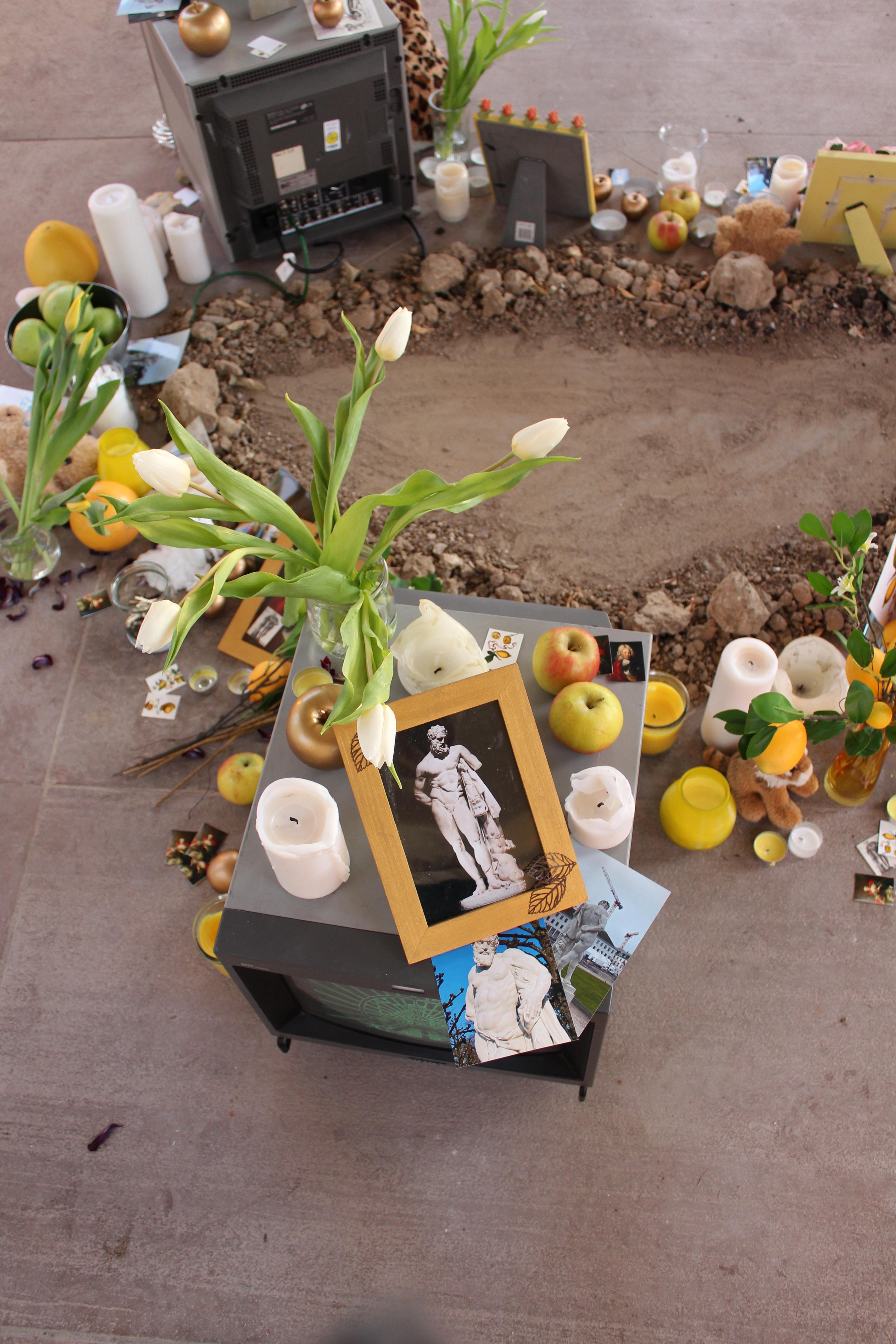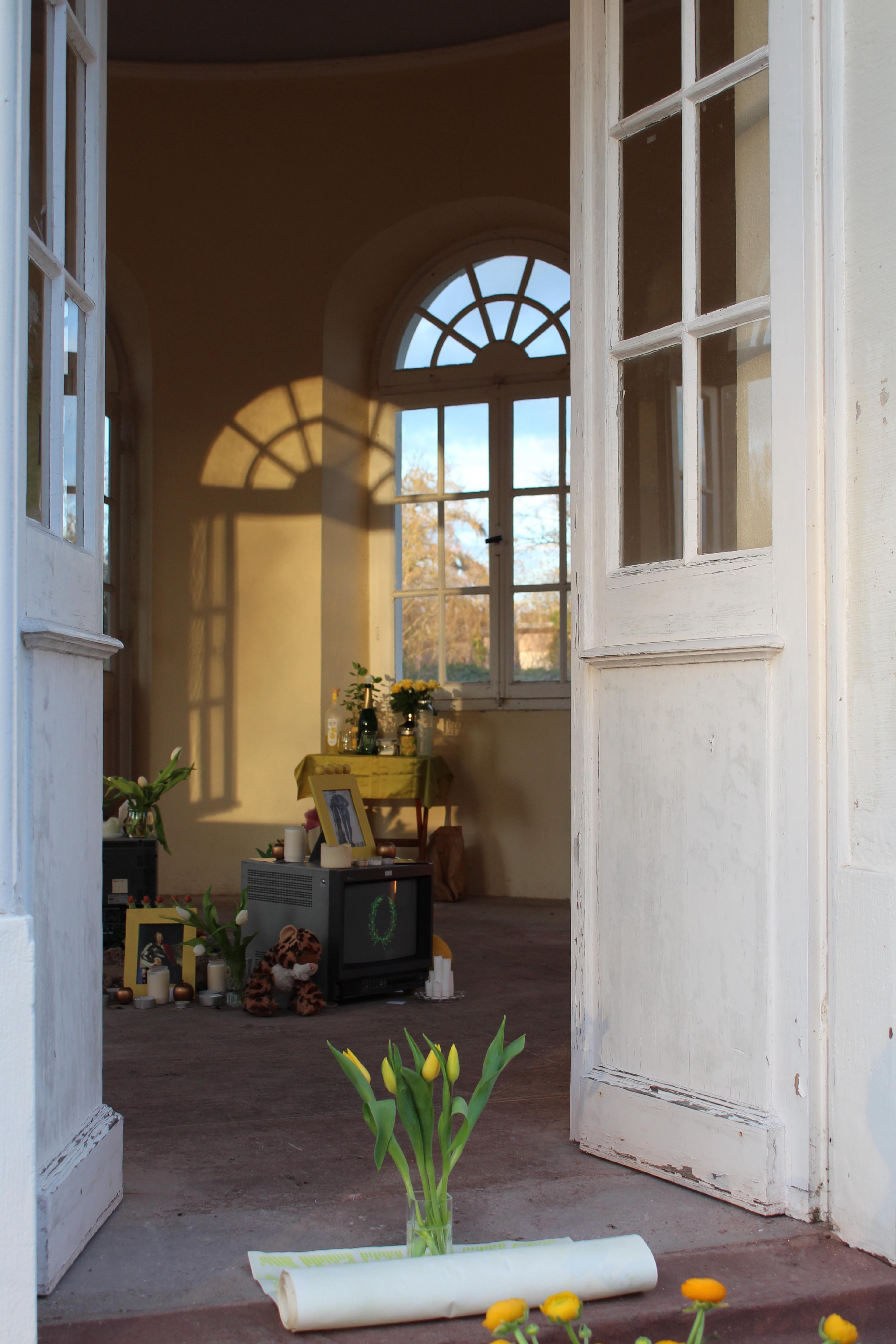 Die Spuren der ursprüngliche Anlage sind in der Linolschnittserie mit einem Motiv basierend auf einem Bepflanzungsplan des Karlsruher Barockgartens sichtbar und ziehen die Besucher:innen der Installation von einer Metallplatte, die über die historischen Zusammenhänge der Arbeit aufklärt, in das Teehaus, den letzten Überrest des Barockgartens. Im Inneren des Pavillons steht eine Gedenkstätte für Karl, Barockgärten und die vergangenen Zeit, für die diese Männer zu Symbolfiguren wurden.