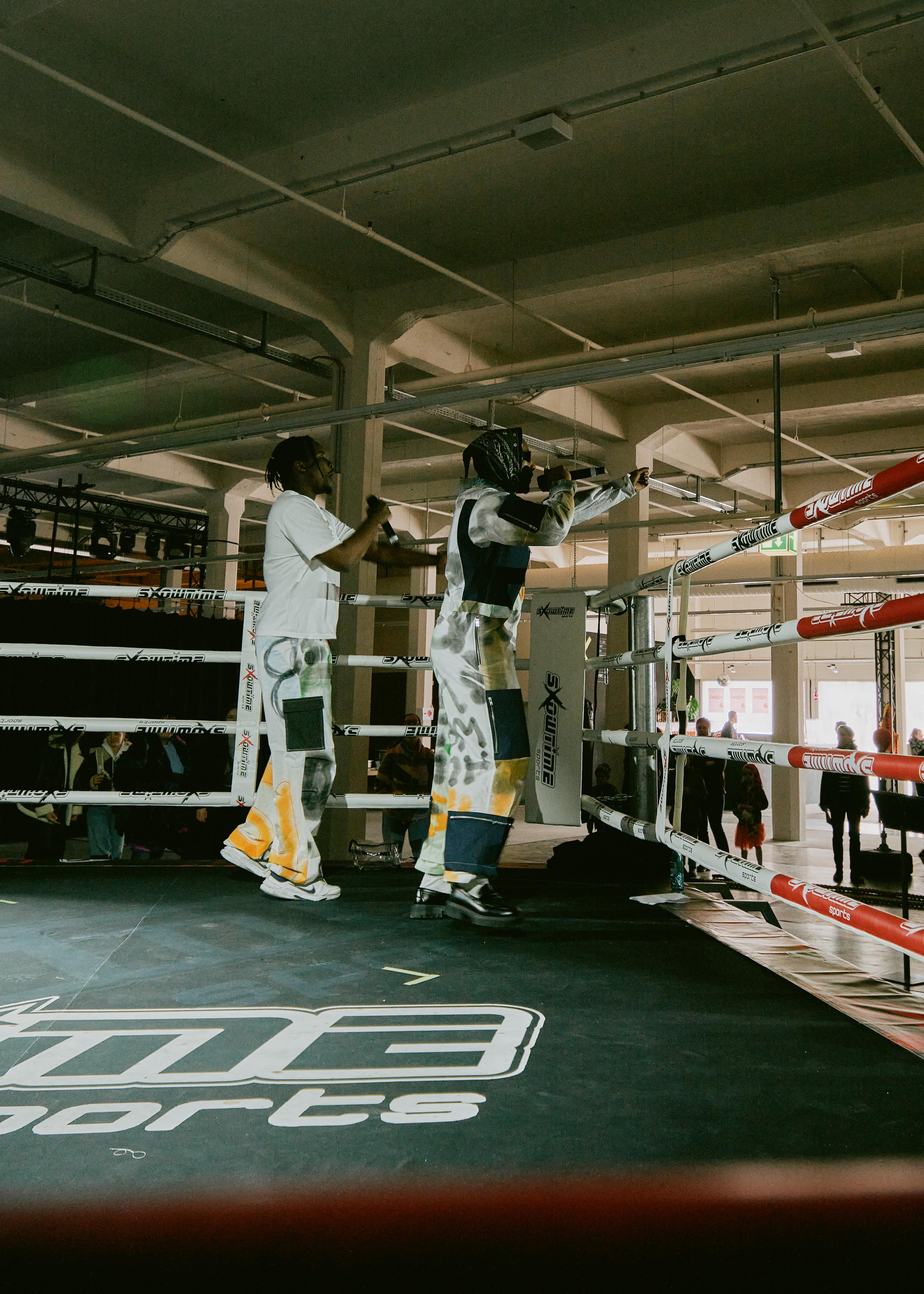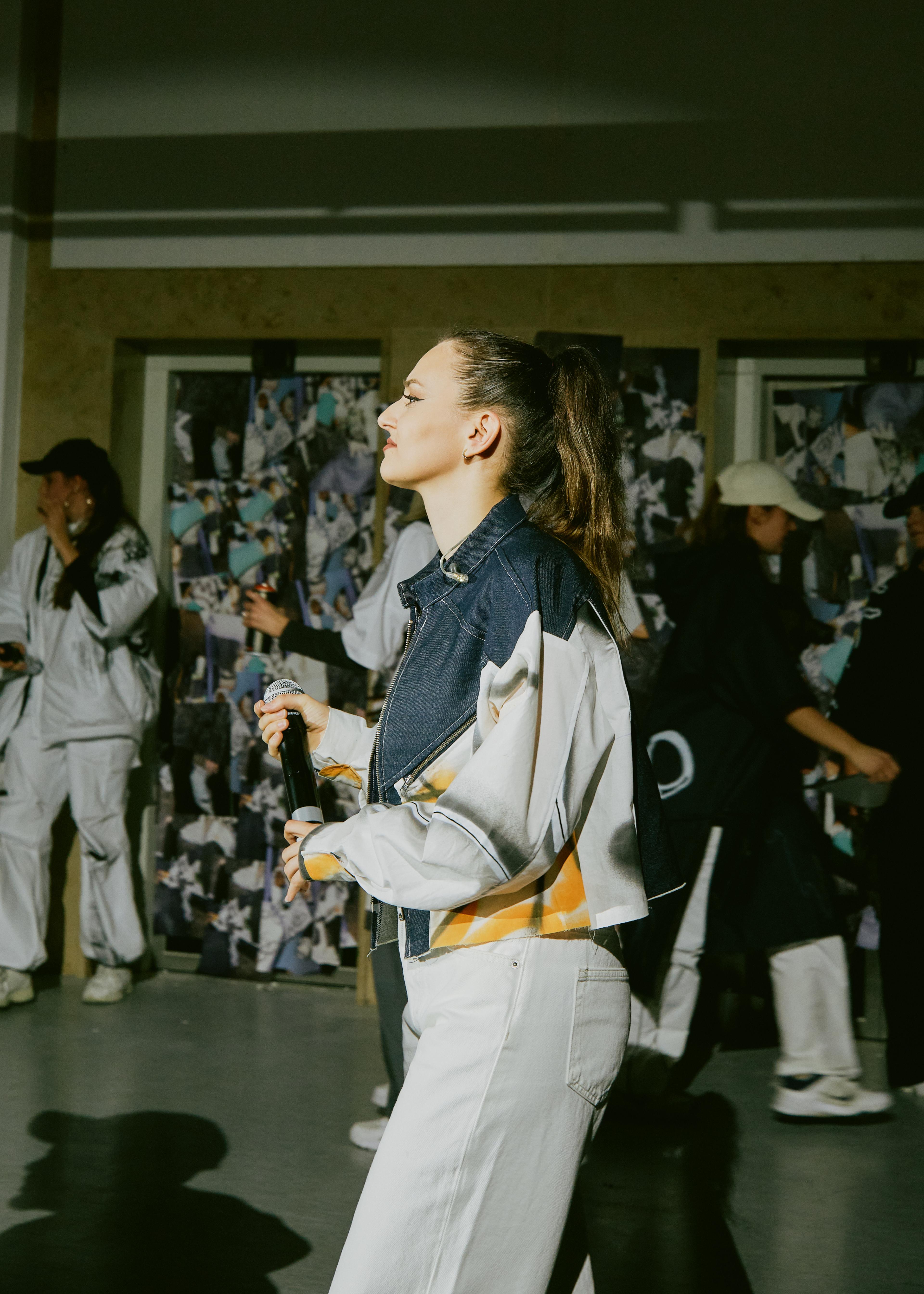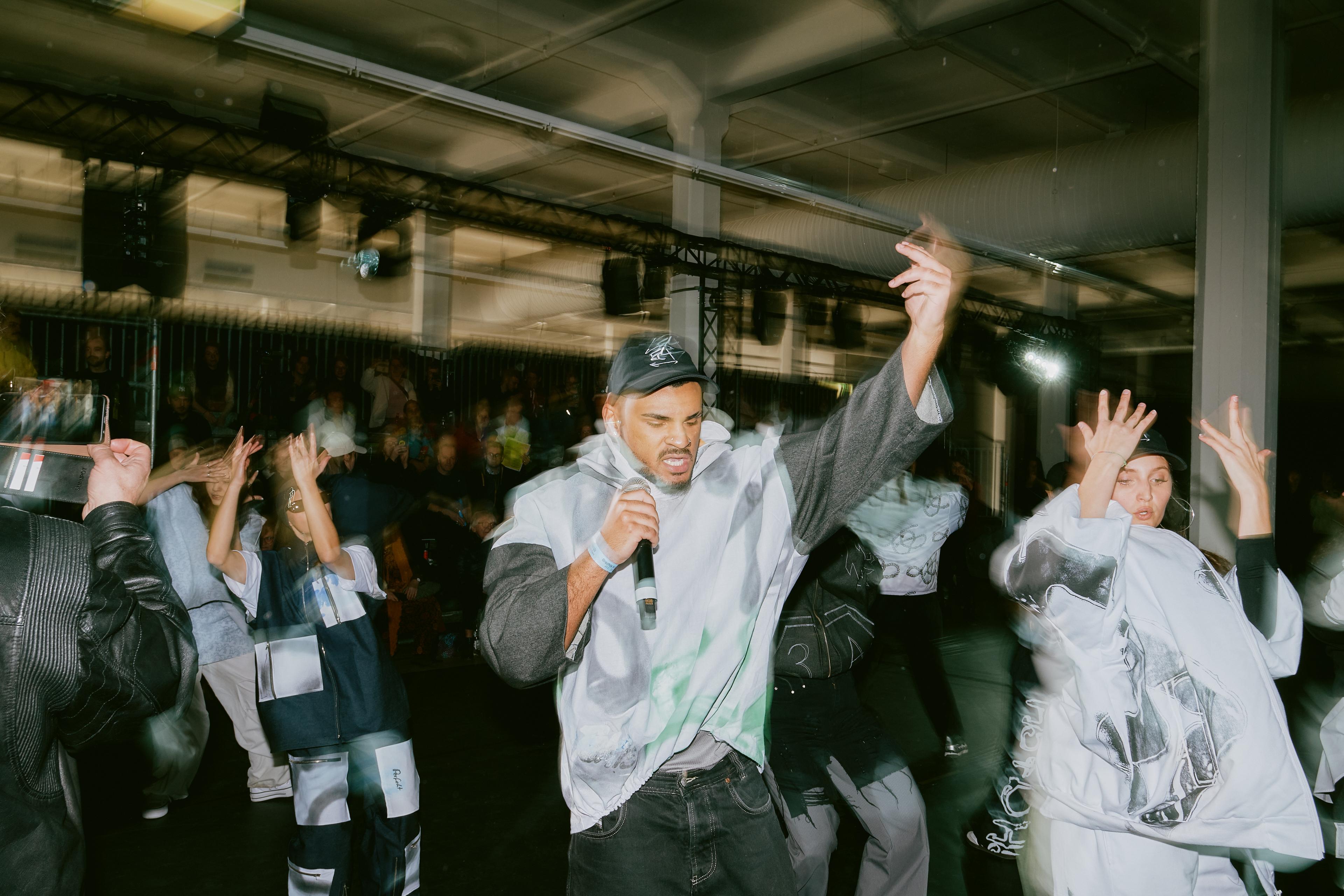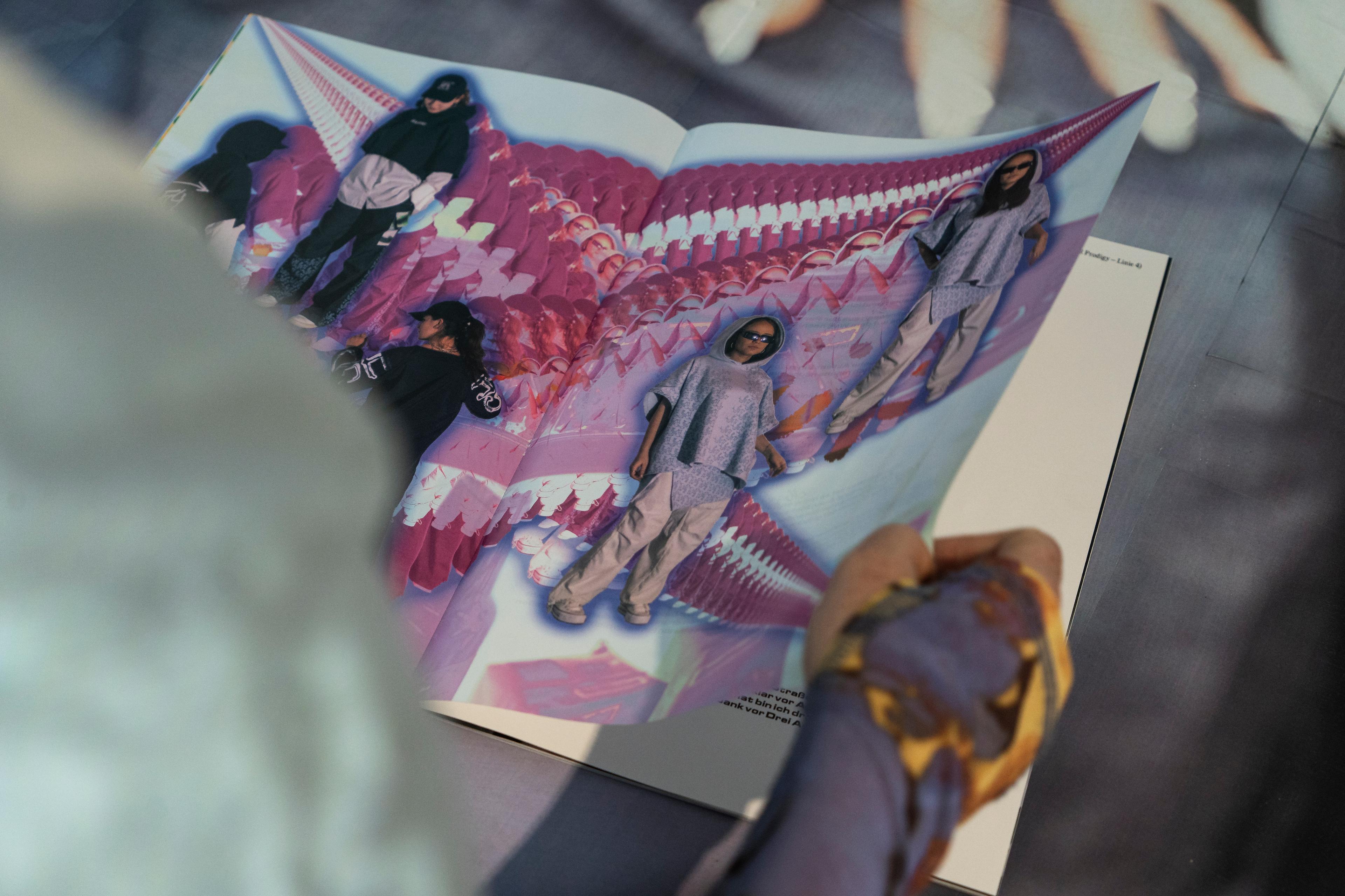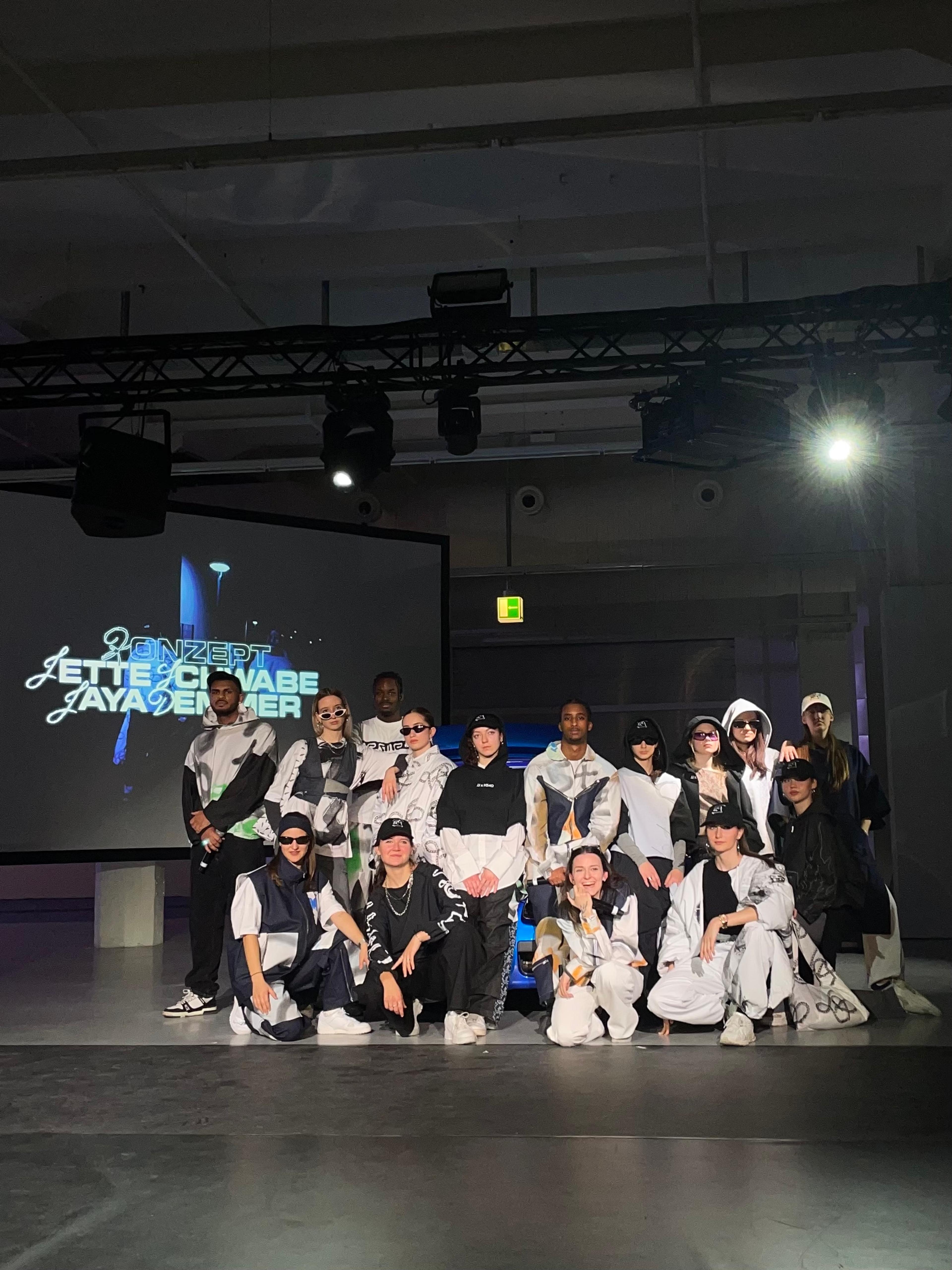 JJxH54D Spring Collection 2024 is a collaboration between JJ (Jaya Demmer and Jette Schwabe) and H54D (teenagers from Augsburg-Oberhausen) - it is a performative intervention, rap concert and fashion show, and was presented at the opening of the Brechtfestival 2024 in Brecht's Kraftklub. The performance brought together a number of young actors from the neighbourhood to take over the festival centre.