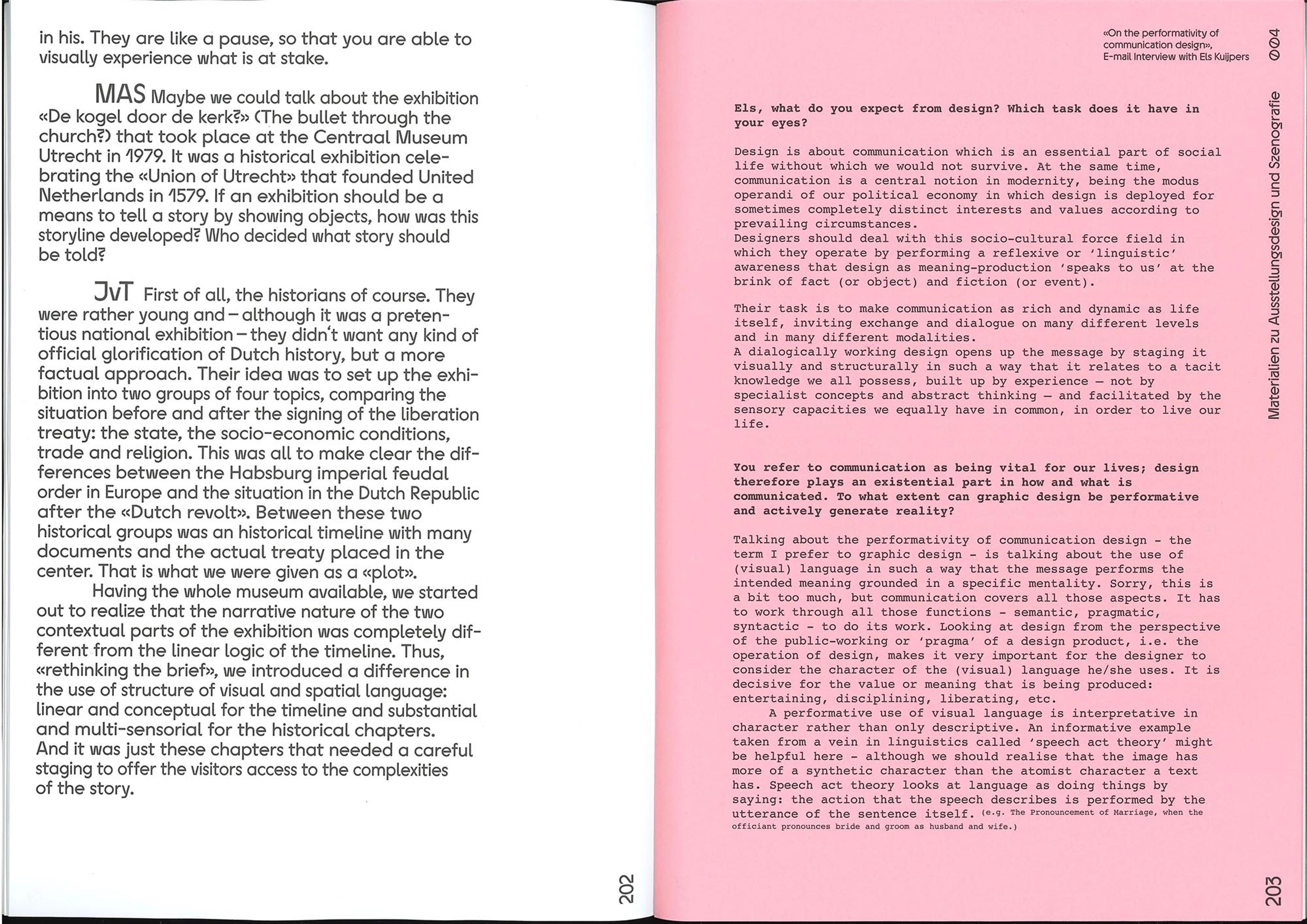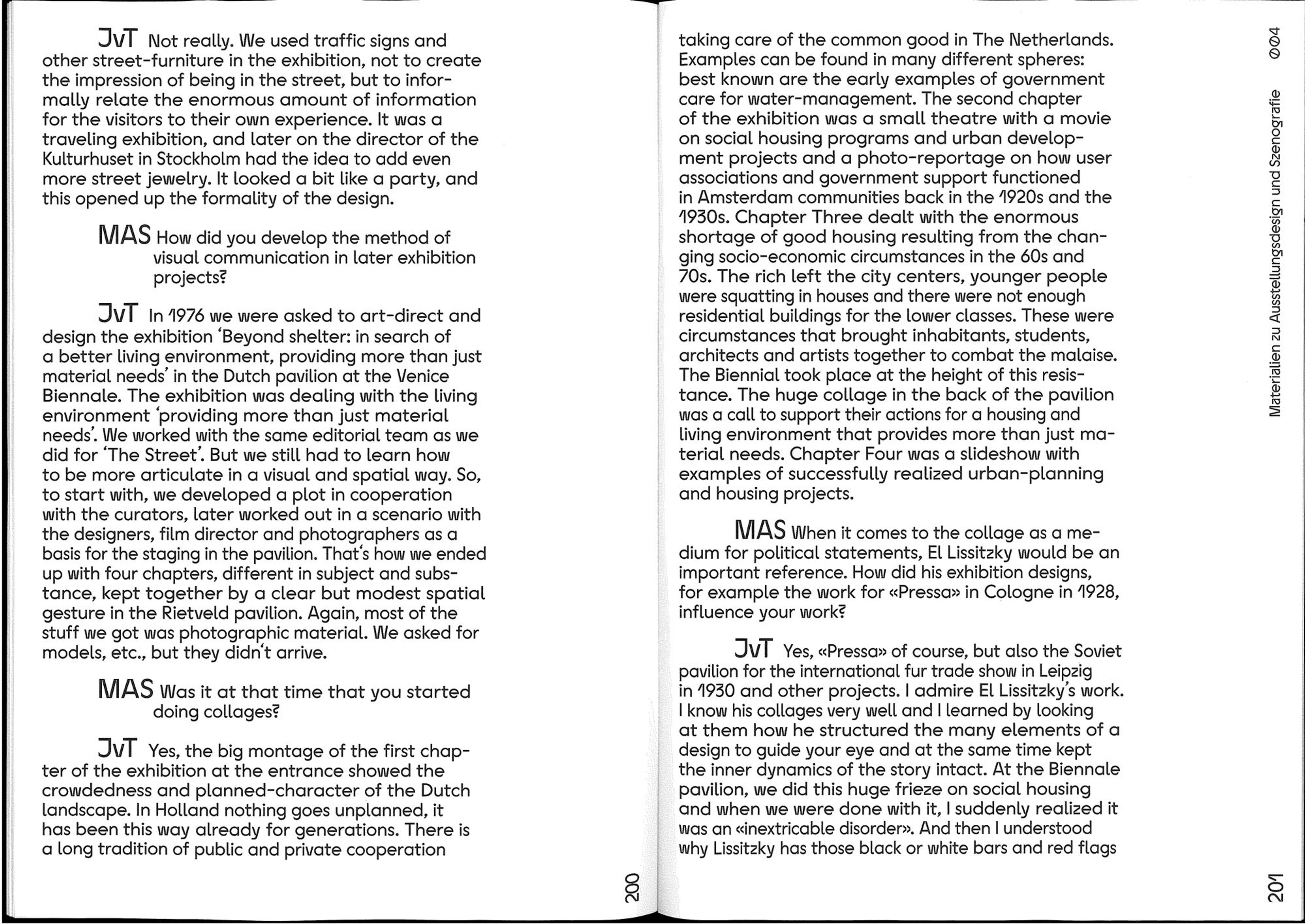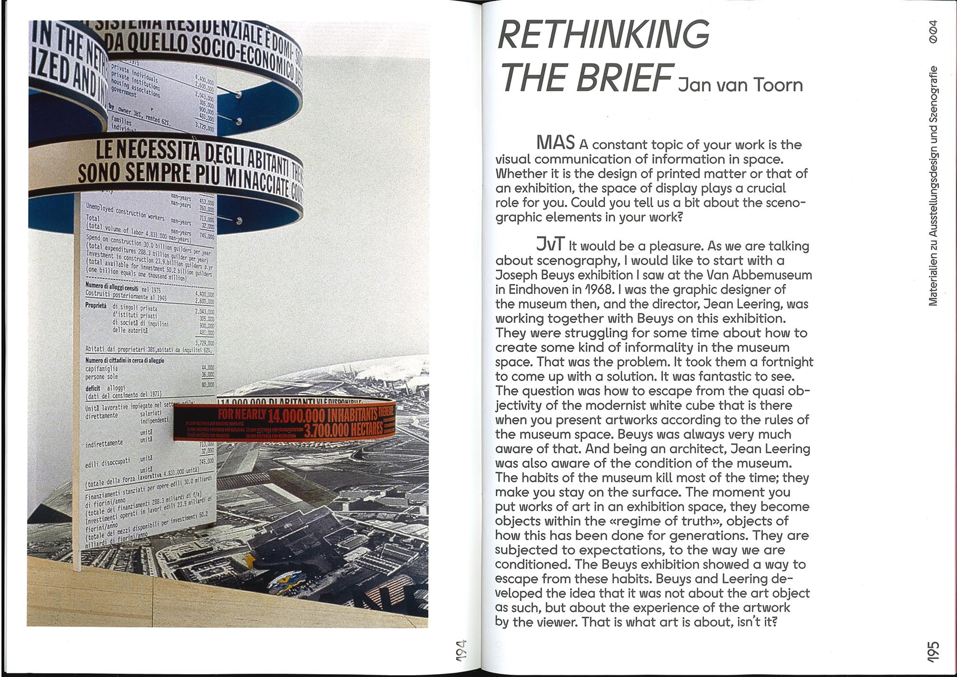 Die vierte Ausgabe von Materialien für Ausstellungsdesign und Szenografie, MAS 004, widmet sich den Ausstellungsgestaltungen des niederländischen Kommunikationsdesigners Jan van Toorn. Bereits seit den frühen 1970er Jahren ist er für die Gestaltung von Kalendern, Postern und Katalogen, von denen viele für das Van Abbemuseum in Eindhoven entstanden sind, international bekannt. Van Toorn betrachtet Objektivität und Neutralität als Illusion, vielmehr versteht er jede gestalterische Handlung als subjektiven Ausdruck. Diese Überzeugung führte Jan van Toorn dazu, den “dialogischen Charakter“ von Design herauszuarbeiten. Seine Gestaltungen öffnen unterschiedliche Bedeutungsmöglichkeiten und sollen zu einer kritischen, nicht eindeutigen, Rezeption aktivieren. Die Produktion und Reflektion dialogischer Formen von Design verbindet Jan van Toorns mit der Arbeit der Kunsthistorikerin und Designtheoretikerin Els Kuijpers. In ihrer Forschung beschäftigt sie sich damit, wie Sprache – visuell und schriftlich – Bedeutung in dynamischen sozialen Gefügen herstellt. Um Designtheorie und -praxis zusammenzuführen, “in thinking and making” wie sie sagen, untersuchen sie die Inszenierung von Botschaften und haben daraus eine spzielle editoriale Gestaltungs- methode entwickelt.