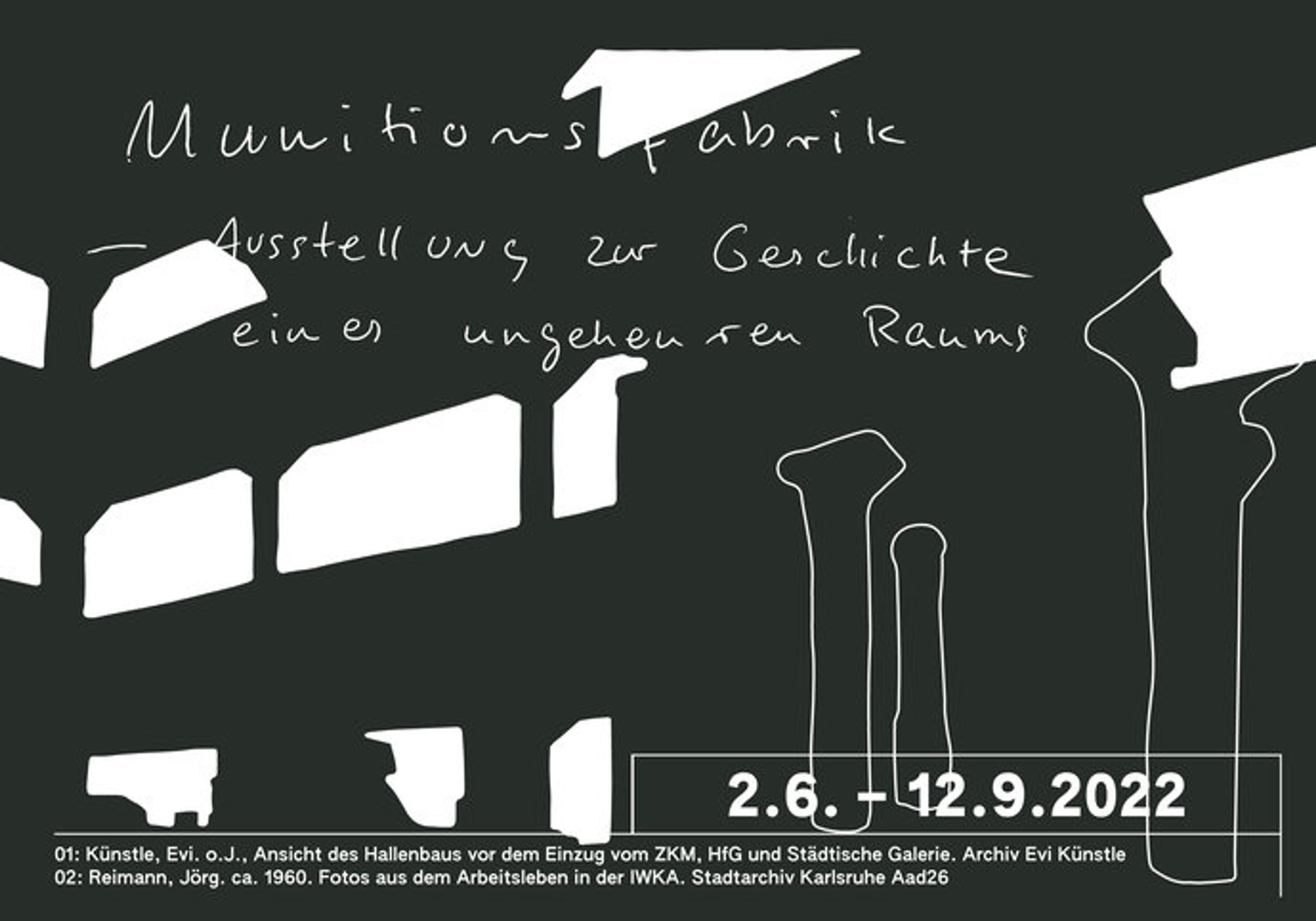 Recherchematerialien aus verschiedenen Archiven, wie dem Stadtarchiv Karlsruhe, dem Generallandesarchiv Karlsruhe und diversen Bildarchiven zeichnen die Geschichte dieses „ungeheuren Raums“ nach. Künstlerische und dokumentarische Projekte von Studierenden, Alumni und (ehemaligen) Professor:innen der Staatlichen Hochschule für Gestaltung repräsentieren kritische Auseinandersetzungen mit dem Ort und seiner heterogenen und kontroversen Geschichte. Die Ausstellung entsteht im Rahmen des 30-jährigen Jubiläums der HfG Karlsruhe und es wird begleitend dazu eine Publikation in der Reihe „Munitionsfabrik“ erscheinen.