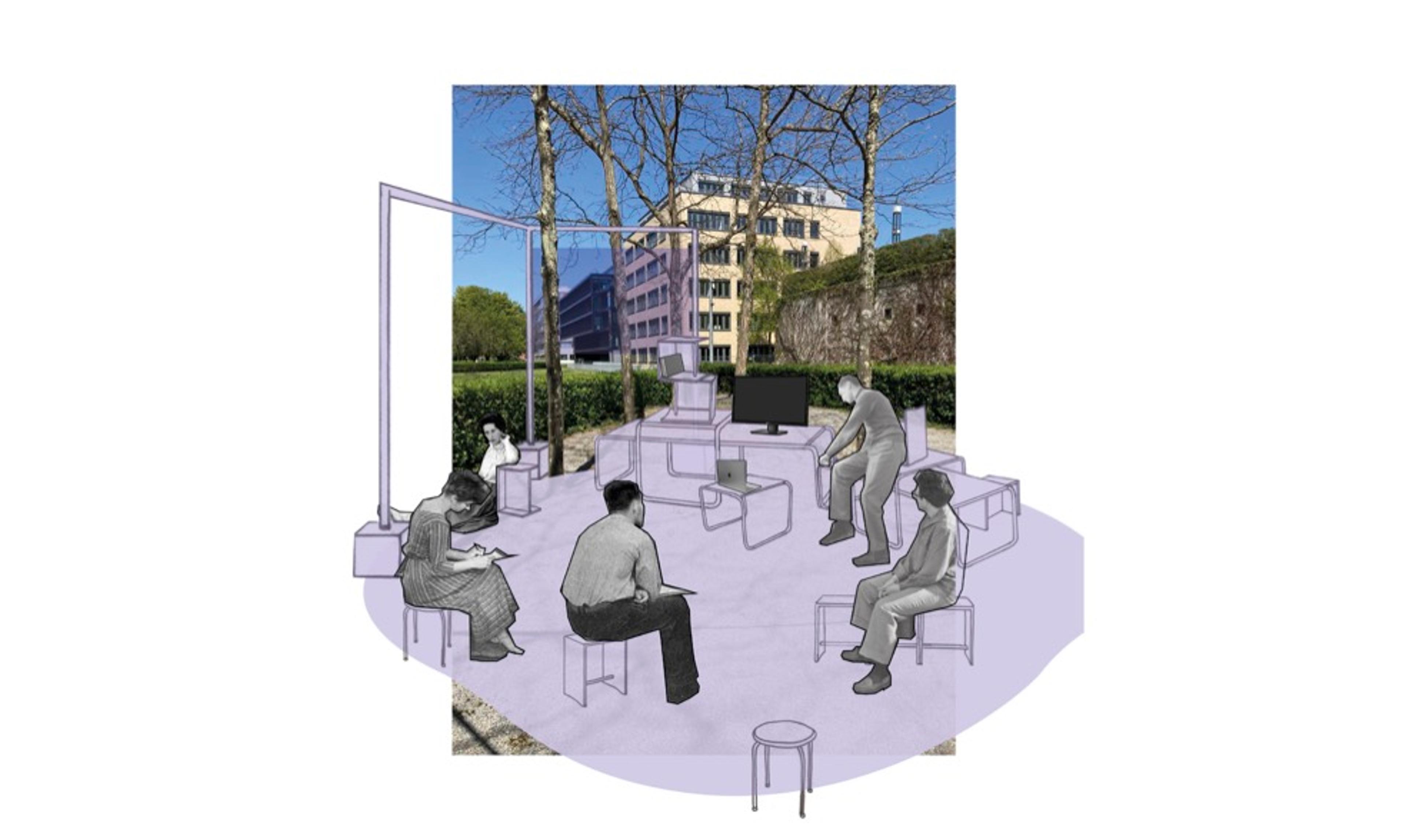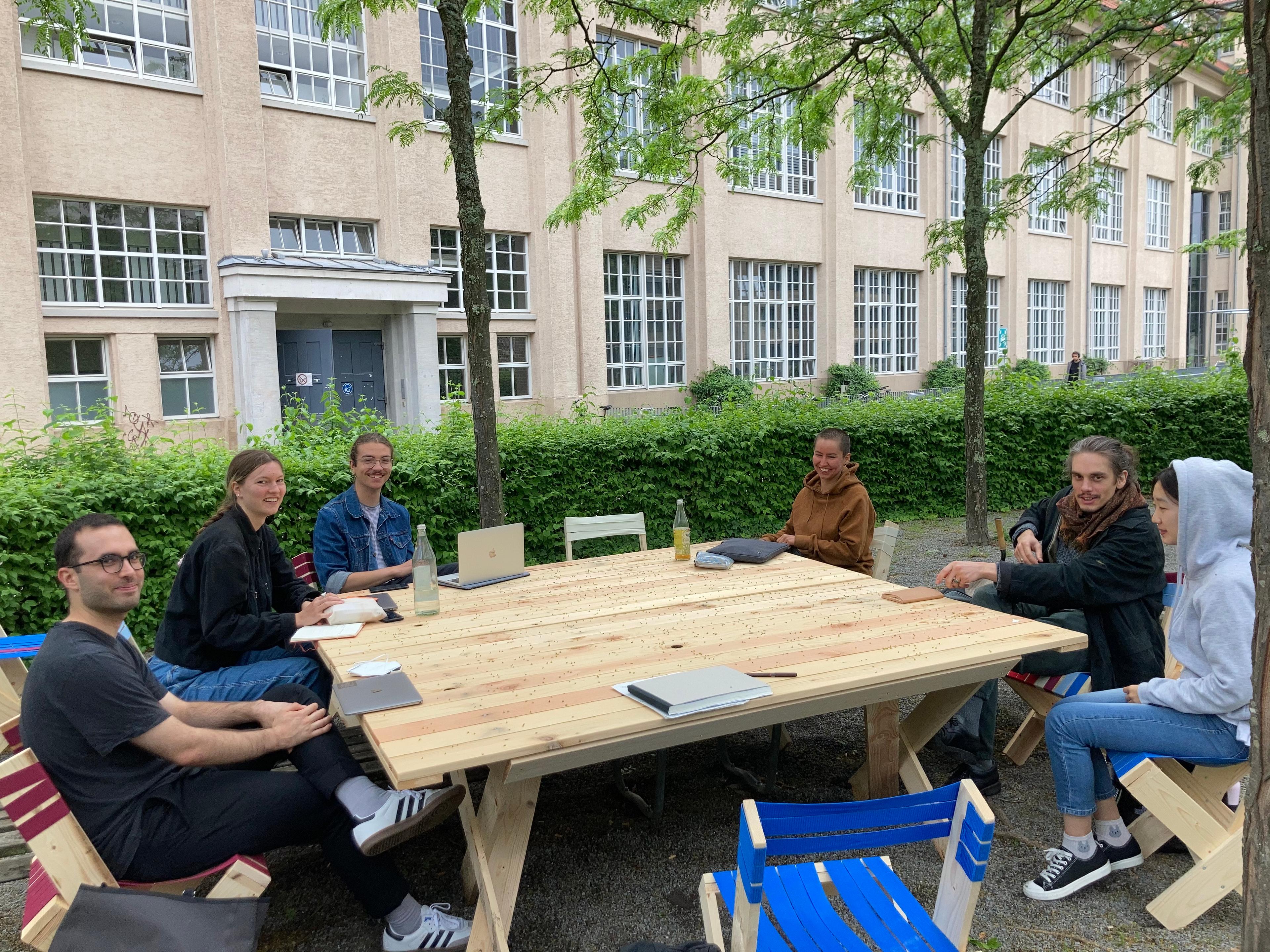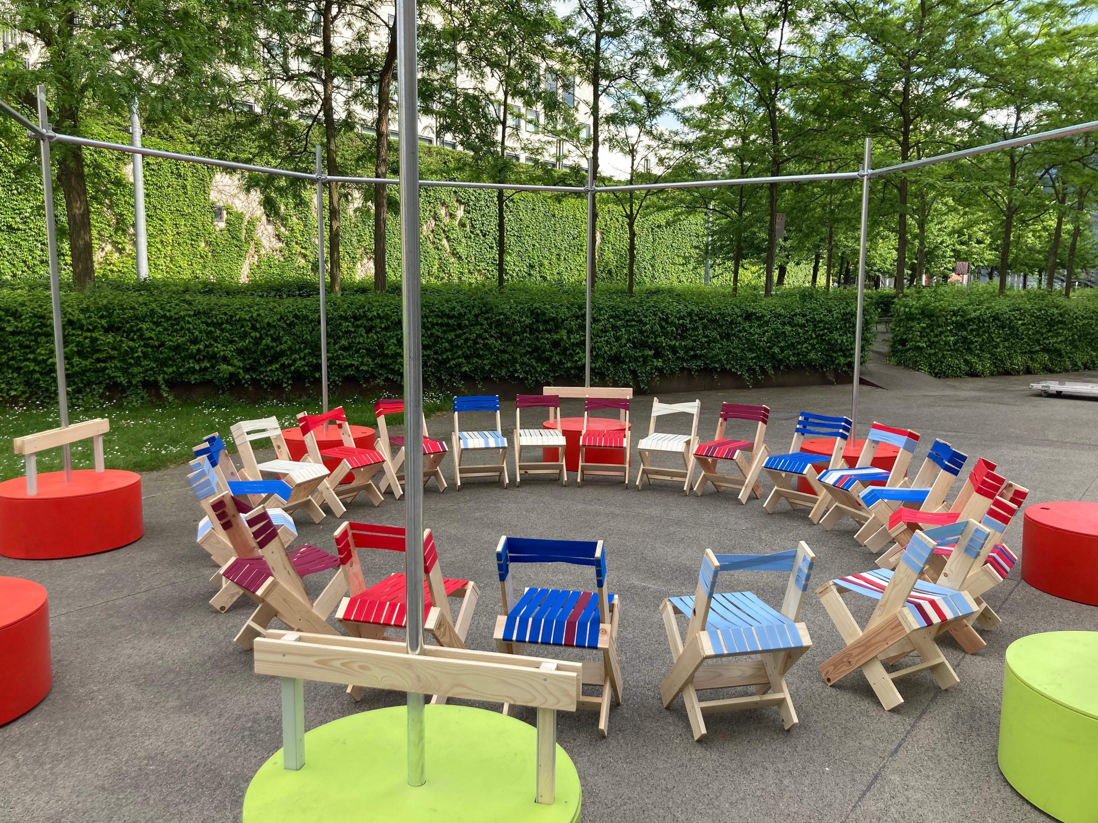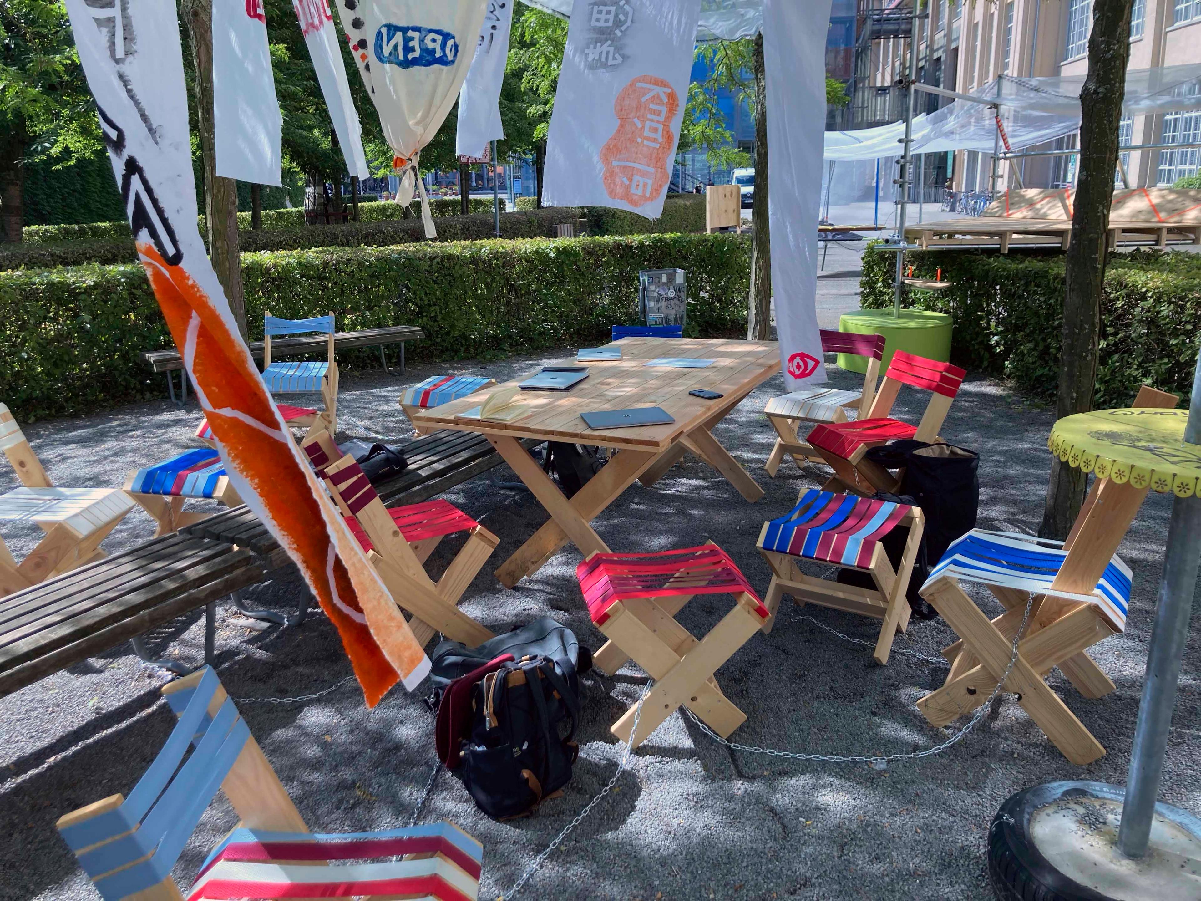 Due to the pandemic situation, collaboration and exchanges between teachers and students in the HfG workshops and studios were severely restricted for two semesters. This gave rise to the idea of the Open Campus - to create a place for the HfG in the fresh air that enables people to work, learn and meet. The Platz der Menschenrechte was chosen as the location.