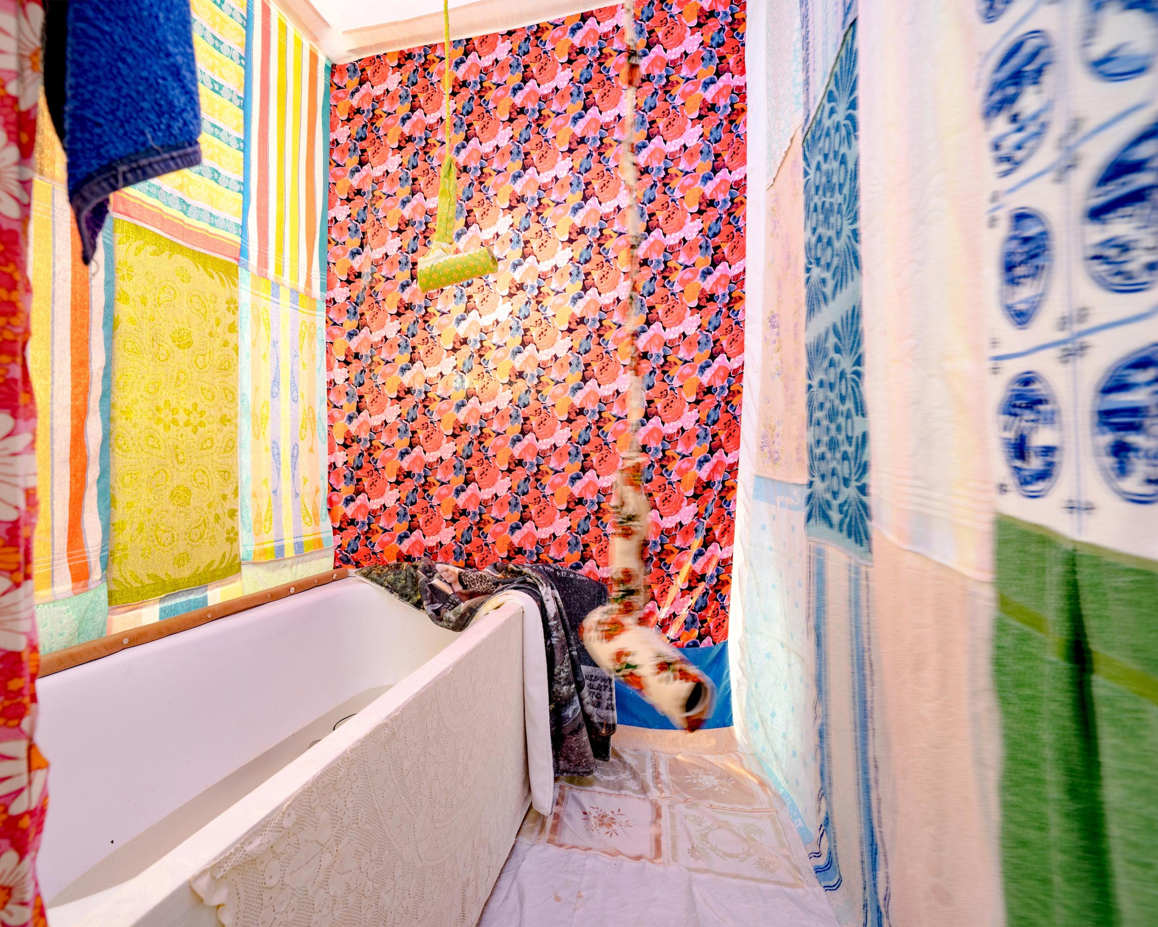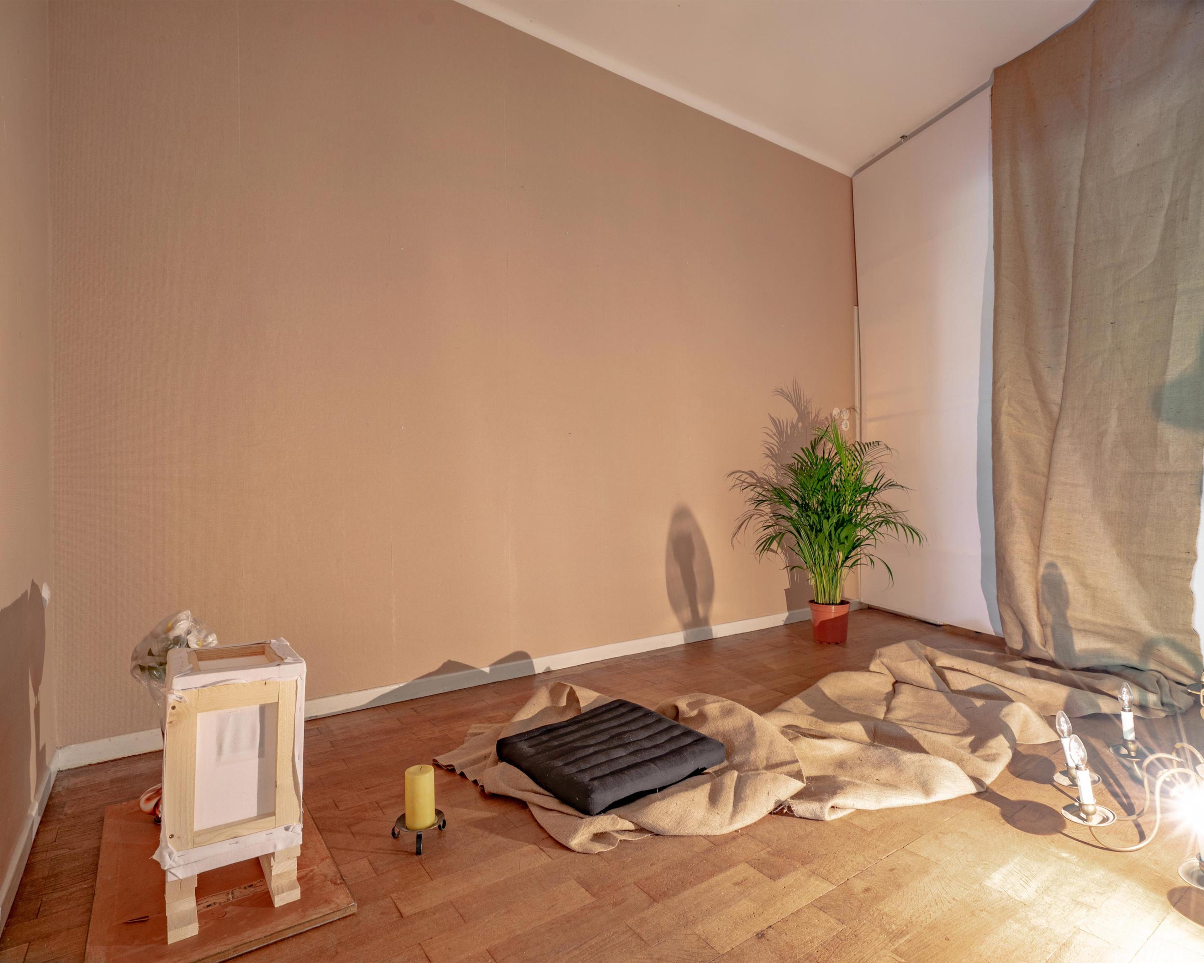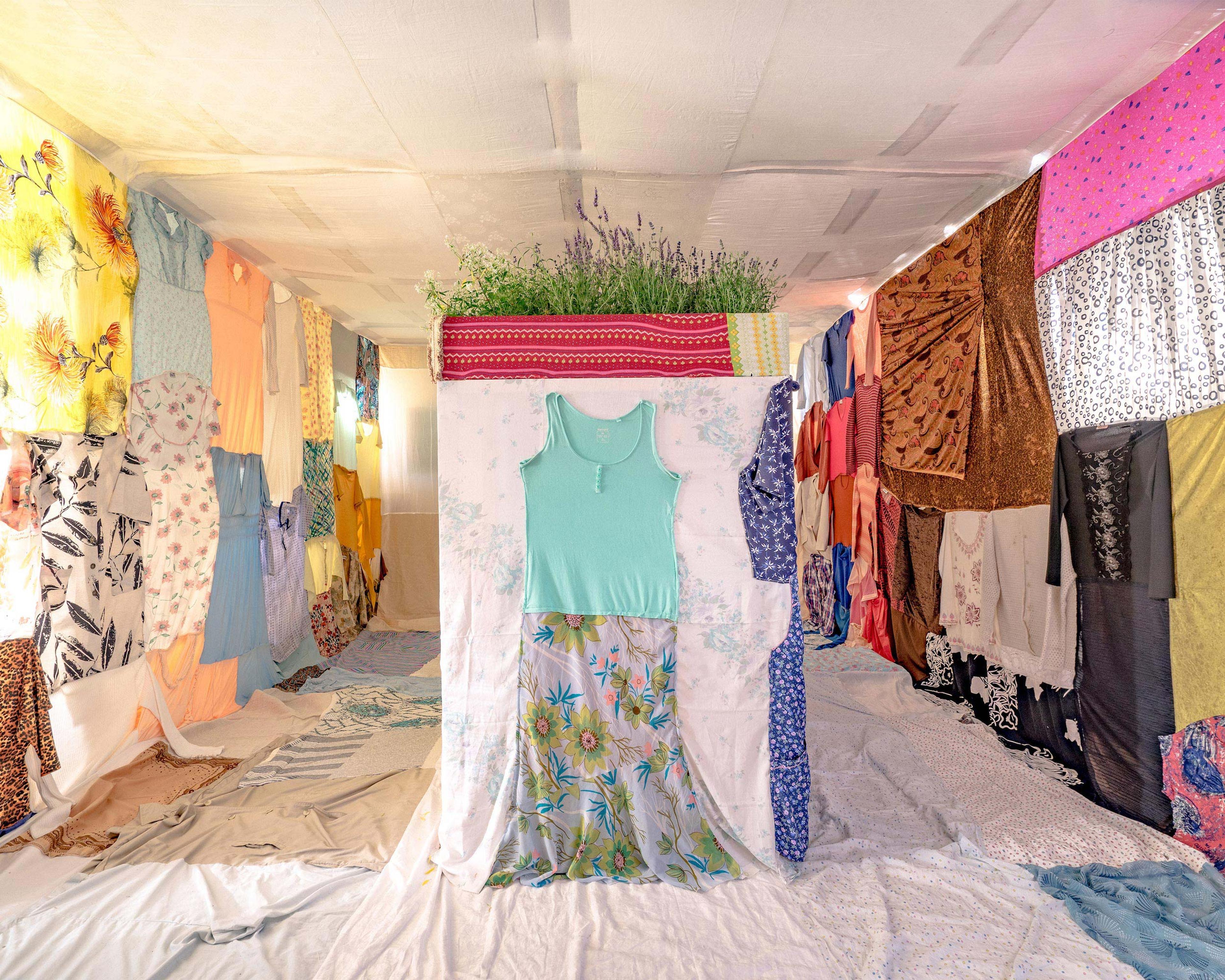 Als ich die Installation betrete, habe ich im Nacken, die Vorstellung ebenjener Person und so mein ich dann manchmal mich umdrehen zu müssen, obwohl ich weiß, dass ich allein in der Stoffwohnung bin. Ich geh ins Wohn-/Schlafzimmer, dort steht, zentral, ein Bett, ein Sarg, eine Totenaufbahrung, in die man sich legen kann, oder soll, oder man soll sich zumindest fragen ob man sich hineinlegen soll oder eben nicht. Oben drauf ist Lavendel gepflanzt, Stoffe, Motten, Lavendel, und als ich mich hinlege gehen drinnen im Sarkophag hinter Stoff verkleidete Leuchtstoffröhren an, sie klicken und brummen, und ich erschrecke mich zu Tode. Ein bisschen ist das jetzt wie auf dem Seziertisch zu liegen, aber es ist auch nicht so unangenehm, dass ich sofort wieder gehen möchte. Beobachtet komme ich mir noch immer vor, so, als ob ich durch die von außen beleuchteten dünnen Stoffwände von dem Künstler, also Felix Buchholz, vielleicht beobachtet werden würde.