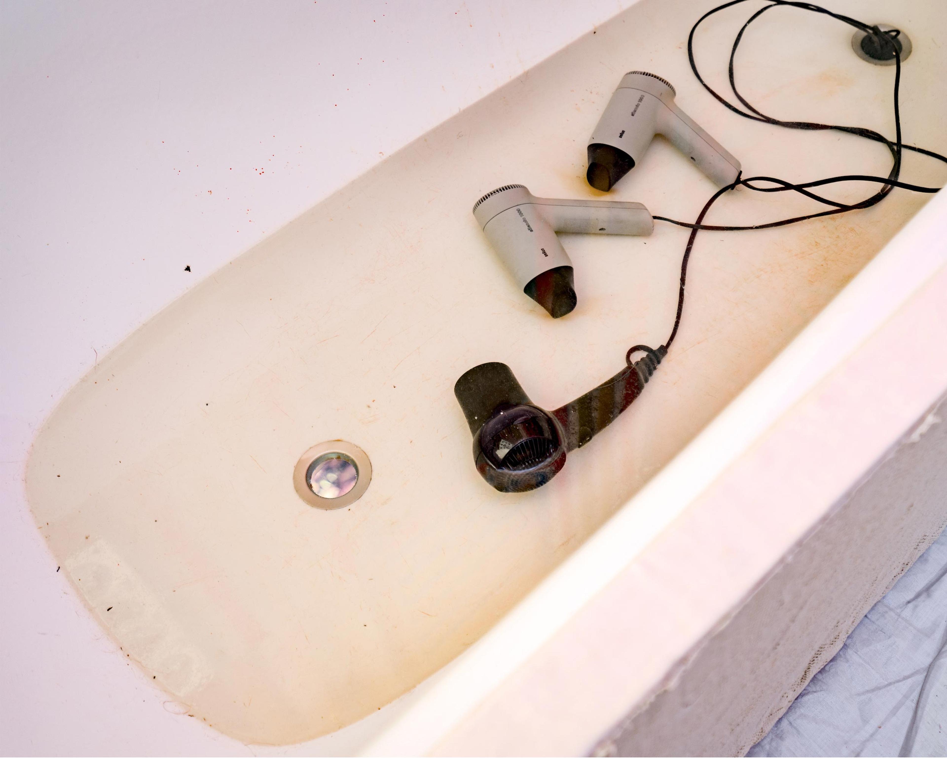 Deutungshoheit zu haben ist ein genuin künstlerisches Moment, nur, je mehr eine Geschichte den Anspruch auf eine individuelle Erfahrung, oder Authentizität hat, desto schleichender kommt die Einsicht, dass mit dem angenommenen Tod seiner Großmutter Felix in jeglichen Sinne zu ihrem Alleinerben geworden ist, zur Deutungshoheit auch über ihr Leben, und so zelebriert er hier eine zweite Totenwache. Im Bad geht ein Fön an, ich denke, aha, es ist doch jemand zweites hier, vorher erschrecke ich zu Tode durch das Geräusch, das mich aus meiner arglosen Haltung, der kontemplativen Situation reist. Ich schleiche mich ins Bad, wo einige Föns von der Decke hängen, die jetzt wild im Raum hin- und herschlackern, vom Rückstoß des Föndrucks, der aus dem Nichts gekommen sein muss. Im Flur, der auch, weiß ich, hat er mir erzählt, als Küche genutzt wurde, gibt es ein kleines Stoffloch, eine Höhle für den Kopf in der Wand, eine Aufforderung sich auf den Rücken zu legen und das darin laufende Video über sich anzusehen, von der originalen, nur leergeräumten Wohnung, während Felix die Wohnung beschreibt. Während ich da liege und meine Füße, abgetrennt von meinem Kopf aufgestellt in dem Flur seiner verstorbenen Großmutter liegen, denke ich, wenn sie das sehen könnte, das wäre eine sehr schöne One Minute Sculpture. Also, ich werde das Gefühl nicht los, man beobachtet mich.