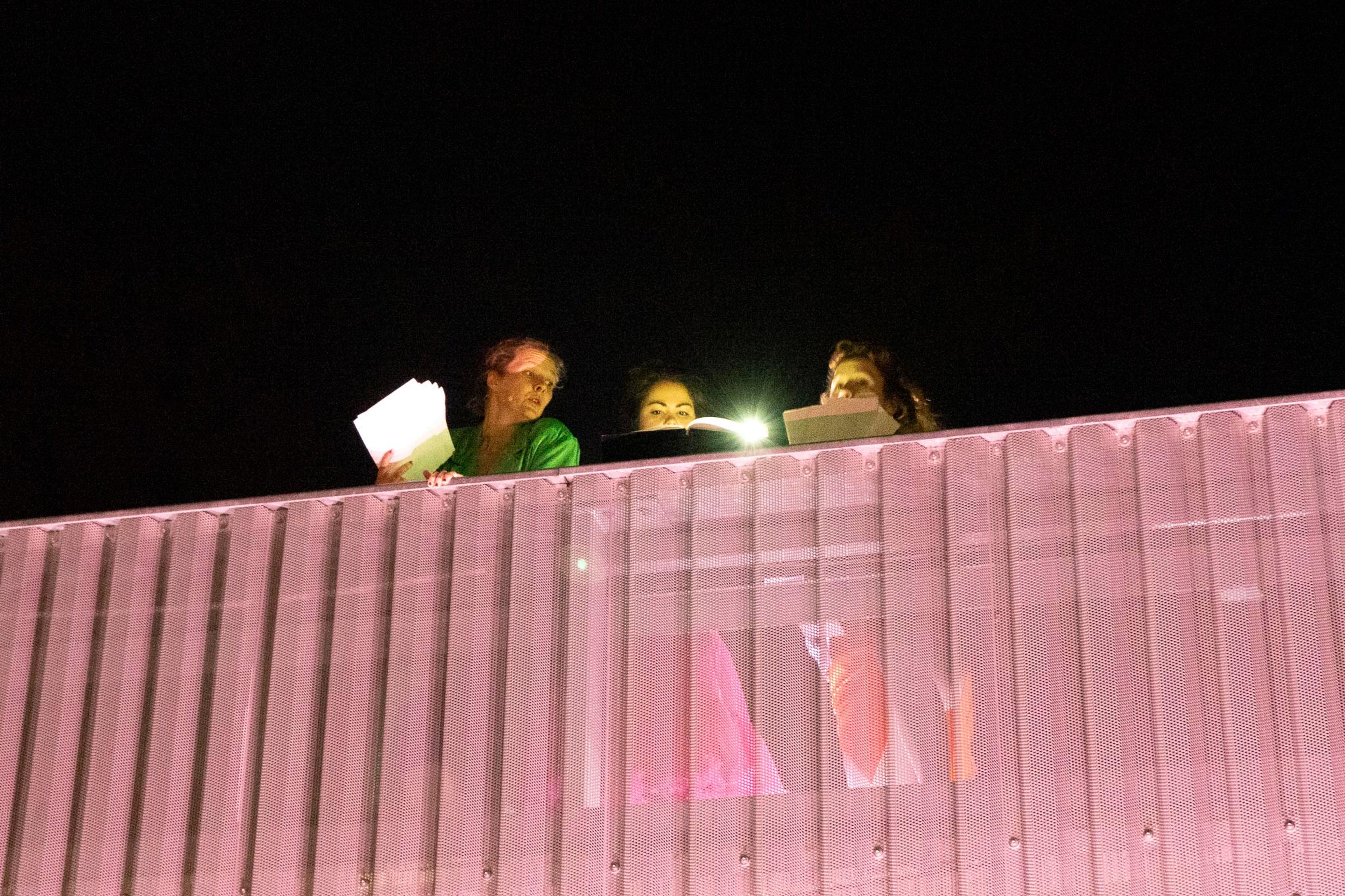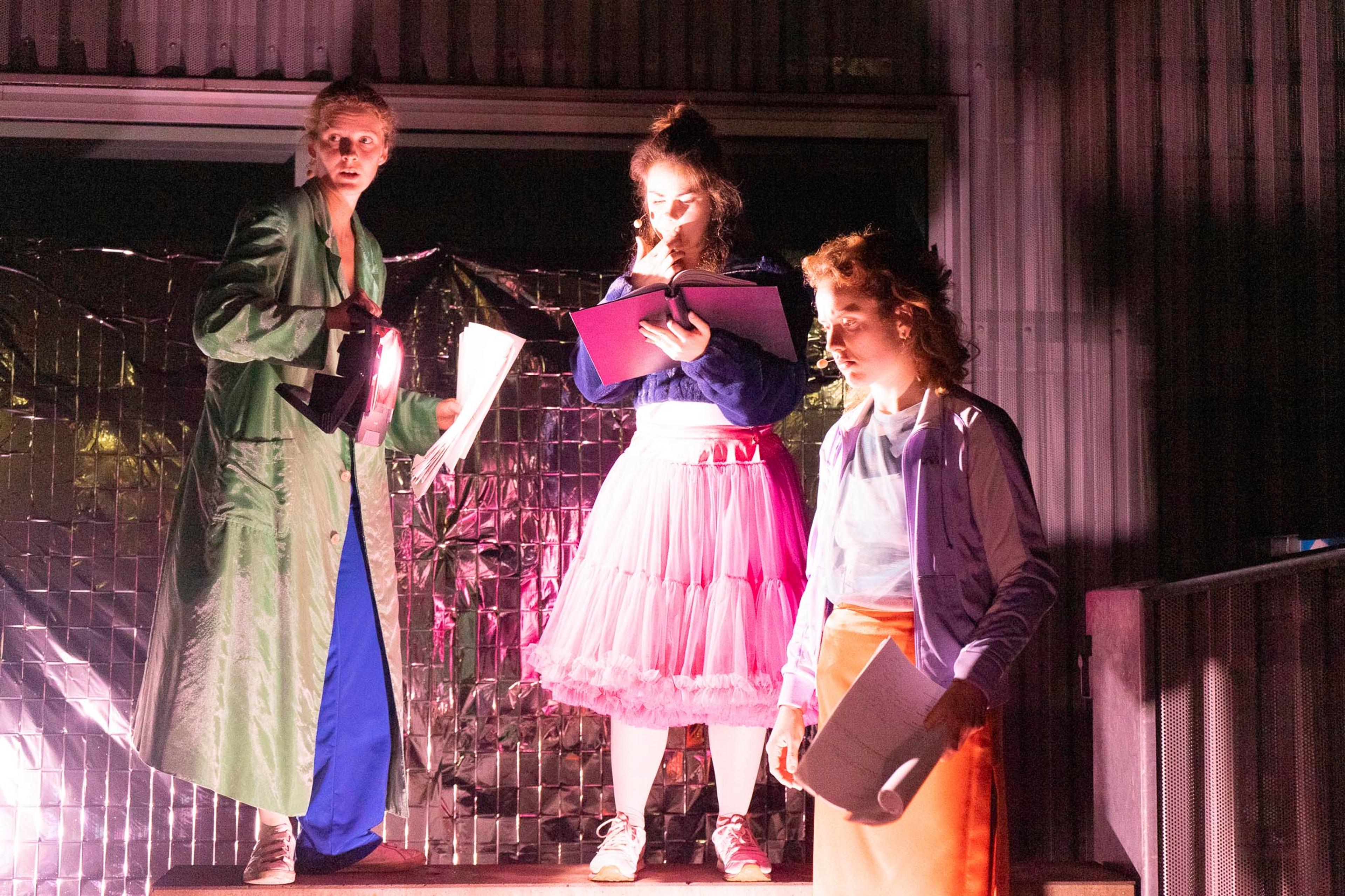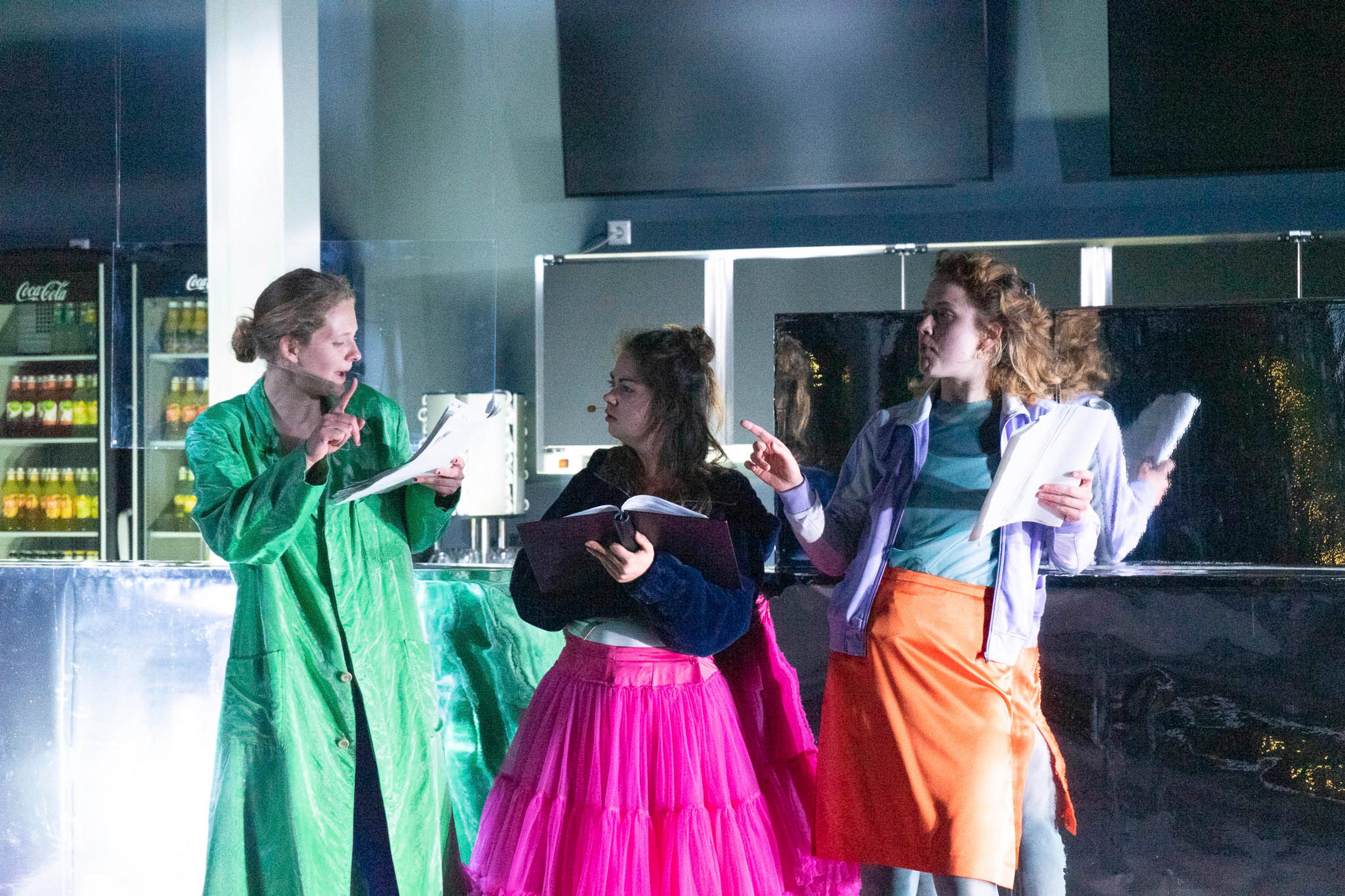 The play "Tragödienbastard" by Ewe Benbenek was technically and artistically developed by students in the winter semester 2021/2022 as part of the seminar 'Das neue Stück' and transformed into an almost 2-hour staged reading. The project was supervised by Constanze Fischbeck, Anna Haas and Eivind Haugland as well as Sandra Blatterer, who gave exciting impulses for the development of the lighting and stage concept in a one-week lighting workshop.